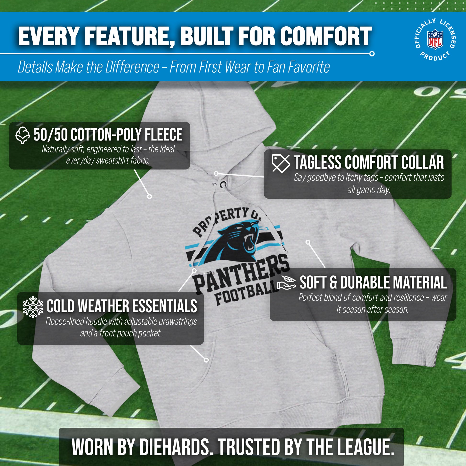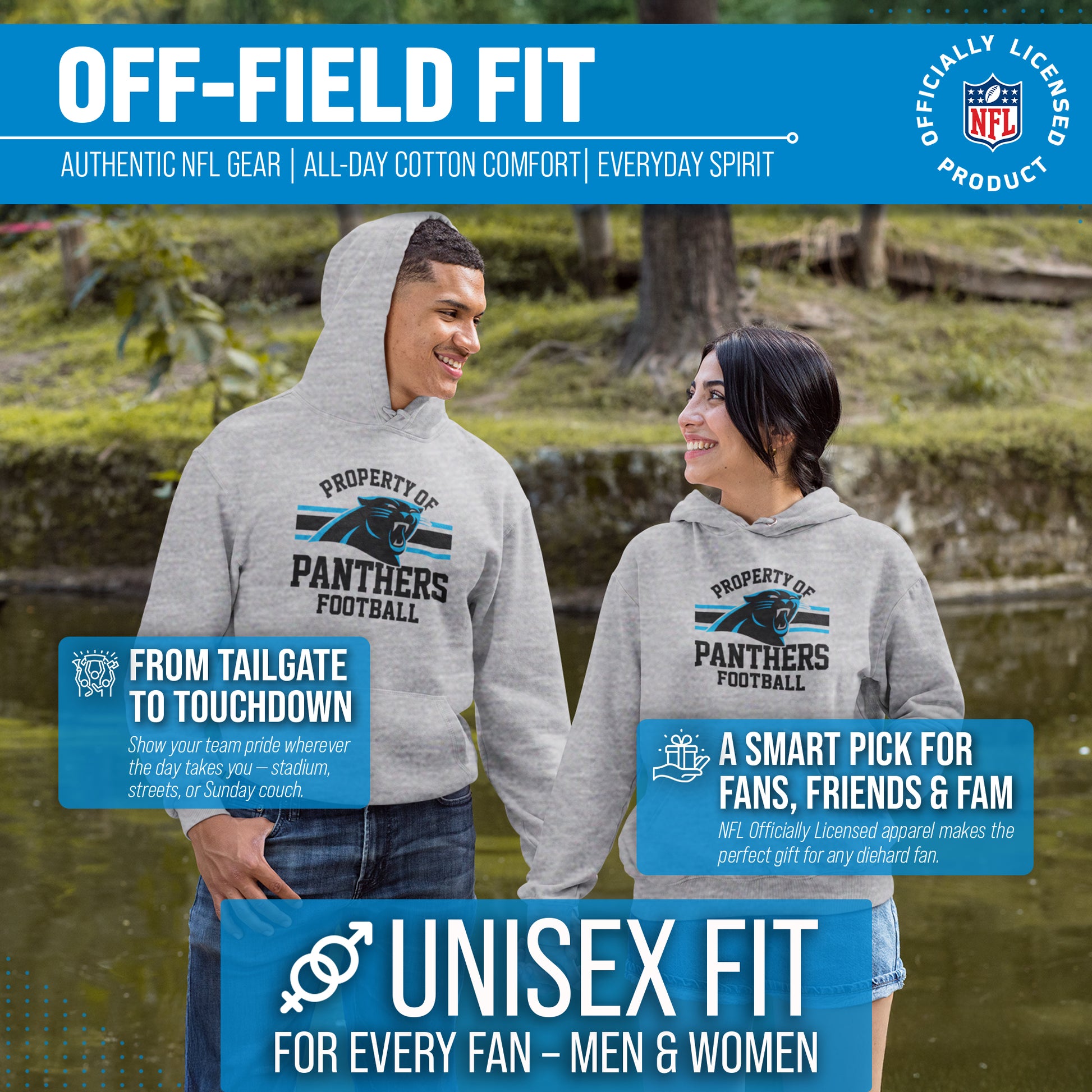 Our Property of Carolina Panthers hooded sweatshirt is a pro football hoodie with 8.5 oz fleece lining that features official Property of graphics. Our hoodies for men and women are super comfortable, run true to size, and are great for showing your Panthers pride all year long. The tagless Carolina hooded sweatshirt is perfect for tailgates, gamedays, and showing off your team spirit. Our pullover hoodies are ideal Carolina gifts for men and women football fans and the unisex fit makes them ideal for both men and women. The Carolina hoodie is essential apparel for protecting yourself from the elements. The fleece material, ribbed cuffs, and waistband keep all the warmth in, so there's no need for a jacket in the fall months, our hoodie sweatshirts have you covered. These comfortable hoodies feature the official Carolina Panthers colors and graphics. The graphics will stay crisp and wear after wear and year after year. This pro football sweatshirt is designed for comfort. The pro football hooded sweatshirt features ribbed cuffs and waistband, jersey lined hood with metal eyelets, adjustable drawstrings, and a spacious front pouch pocket. Show your team pride with this Property of Panthers sweatshirt! This hoodie is pre-shrunk and made from a dual blend of cotton poly fleece that is ideal for that tailgate or gameday when the temperature drops. The football sweatshirts for women and men help you gear up and get ready to cheer the Carolina Panthers to victory.