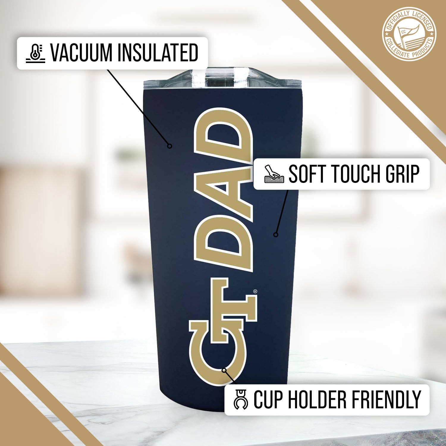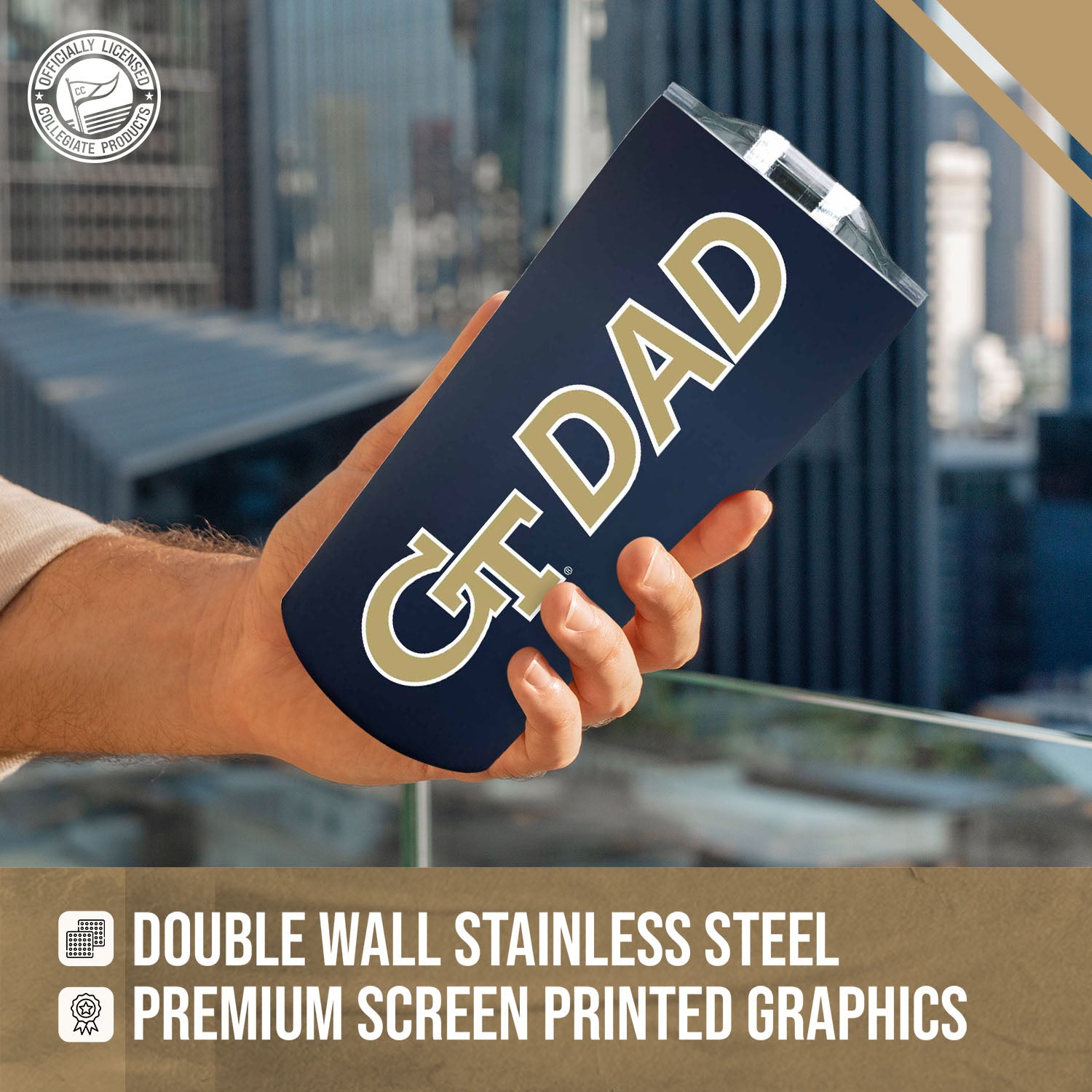 Our stainless steel tumbler mugs for dad are designed for constant use in any type of setting! At a sports game? These insulated tumblers are compact and can fit in most cup holders. On the move? Our contoured spout makes it easy to sip on the go! Your tumbler is there to compliment your Georgia Tech sweatshirt when you need to stay warm and there when you're looking for an ice-cold refreshment. No matter the setting, show your school and dad pride while properly and efficiently preserving the desired temperature of your beverage! This Georgia Tech Yellowjackets DAD travel mug also makes a great gift if you're looking to give your dad, step dad, or father figure in your life a present! All of our products feature the official team colors, logos and lettering. We don't skimp on quality in any way. The colors are always vibrant and the graphics are always accurate and brimming with team spirit. Let everyone know you're a cool dad and get this dad tumbler today!