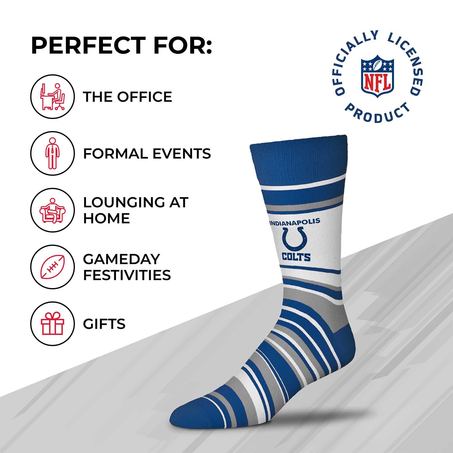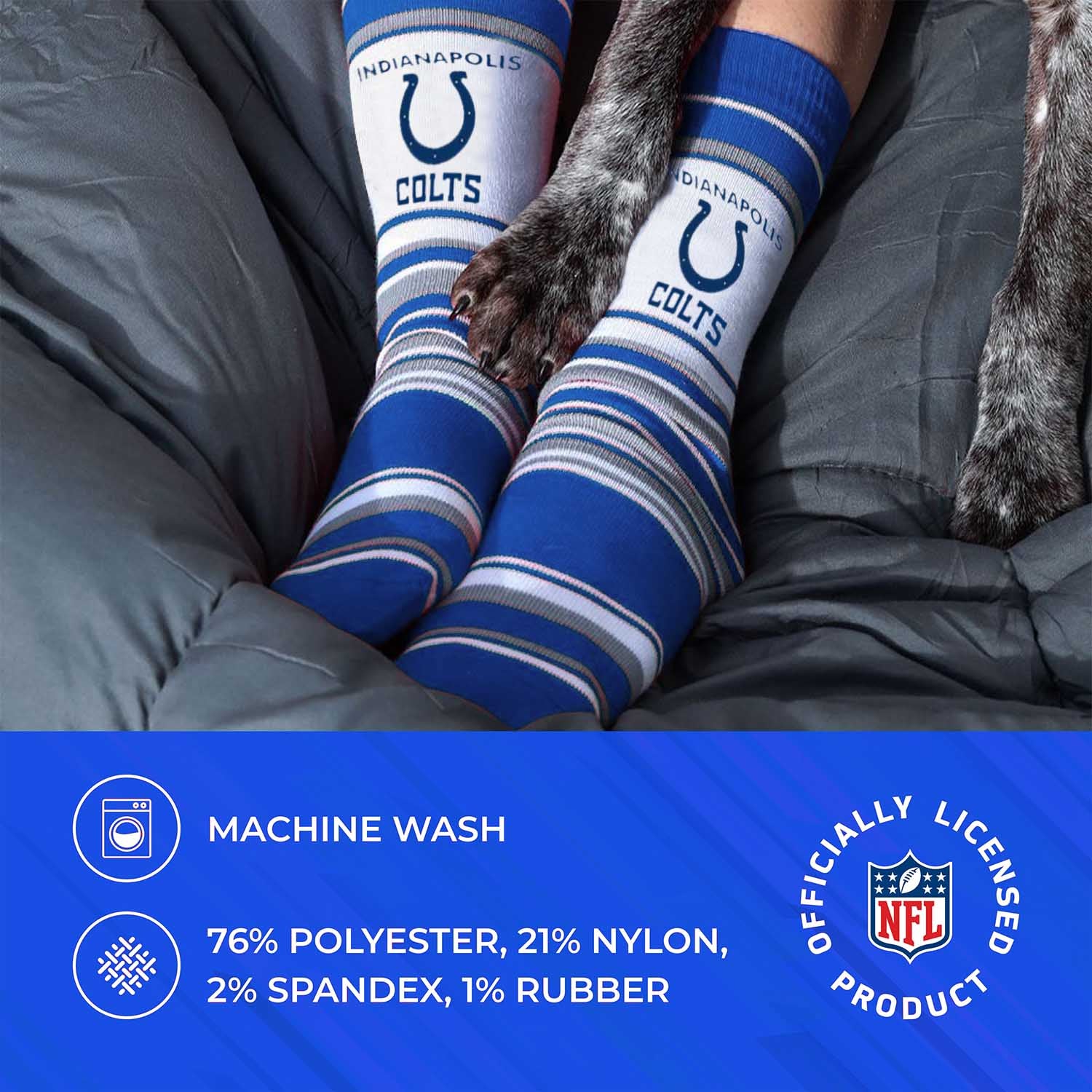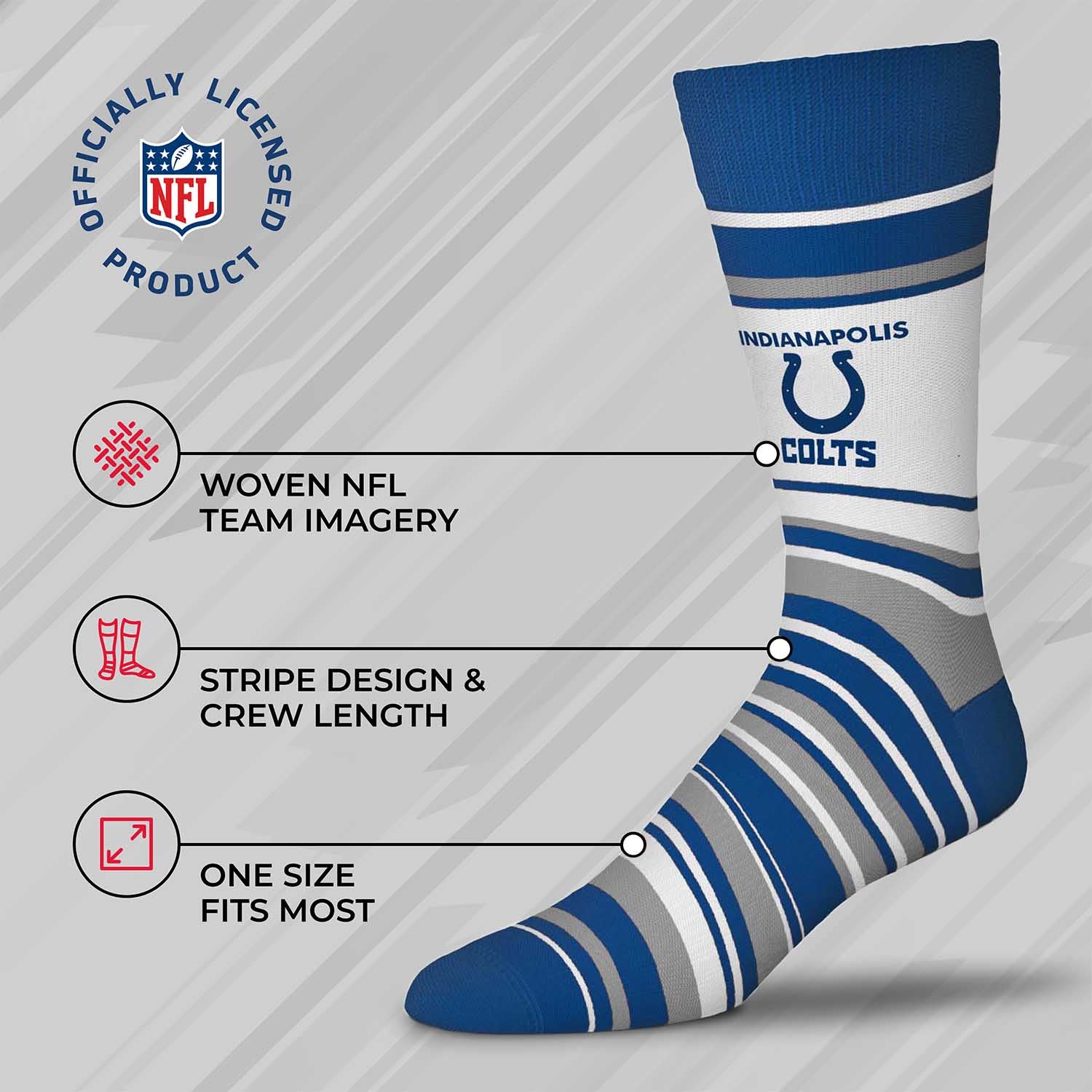 These dress striped Indianapolis socks are great for showing off your Indianapolis pride at formal events. The Indianapolis dress socks are comfortable and fit most feet. The crew length and acrylic fabric blend feature a flashy striped pattern make them a comfortable choice for showcasing your love for your team all year long. Indianapolis Colts youth socks and adult socks are great additions to a collection of Indianapolis Colts stuff. Wear them with shorts, your favorite jersey, and Indianapolis Colts shoes for weekend look, or rock them in the office for an alternative to typical striped. On a lazy day, wear them with your underwear or pajamas and slippers while you put your feet up and enjoy a game in the house. Striped dress Indianapolis socks for women and men make great gifts for all ages, combine them with boxers and Indianapolis Colts slippers for a perfect father's day gift or holiday stocking stuffers. The officially-licensed team logo, colors, and graphic make these socks the Indianapolis Colts striped socks everyone will love. Fabric content is 76% acrylic, 21% nylon, 2% spandex, and 1% rubber. Machine wash, tumble dry low.