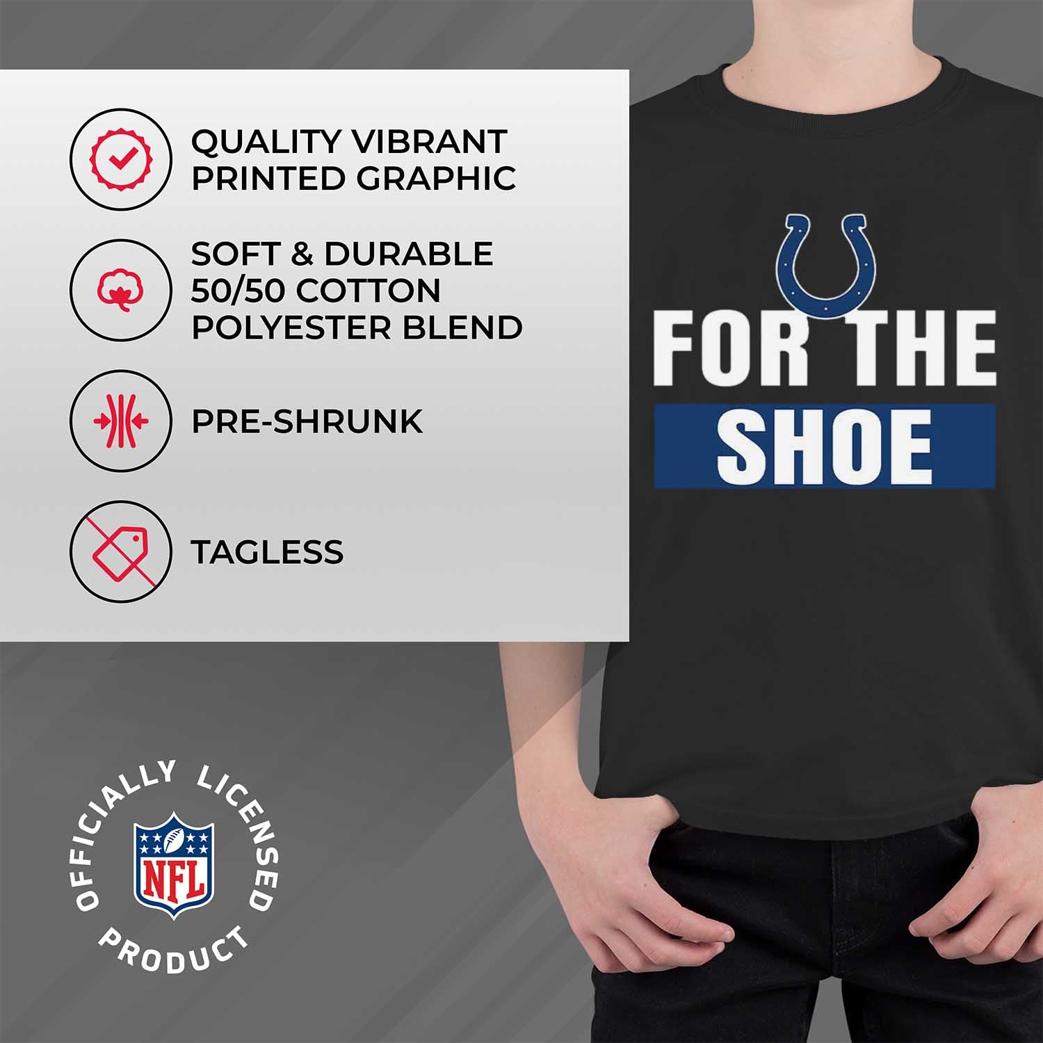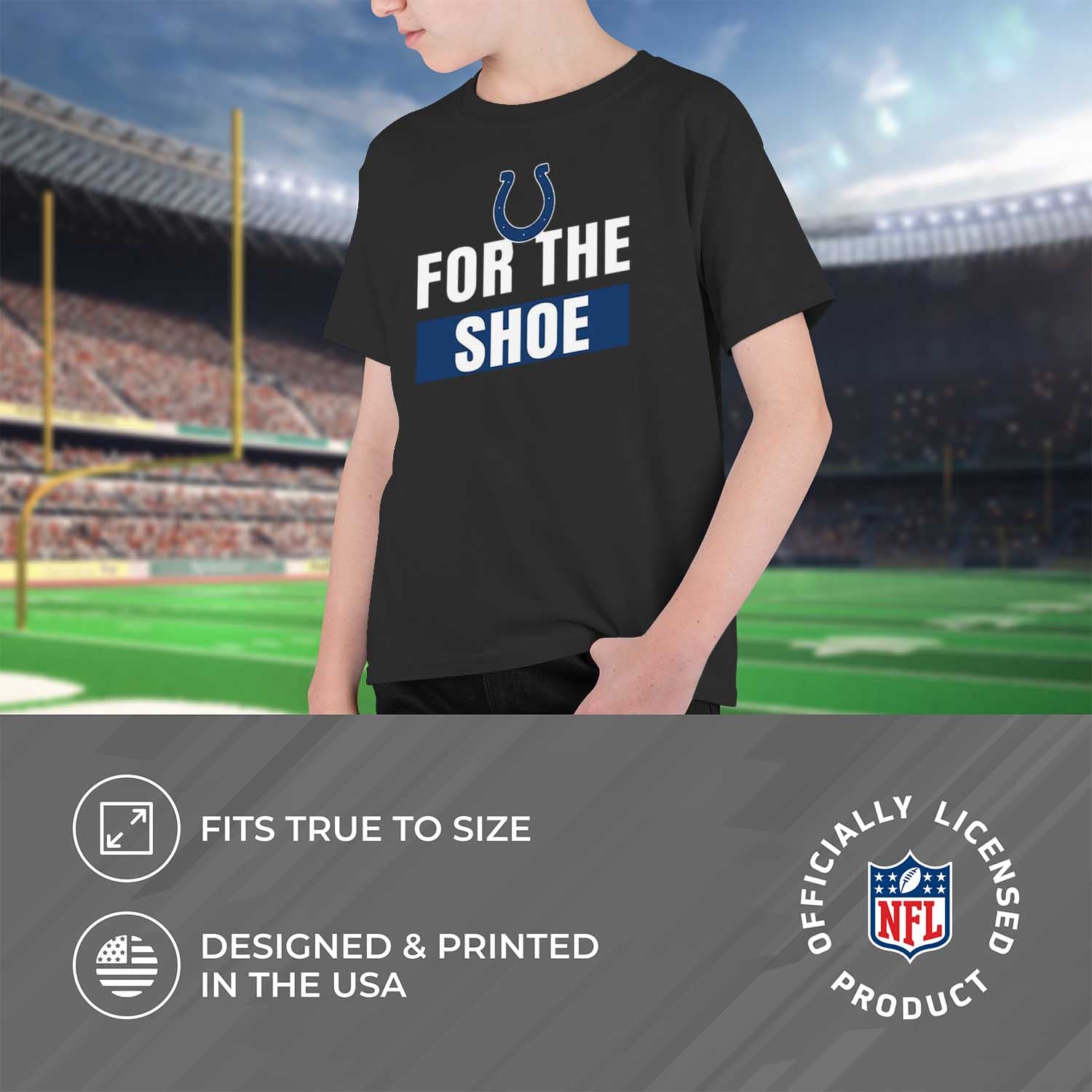 This Indianapolis Colts official slogan t-shirt for kids is made from 50% ringspun cotton and 50% polyester. Our soft Colts youth t-shirt is beyond comfortable and light enough to keep you cool on gameday. This is soft enough that you'll want to wear it every day.     Tagless pro youth football t-shirt ensures comfortability and avoids neck irritation. This tee is perfect for sensitive skin. The soft material of this short sleeve shirt is skin-friendly and adjusts according to your body shape; dual blend material leaves a trendy look that doubles as a closet staple without that irritating, heavy printed feel. This football graphic kids tee features the official Indianapolis Colts slogan. Our high-quality youth t-shirts are designed and printed in the USA. These high quality shirts are made with stitch density for smoother printing surface. The official team slogan shirt gives the look only a true fan can accomplish. This is a piece of essential apparel for any young football or sports fan. Our shirt will make you stand out on gameday. This lightweight t-shirt is ideal for watching the game or for school apparel. It's perfect for Indianapolis football games.    This short sleeve tee is a great addition to any youth superfan's wardrobe. Our pro football short sleeve shirts offer a unisex fit that is ideal for both boys and girls. This Indianapolis t-shirt is perfect for school, practice, big games, or when you just want to show off your team spirit. These festive slogan shirts are the ideal Colts gifts for boys and girls pro football teams.