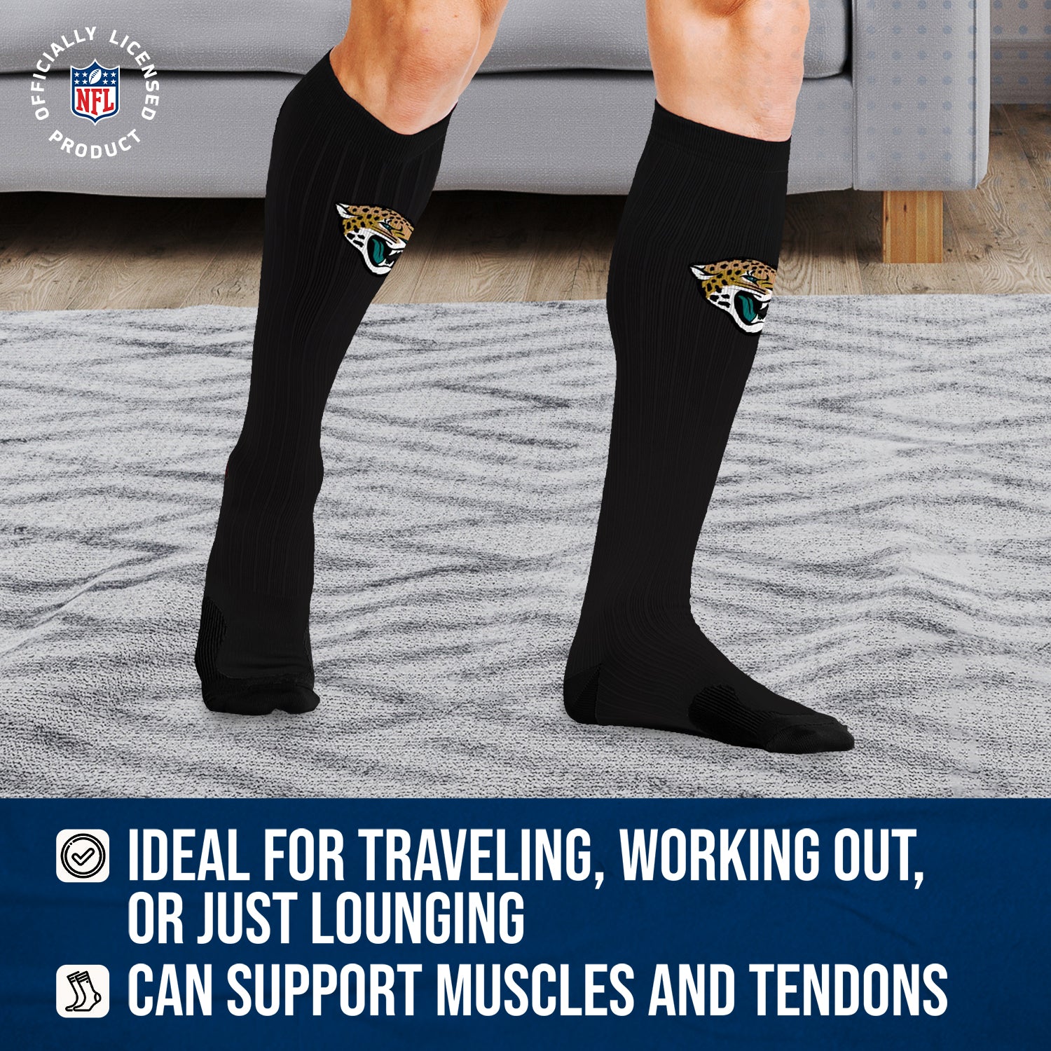 These all-black Jacksonville Jaguars NFL knee-high performance socks are designed to support your muscles and tendons during exercise, as well as reduce soreness and swelling. With a true performance fit, our socks provide support where you need it most for the ultimate in athletics and recovery. Our proprietary blend of materials wicks moisture away from the skin to keep your feet dry and comfortable all day long. Two size options are available, so you can easily find a comfortable fit. Our Jaguars socks for women and men are the best performance socks and make great Jacksonville Jaguars gifts for men, Jaguars gifts, Jaguars gear, and Jaguars socks. If you are looking for high-quality performance socks, unisex compression socks, Jaguars merchandise, or Jaguars gear, these football socks are for you! The all-black socks are a great option for business casual!