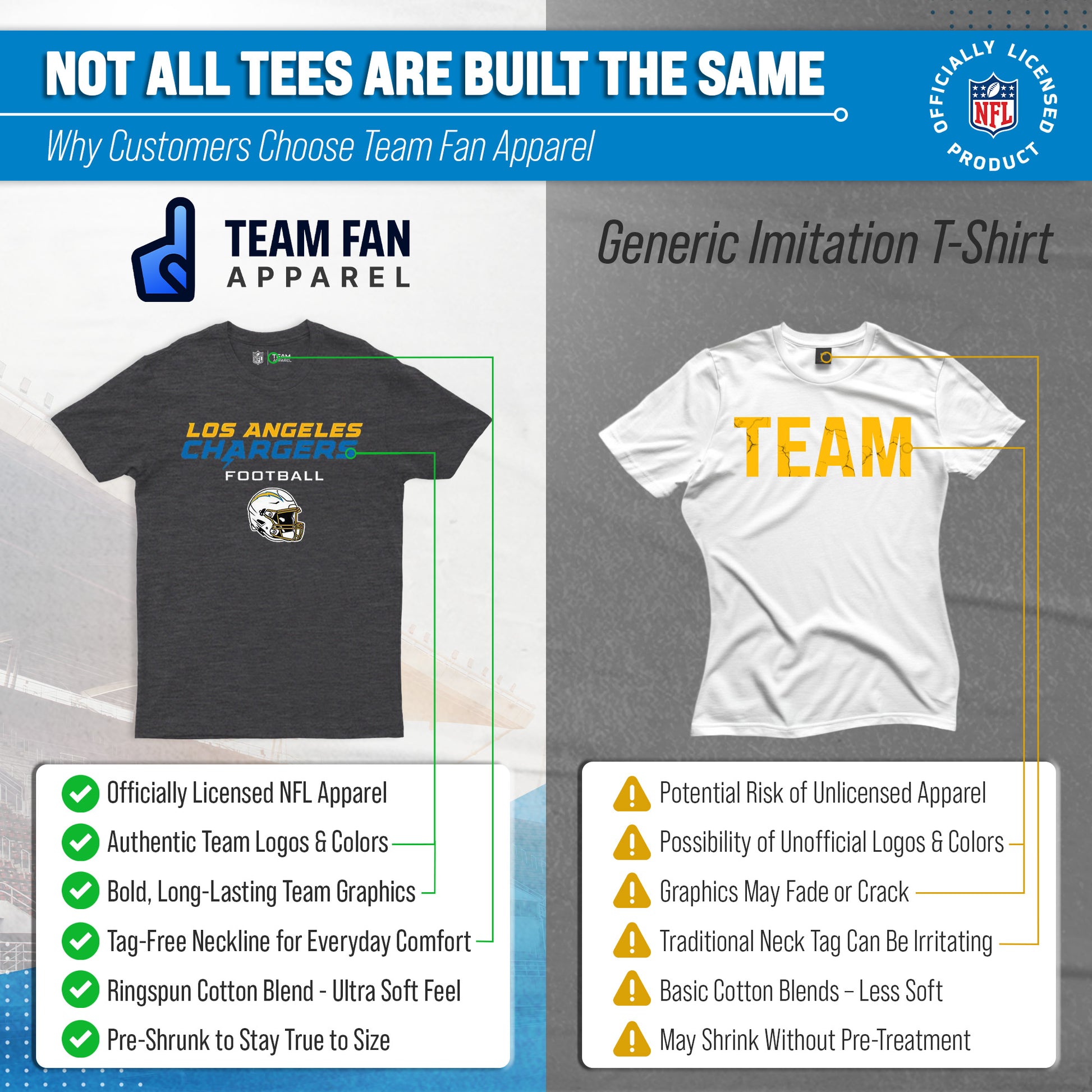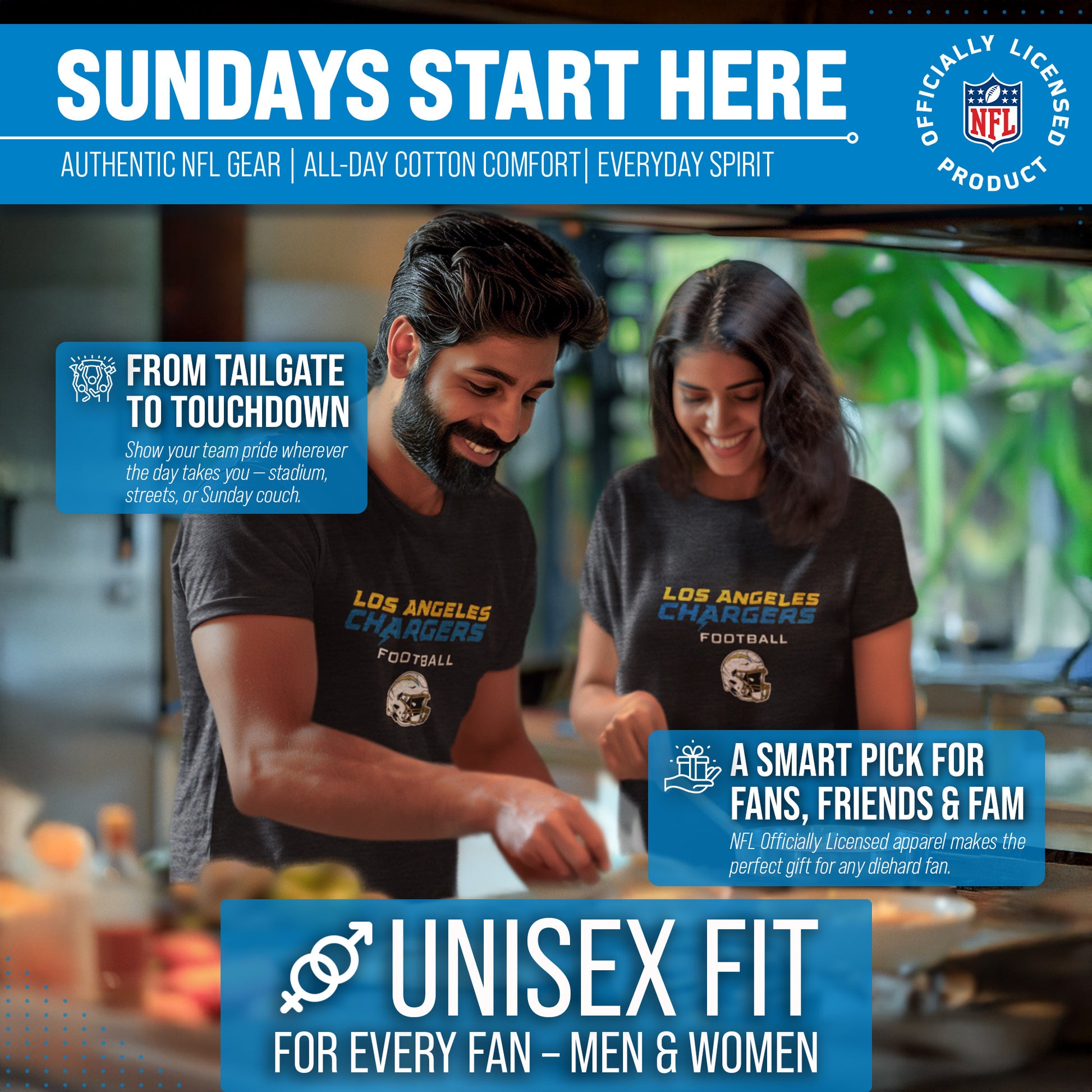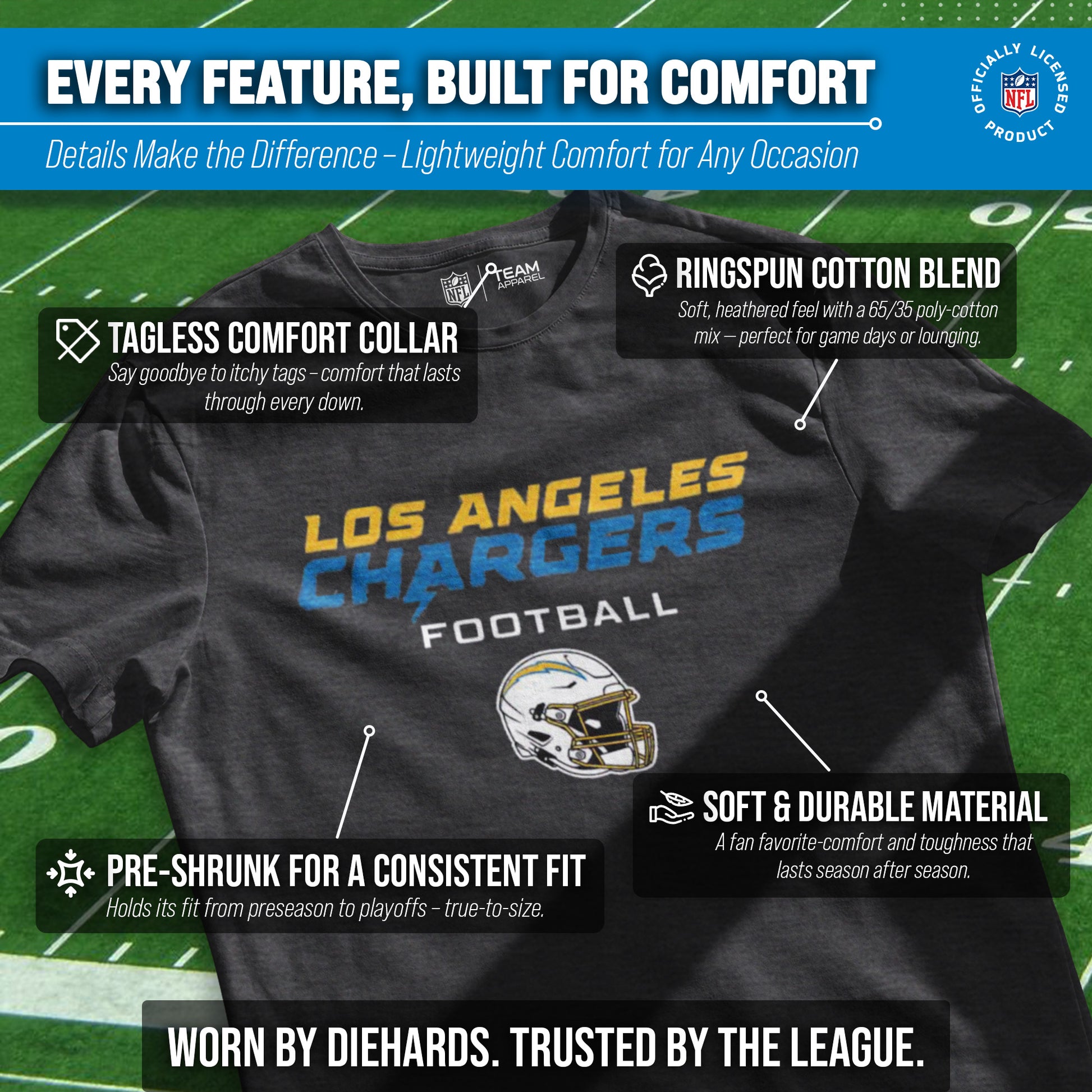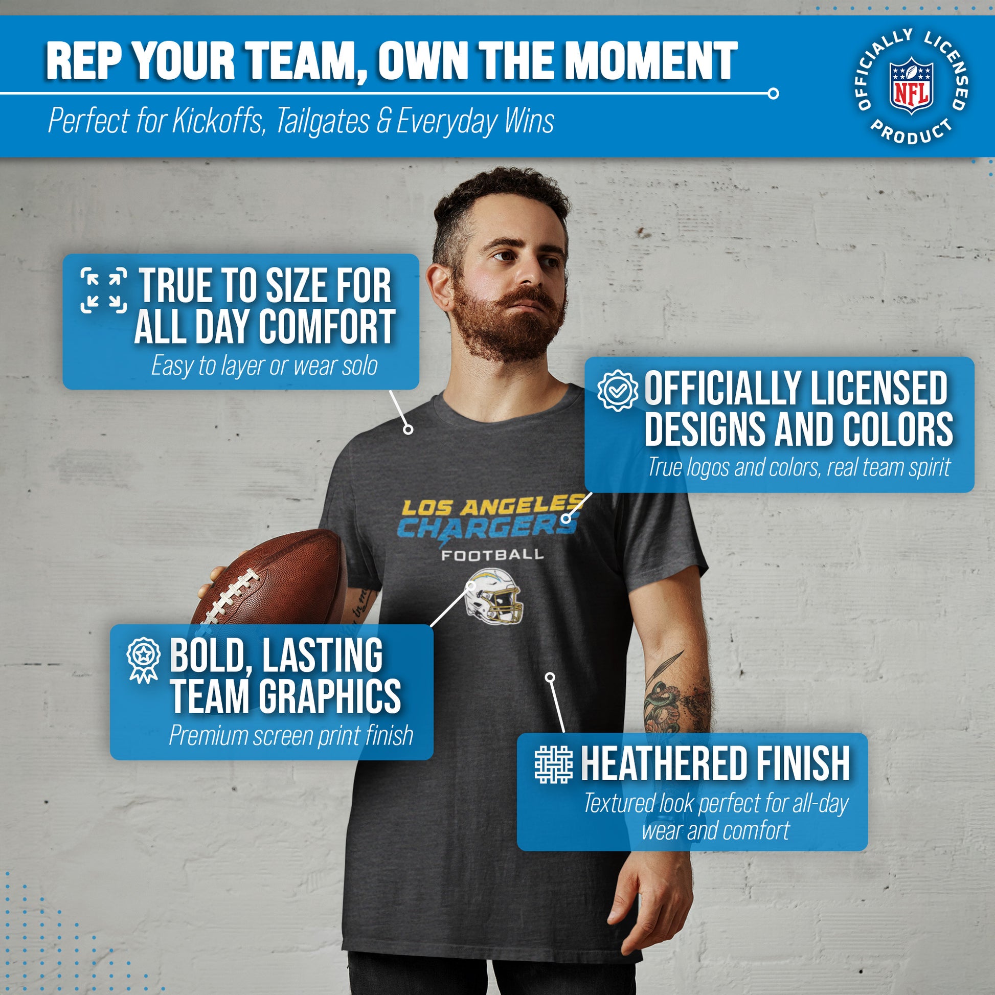 Score with Team Fan Apparel, the ultimate destination for officially licensed NFL apparel for men and women. We use only the highest-quality screen printing techniques to bring you the most comfortable, durable, and stylish clothing possible. Go ahead and show your team pride at the big game or any time! This premium heather charcoal t-shirt fits both male and female adults and comes in small, medium, large, XL, and XXL. So needless to say, it fits Los Angeles Chargers fans of all types! Maybe you aren't a Chargers fan but you know someone who is? Don't worry! This high-quality t-shirt is soft, lightweight, breathable, and a GREAT gift for any birthday, anniversary, Father's Day, Mother's day, you name it! So, if you want to stand out as the #1 fan at the next big game or watch party, you're going to want to be wearing one of these football helmet t-shirts.