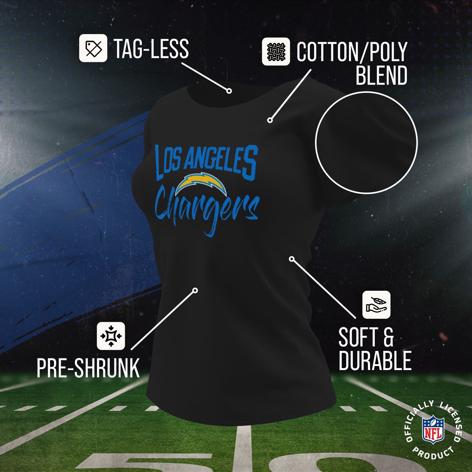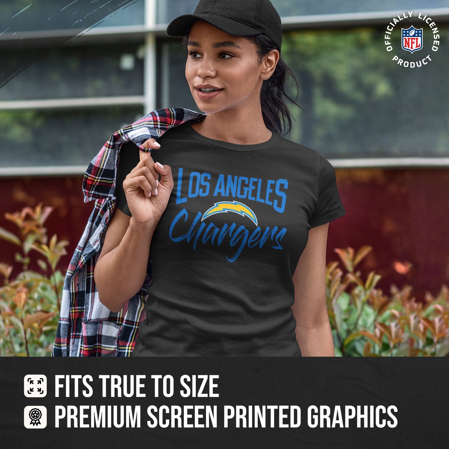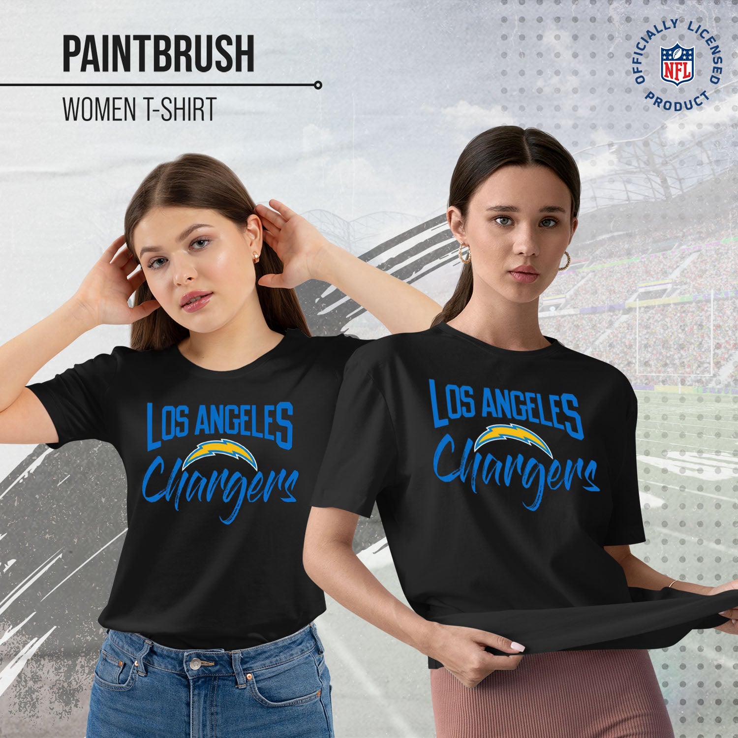 Our officially licensed womens Chargers shirt is super comfortable, runs true to size, and is great for showing off your Los Angeles Chargers pride. The high-quality printed script hand painted looking design will look fresh wash after wash, making it a great alternative to your womens Los Angeles Chargers jersey. Our womens football t-shirt has a relaxed yet contoured fit for a casual yet feminine look. The short sleeve shirt is perfect for tailgates in warmer months, or with jeans or leggings and a sweater during colder months. If you're looking to give team t shirts for women as a gift, our womens paintbrush tshirt is the Chargers shirt women will love. Officially licensed to ensure no counterfeit designs or colors, our Los Angeles Chargers womens shirts are great for superfans. This t shirt will become a fan favorite for women on gameday.