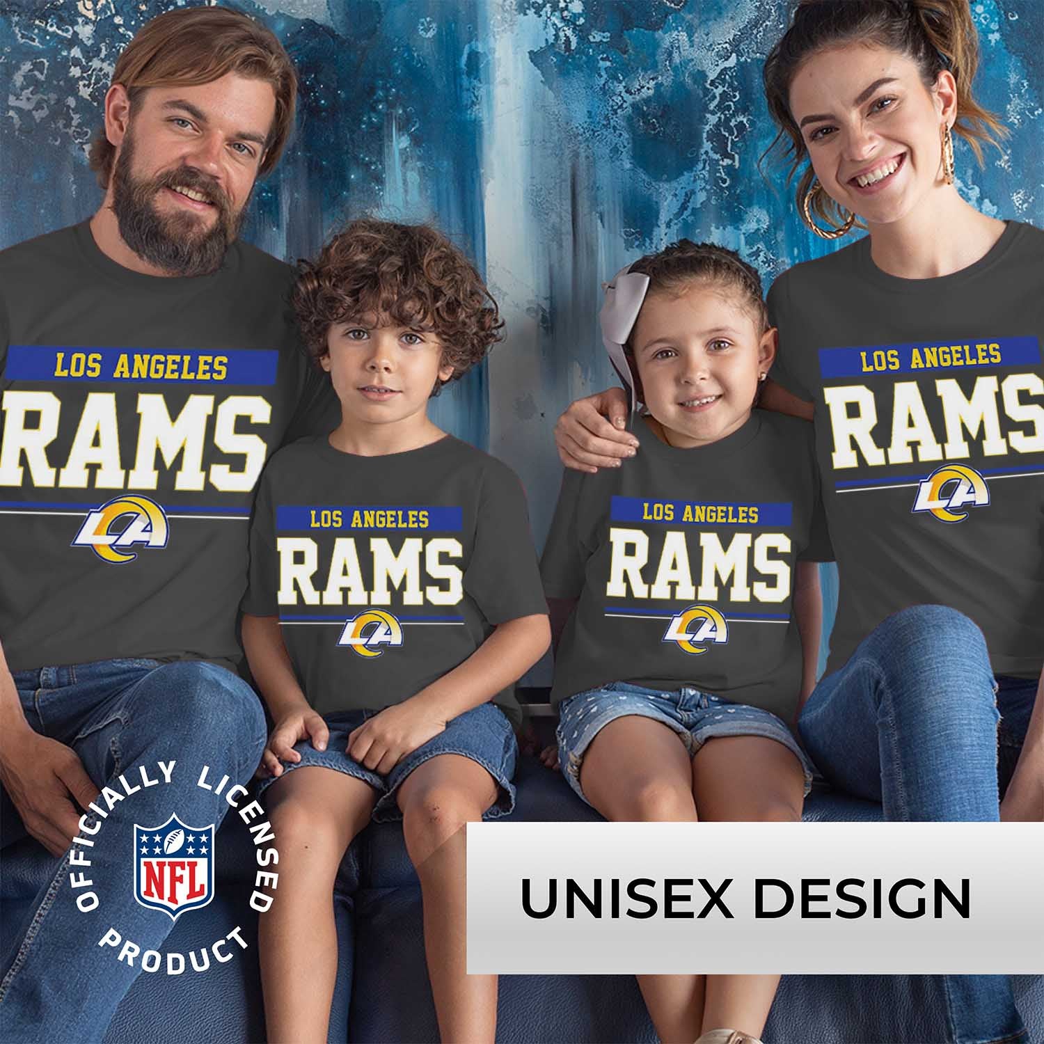 Heather/charcoal wordmark girls and boys Los Angeles Rams t shirts are the ultimate light, soft, and comfortable tee. These Rams tshirts for kids are the most versatile football apparel. Let us help you celebrate and showcase team pride with our durable and lightweight t shirts for boys and girls. This tee features a quality, thermal printed wordmark that will last wear after wear. The official wordmark design gives you the look of a loyal and seasoned sports fan and the unique heather, dual-blended material gives a trendy, distressed look without that heavy printed feel. Made of 50% cotton and 50% polyester, the dual blend material is extremely soft, smooth and comfortable. These Los Angeles Rams youth shirts for boys and girls comes without a tag, so you'll never feel annoyed or irritated by those pesky neck tags again! This tee is essential apparel for any football fan. This classic Los Angeles youth t shirt will stand out and is perfect for gameday, hanging out with friends, or wearing to school. The unisex fit and design makes it ideal for both boys and girls! Quality Rams t shirt makes the best birthday, or Christmas gifts for young fans; Our Los Angeles Rams shirts for kids run true to size. All quality logos and colors are officially licensed and are of the highest quality. Show off your team pride with this official short sleeve shirt!