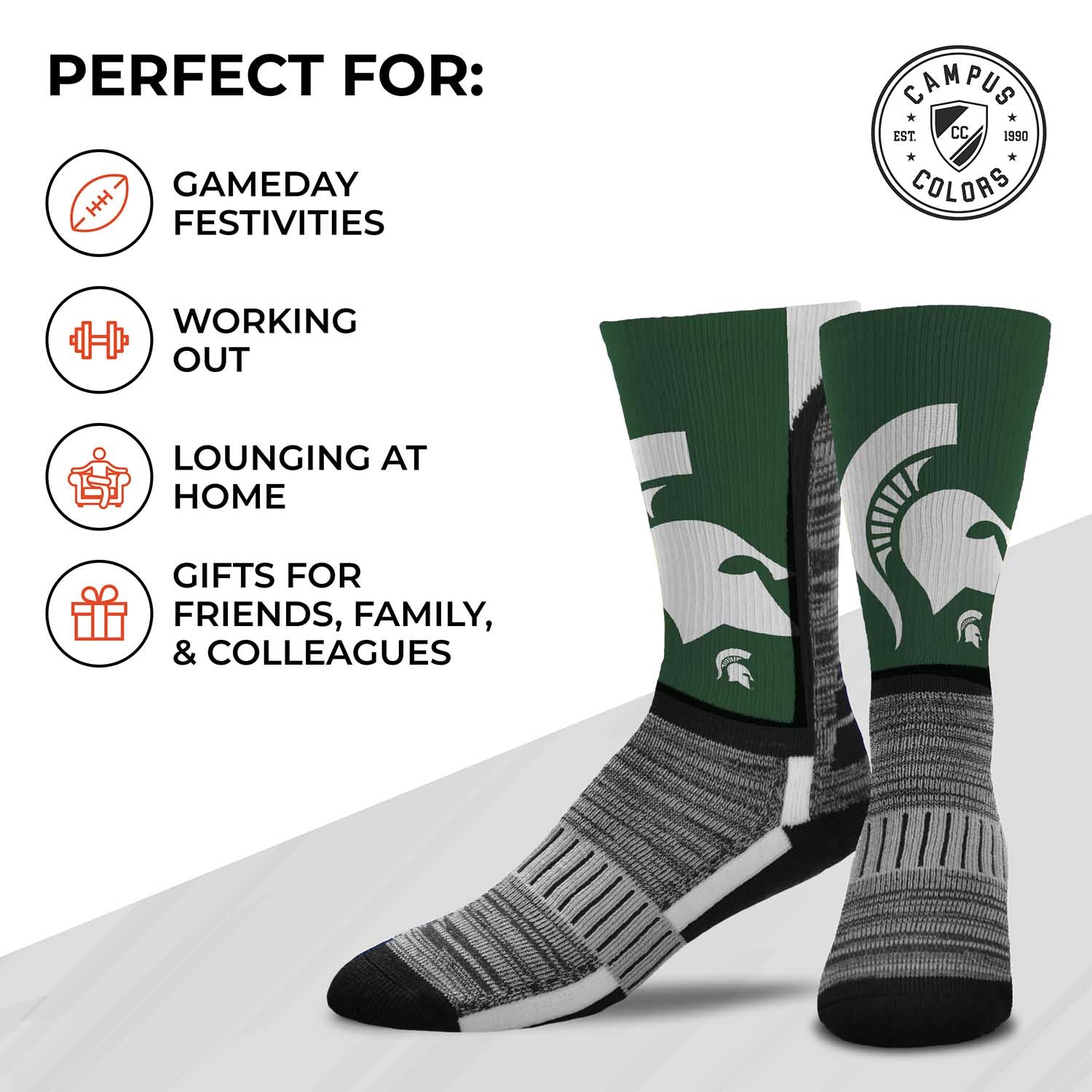 These Michigan State Spartans socks for men and women are great for showing off your Michigan State pride from head to toe. The unisex socks are comfortable enough to wear to the gym, the game, the tailgate, or nowhere at all. The crew length and poly-spandex blend featuring a supportive formed heel make them a comfortable choice for showcasing your love for your team all year long. Spartans socks pair well with Michigan State shoes and are great additions to any collection of Michigan State Spartans stuff. Wear them with shorts, your favorite jersey, and Michigan State shoes for a super fan look, or rock them in the office for an alternative on casual Friday. On a lazy day, wear them with your Michigan State underwear or pajamas while you put your feet up and enjoy a game on your tv at home. These Michigan State crew socks make great gifts for all ages, perfect father's day gift, birthday gift, or holiday stocking stuffers. The officially-licensed team logo, colors, and graphics make these Michigan State Spartans socks the socks women and men will love forever. Fabric content is 95% polyester, 2% nylon, 2% rubber, and 1% spandex. Machine washable, tumble dry low.