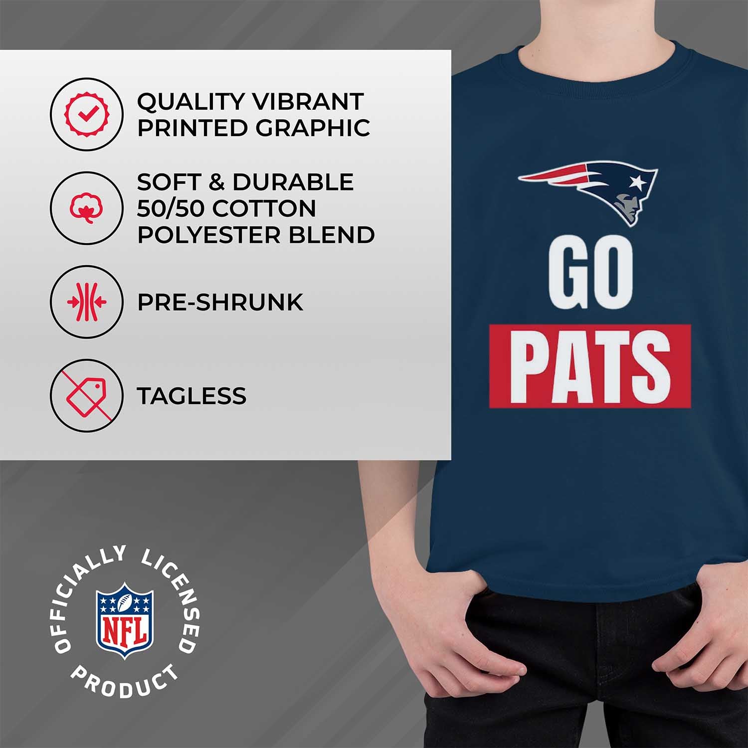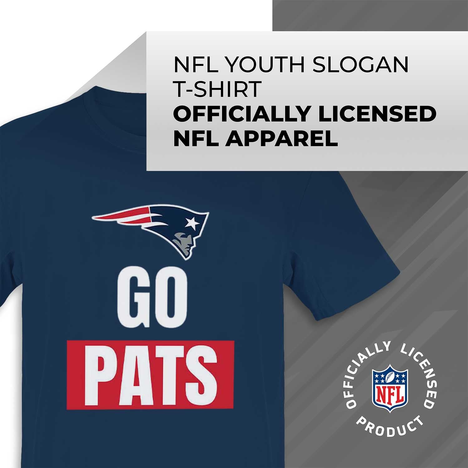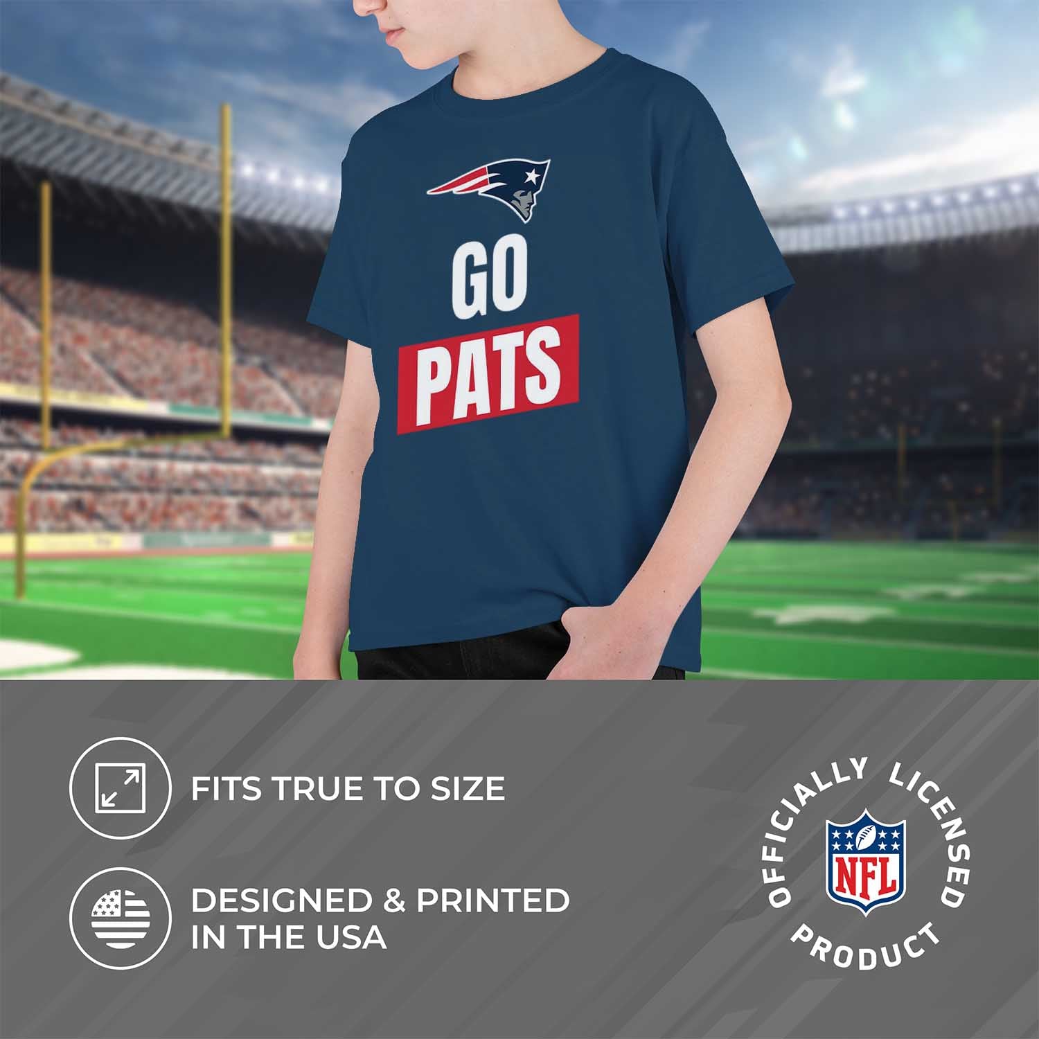 This New England Patriots official slogan t-shirt for kids is made from 50% ringspun cotton and 50% polyester. Our soft Patriots youth t-shirt is beyond comfortable and light enough to keep you cool on gameday. This is soft enough that you'll want to wear it every day. Tagless pro youth football t-shirt ensures comfortability and avoids neck irritation. This tee is perfect for sensitive skin. The soft material of this short sleeve shirt is skin-friendly and adjusts according to your body shape; dual blend material leaves a trendy look that doubles as a closet staple without that irritating, heavy printed feel. This football graphic kids tee features the official New England Patriots slogan. Our high-quality youth t-shirts are designed and printed in the USA. These high quality shirts are made with stitch density for smoother printing surface. The official team slogan shirt gives the look only a true fan can accomplish. This is a piece of essential apparel for any young football or sports fan. Our shirt will make you stand out on gameday. This lightweight t-shirt is ideal for watching the game or for school apparel. It's perfect for New England football games. This short sleeve tee is a great addition to any youth superfan's wardrobe. Our pro football short sleeve shirts offer a unisex fit that is ideal for both boys and girls. This New England t-shirt is perfect for school, practice, big games, or when you just want to show off your team spirit. These festive slogan shirts are the ideal Patriots gifts for boys and girls pro football teams.