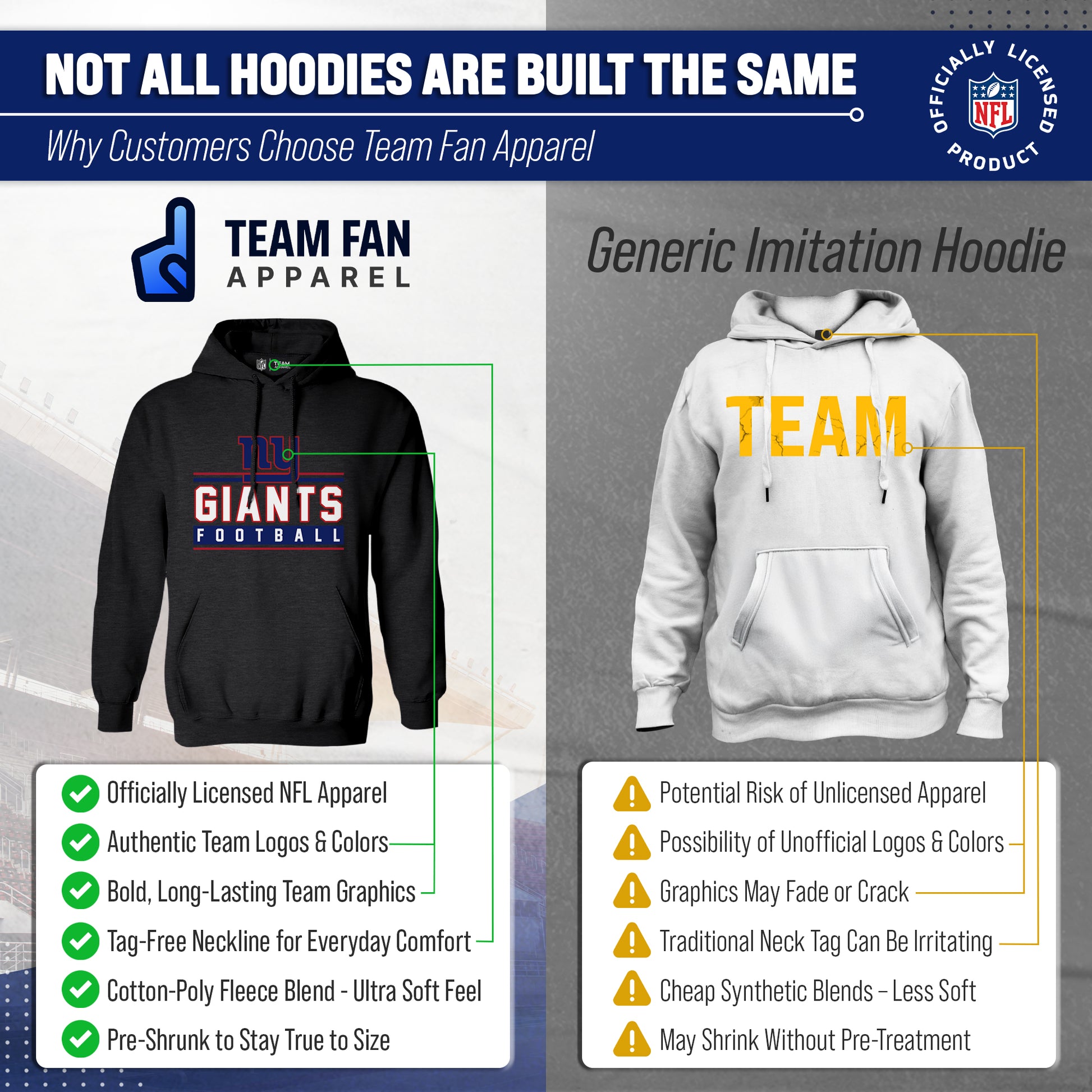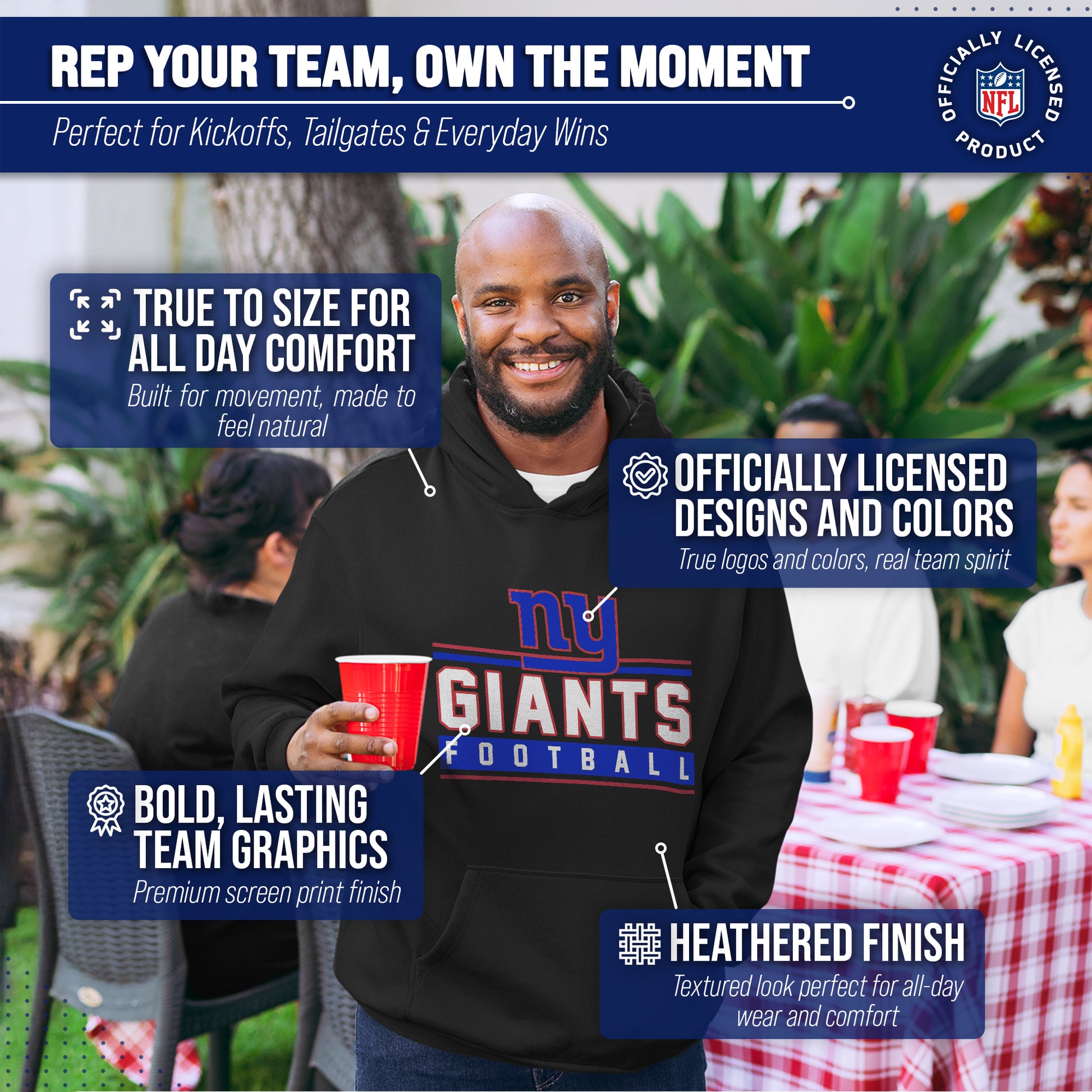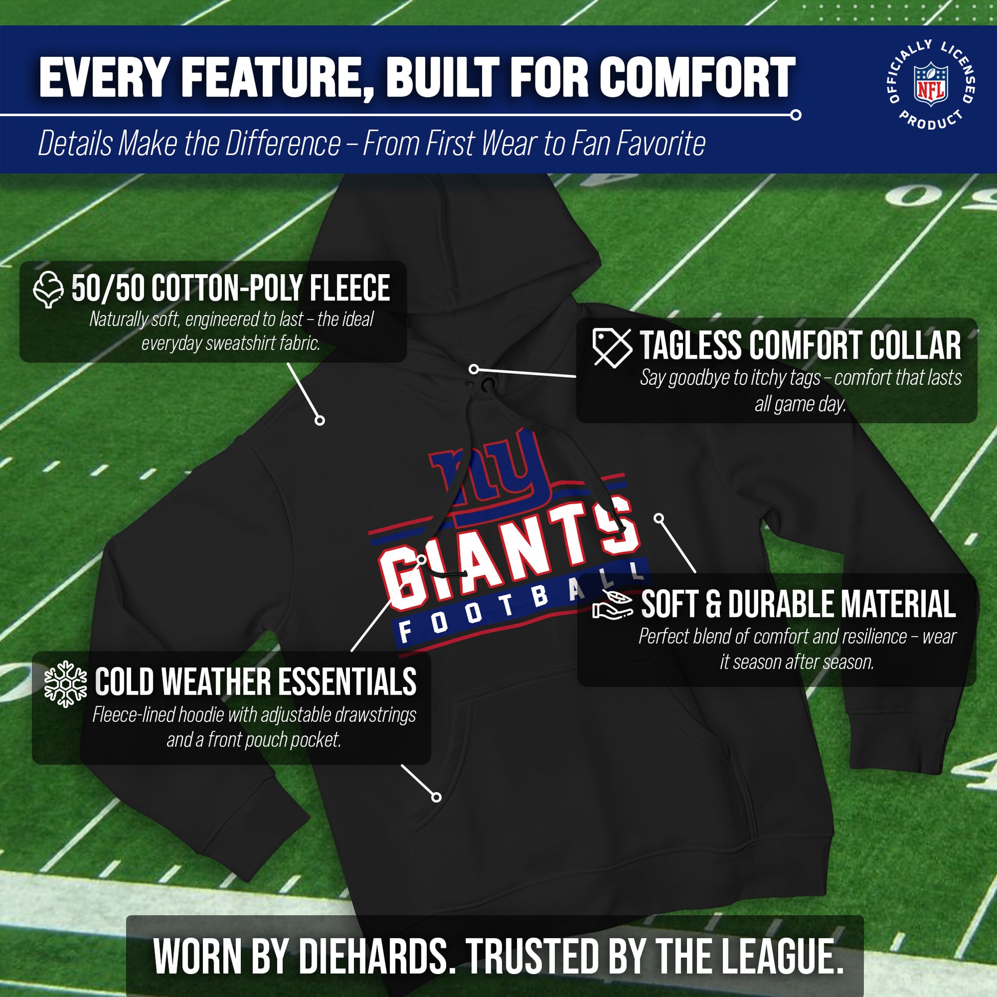 The True Fan womens and mens New York Giants hoodies are the ultimate light, soft, & comfortable sweatshirts. These New York Giants pullover hoodies are the most versatile football apparel. Let us help you celebrate your team pride with our durable and lightweight New York Giants hoodies for men and women. This sweatshirt features a quality, screen printed wordmark that will last. The official wordmark design gives you the look of a loyal and seasoned sports fan and the unique, dual-blended material gives a trendy, distressed look without that heavy printed feel. Made of 50% ringspun cotton and 50% polyester, the dual blend material is extremely soft and smooth. These New York Giants hoodies for men and women come without a tag, so you'll never feel irritated by tags again! This comfortable New York hoodie makes the best birthday, Christmas, or graduation gifts for Giants fans.