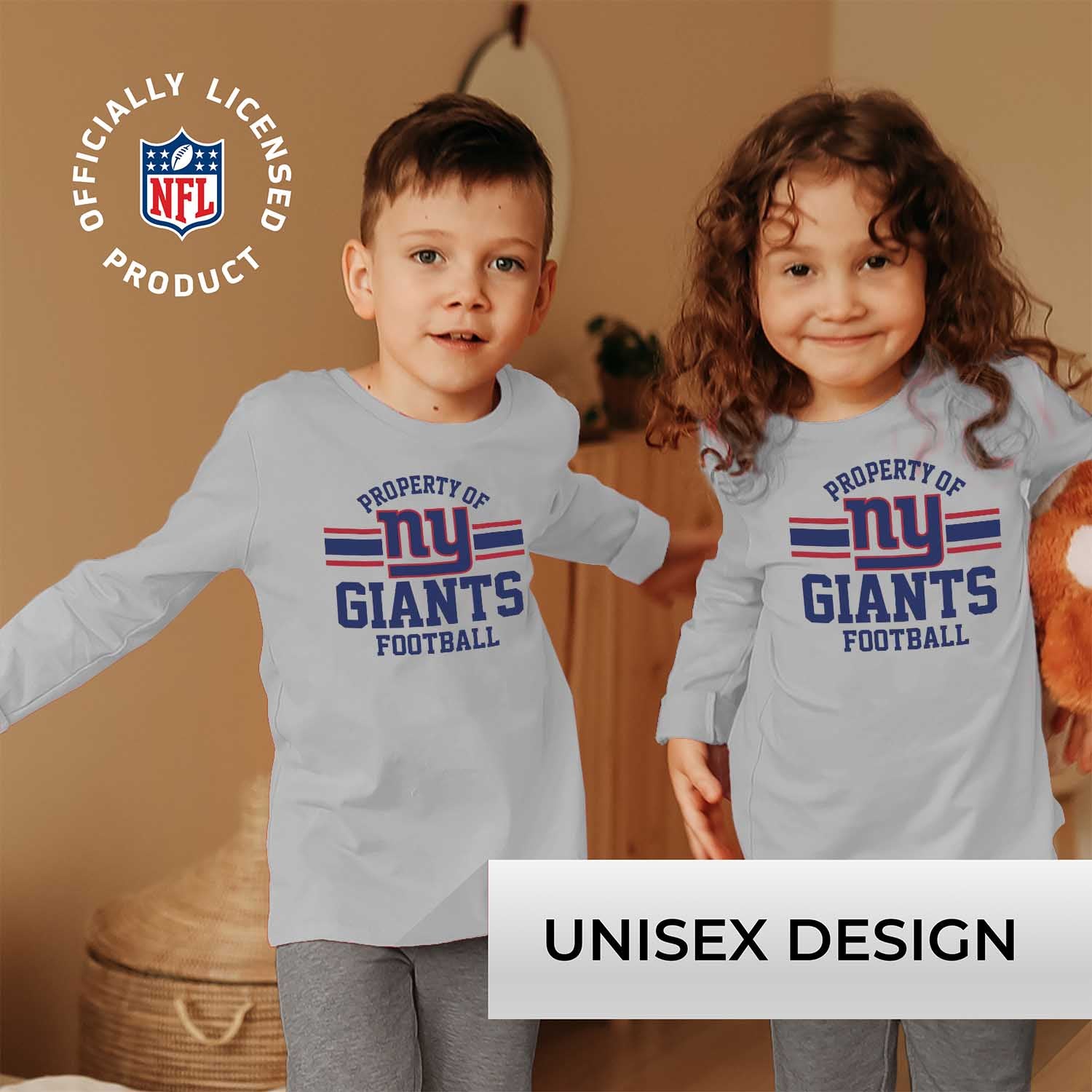 This Property of New York Giants youth long sleeve is made from 90% ringspun cotton and 10% polyester. Our soft youth long sleeve tshirt is beyond comfortable and light enough to keep you cool on gameday and soft enough that you'll want to wear it every day. Tagless pro football long sleeve ensures comfortability and avoids neck irritation. This shirt is perfect for sensitive skin. The soft material of this long sleeve shirt is skin-friendly and adjusts according to your body shape; dual blend material leaves a trendy look without that irritating, heavy printed feel. This pro football tee for kids features official Property of graphics. Our high-quality, heather grey/charcoal football tshirts are designed and printed in the USA. These high quality shirts are made with stitch density for smoother printing surface. This Property of New York Giants long sleeve shirt gives the look only a true fan can accomplish. This is essential kids apparel for any football or sports fan. Our graphic shirts for boys and girls will make you stand out on gameday. This lightweight shirt is perfect for watching the game, wearing to school, or for a birthday gift. It's perfect for Giants football games. This long sleeve tee is a great addition to any superfan's wardrobe. Our pro football long sleeve shirts offer a unisex fit that is ideal for both boys and girls. This Property of Giants long sleeve is perfect for school, big games, or when you just want to show off your team spirit. These festive Property of Program shirts are the ideal New York gifts for boys and girls pro football teams.