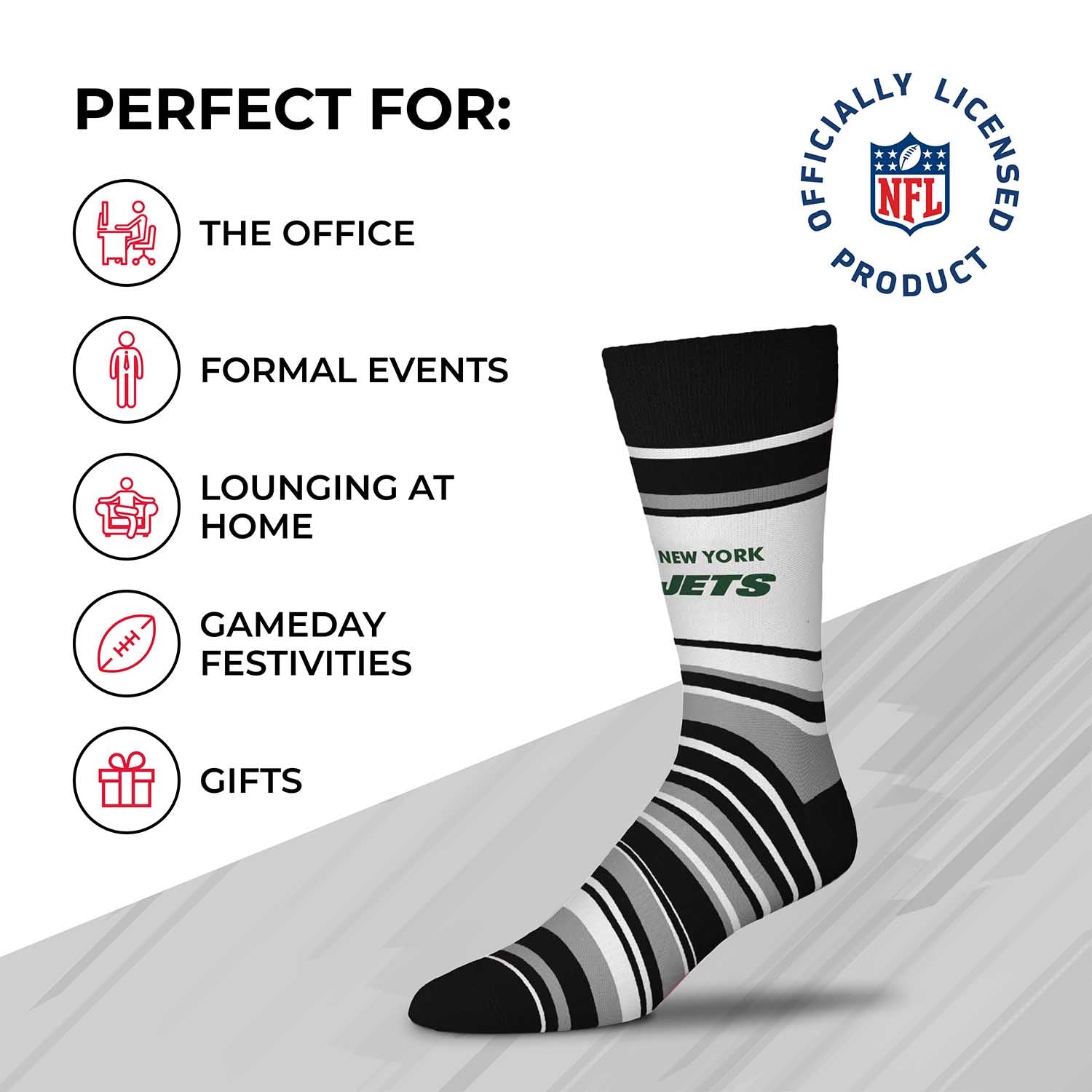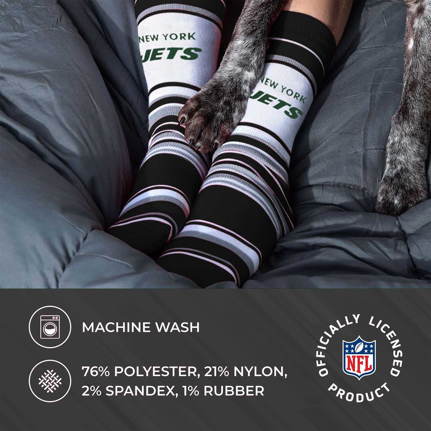 These dress striped New York socks are great for showing off your New York pride at formal events. The New York dress socks are comfortable and fit most feet. The crew length and acrylic fabric blend feature a flashy striped pattern make them a comfortable choice for showcasing your love for your team all year long. New York Jets youth socks and adult socks are great additions to a collection of New York Jets stuff. Wear them with shorts, your favorite jersey, and New York Jets shoes for weekend look, or rock them in the office for an alternative to typical striped. On a lazy day, wear them with your underwear or pajamas and slippers while you put your feet up and enjoy a game in the house. Striped dress New York socks for women and men make great gifts for all ages, combine them with boxers and New York Jets slippers for a perfect father's day gift or holiday stocking stuffers. The officially-licensed team logo, colors, and graphic make these socks the New York Jets striped socks everyone will love. Fabric content is 76% acrylic, 21% nylon, 2% spandex, and 1% rubber. Machine wash, tumble dry low.