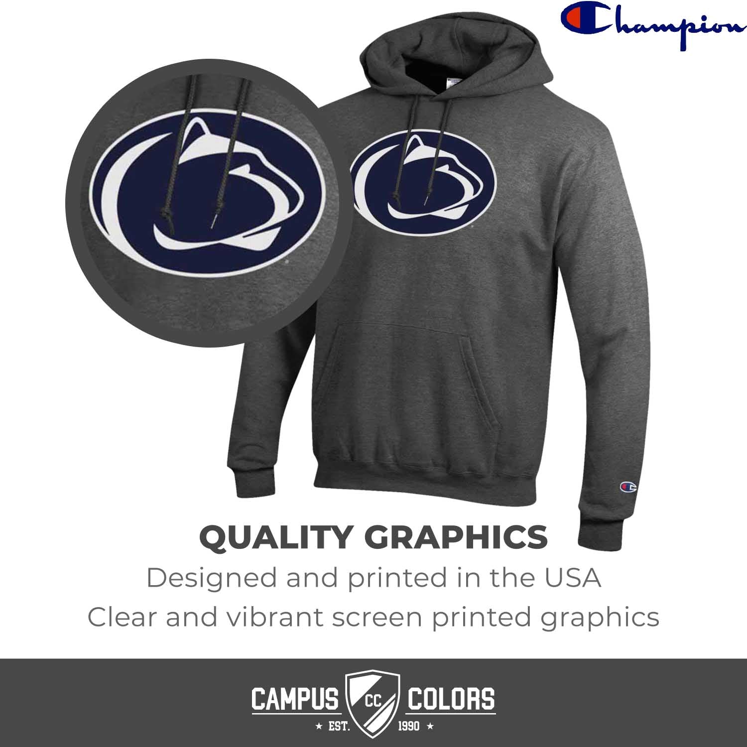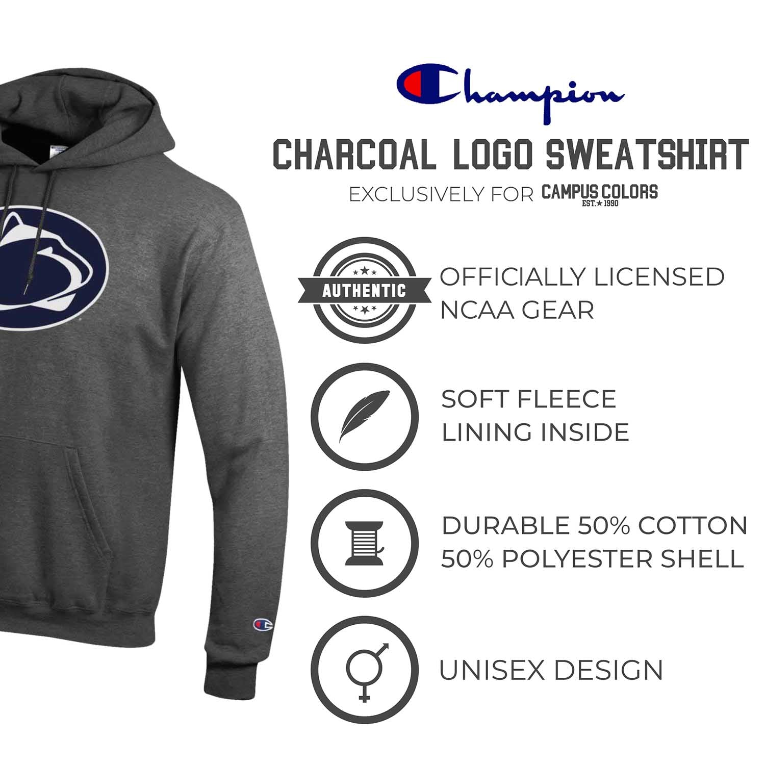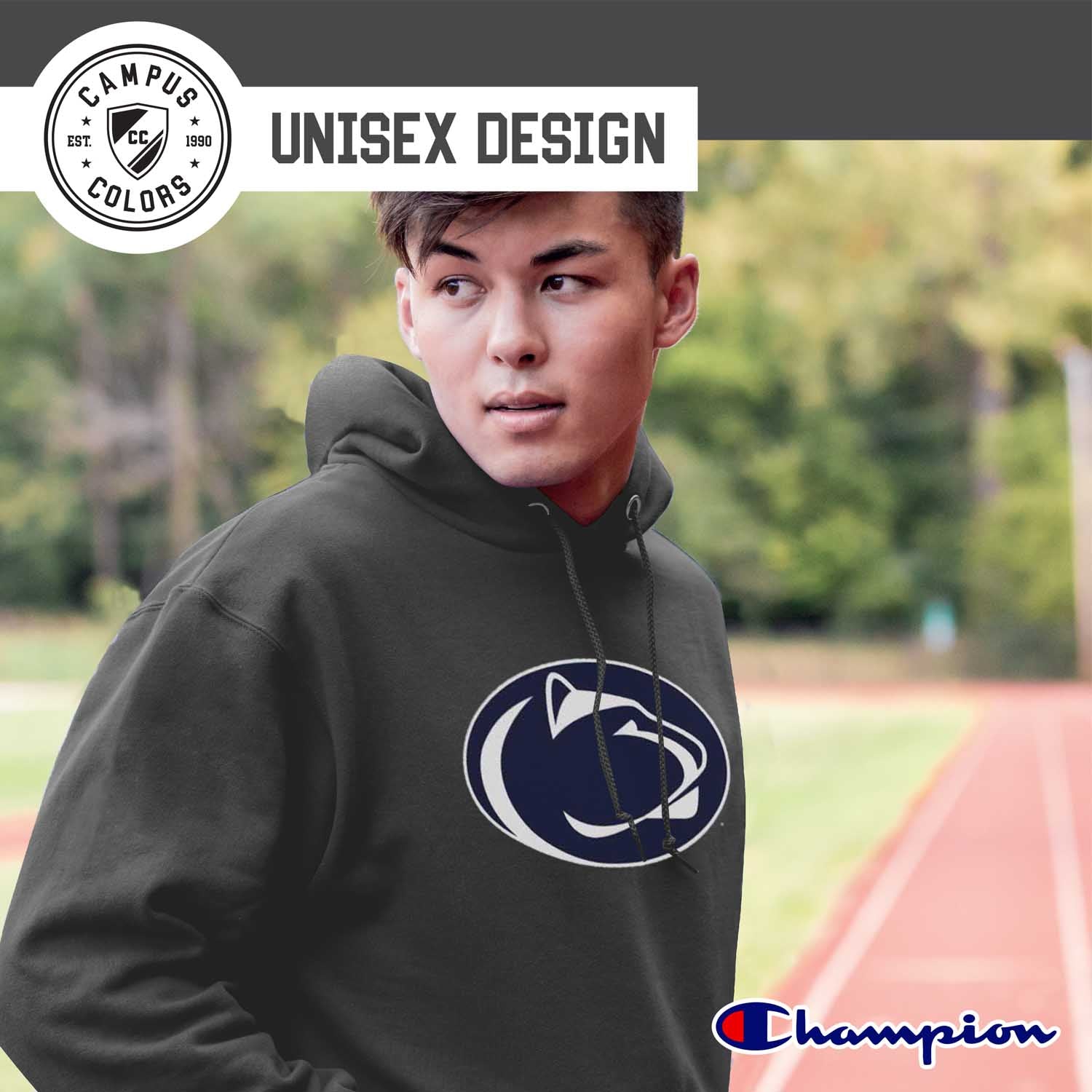 When the weather gets cool, keep your Penn State loyalty hot! The Penn State Nittany Lions Adult NCAA Mascot Fleece Hooded Sweatshirt is just what you have been looking for! This cotton/polyester fleece hooded sweatshirt is comfortable yet durable and is the perfect weight for that chilly game day or that brisk outdoor activity. Simple is better and this sweatshirt supports that theory! Your pride will be radiating with the bold colors and quality screen printed logo in the center! Featuring high quality screen printed design with a large official Penn State logo in the center of the hoodie, ribbed cuffs and waistband, double layer hood with drawstrings, spacious front pouch pocket, and the official Champion logo on the left wrist, there is nothing you will not love about this sweatshirt. Whether you are wearing it in the stands, cheering on your squad at home, or wearing it around town running errands, this hoodie is an amazing addition to any die-hard fans wardrobe! Perfect for yourself, a soon to-be graduate, or even an alum, show off your Penn State fandom in style. MADE FROM: ultra soft blend of 50% ring spun cotton / 50% polyester fleece. FEATURES: high quality screen printed design with a large official Penn State logo in the center of the sweatshirt, ribbed cuffs and waistband, double layer hood with drawstrings, spacious front pouch pocket, and the official Champion logo on the left wrist. PERFECT: for any Nittany Lions fan in your life! Great for wearing to big games, tailgates, to work, to class, working out, running errands, or ANY time you want your fandom to be known when the weather gets cold! OFFICIALLY LICENSED: by NCAA and is the highest of quality.