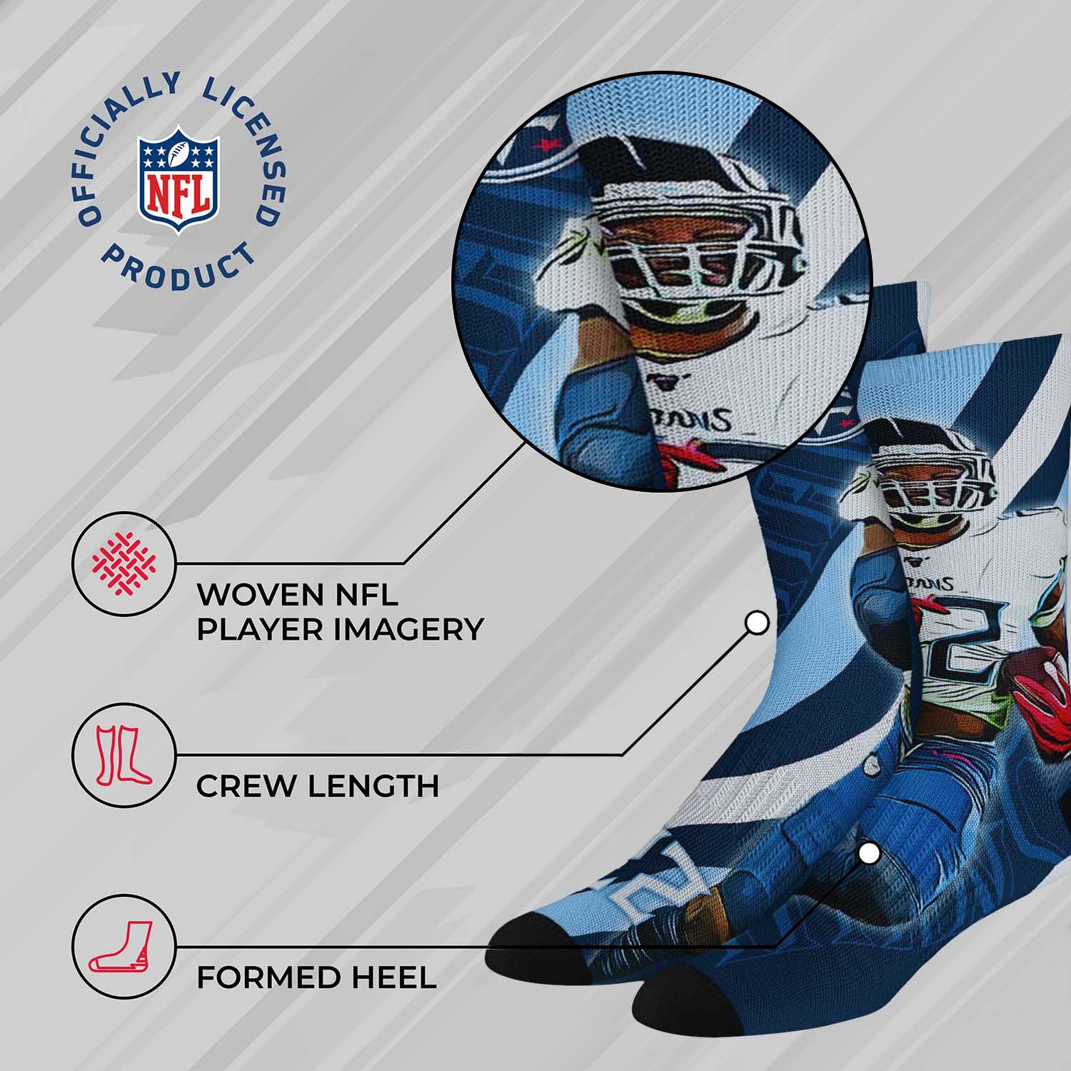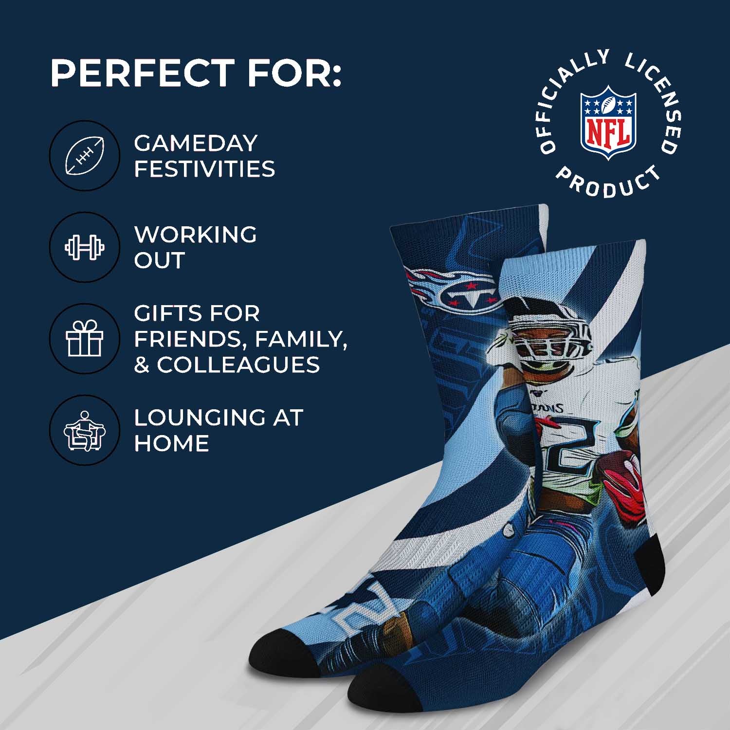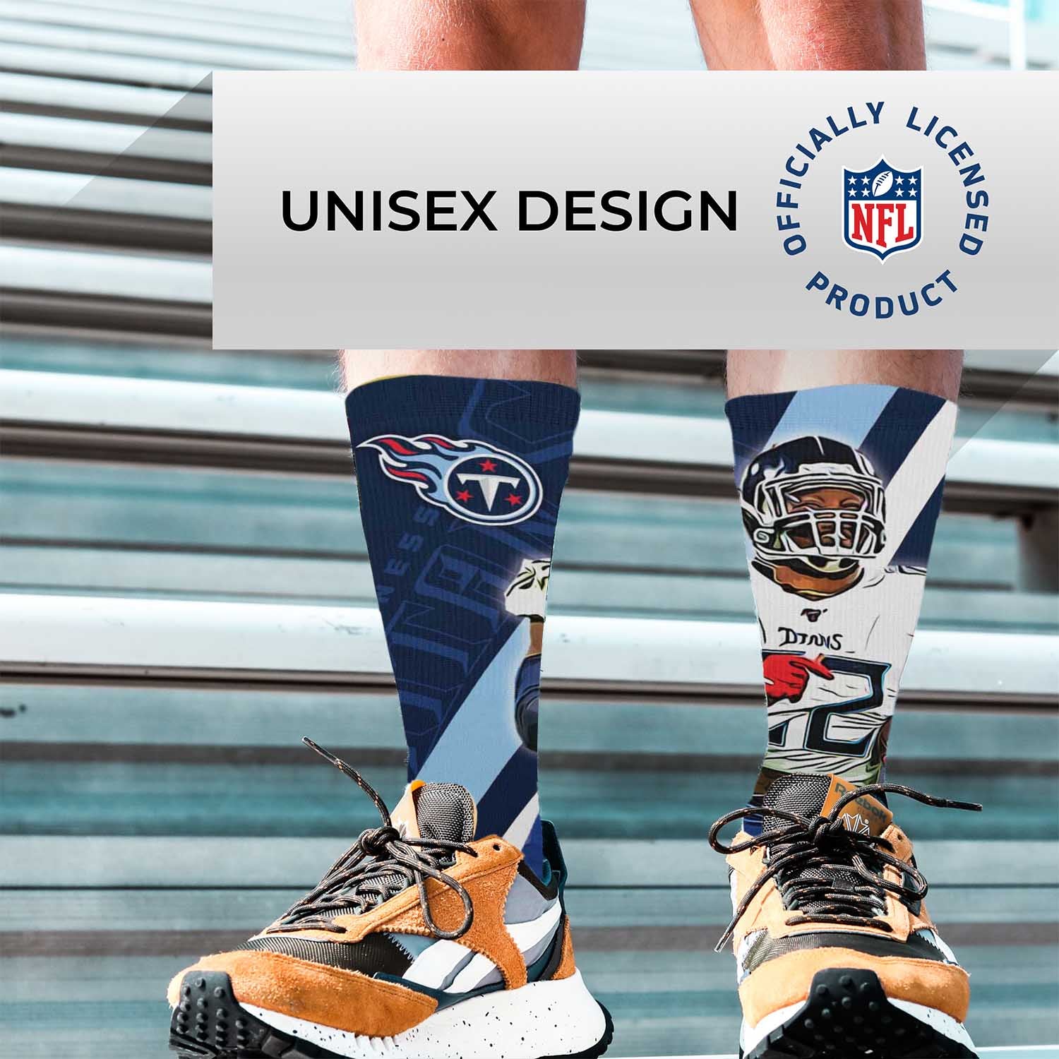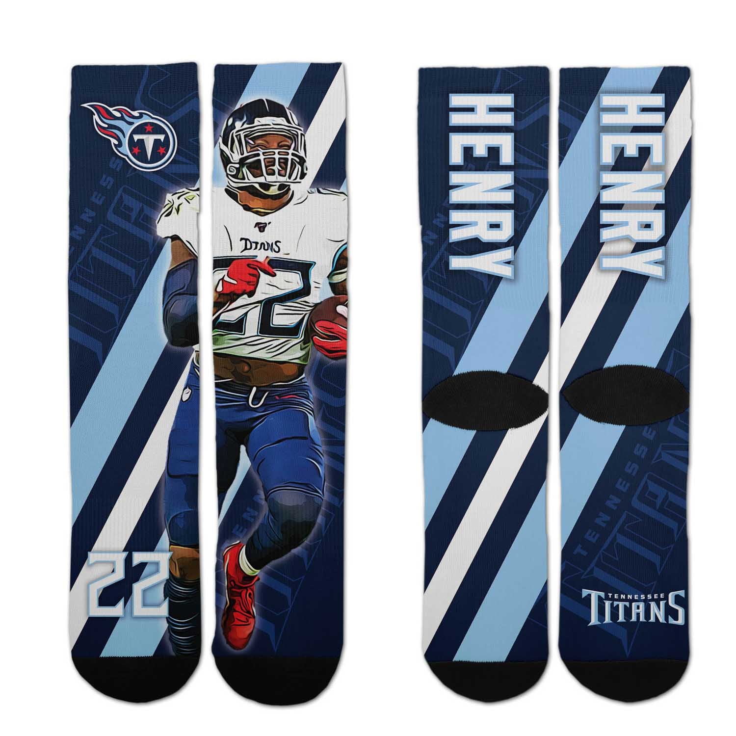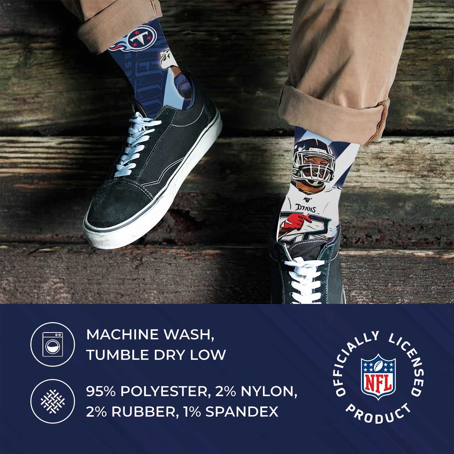 These Adult Tennessee Titans Player Stripe Crew Socks are great for showing off your Titans pride from head to toe. These unisex socks are comfortable, and are available in a range of sizes. The crew length and poly-spandex blend featuring a supportive formed heel make them a comfortable choice for showcasing your love for your favorite player and your Titans pride all year long. These socks will be your new favorite game day accessory. Wear them with your favorite Tennessee Titans shirt or jersey, to the stadium or the tailgate party for a true superfan gameday look, or rock them in the office for an original look on casual friday. Put them on with a Titans shorts while you exercise, or pair them with pajamas while you put your feet up and enjoy the game in the house. These player stripe crew socks are so comfortable, you can even keep them on when you go to sleep! The woven likeness of your favorite player and officially-licensed Tennessee Titans colors and graphics make these crew socks so authentic you'll wish they were autographed. Fabric content is 95% polyester, 2% nylon, 2% rubber, and 1% spandex. Machine washable, tumble dry low.