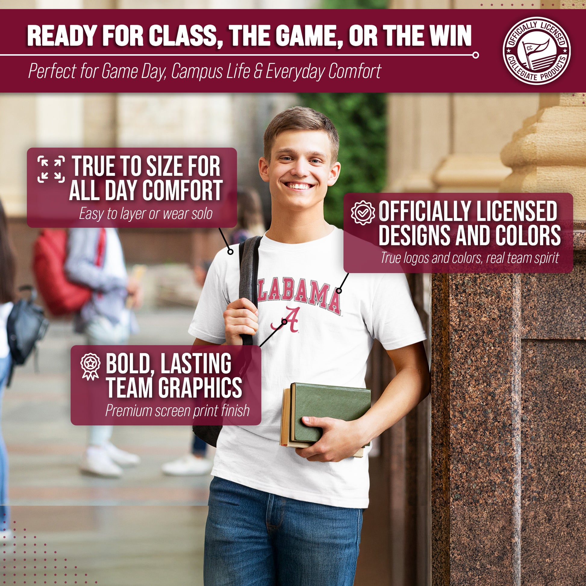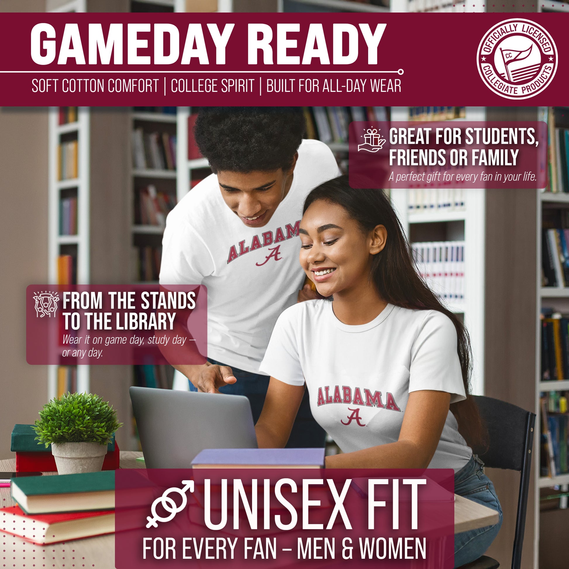 Score with Campus Colors, the ultimate destination for officially licensed college apparel for men and women.  Design and printed in the USA, we use only the highest quality screen printing techniques to bring you the most comfortable, durable, and stylish clothing possible. Go ahead and show your team pride at the big game or any time!  This premium-quality Gameday t-shirt fits both male and female adults and comes in small, medium, large, XL, and XXL. So needless to say, it fits Alabama Crimson Tide fans of all types!  Maybe you aren't a Alabama fan but you know someone who is? Don't worry! This high-quality t-shirt is soft, lightweight, breathable and a GREAT gift for any birthday, anniversary, Father's Day, Mother's day, you name it!  So, if you want to stand out as the #1 Crimson Tide fan at the next big tailgate party, homecoming parade, or watch party, you're going to want to be wearing one of these Gameday t-shirts.