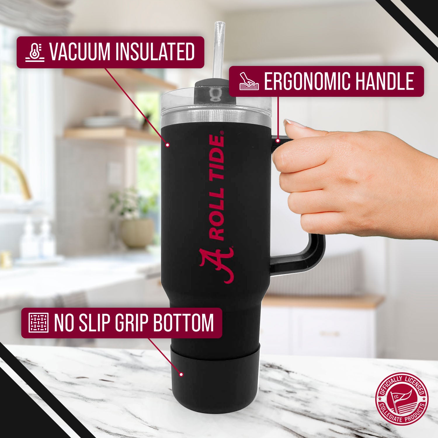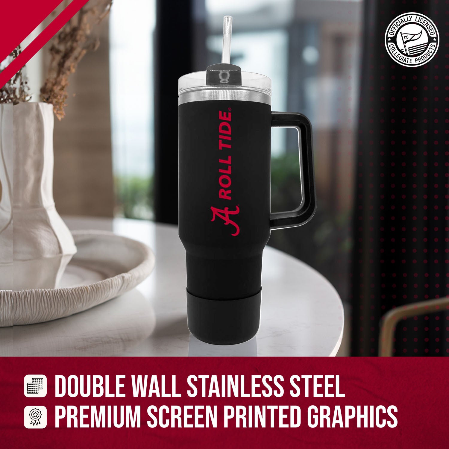 Our stainless steel 40 oz tumblers with handle and straw are designed for constant use in any type of setting! At a sports game? These insulated tumblers are compact and can fit in most cup holders and even feature a no slip grip on the bottom to keep condensation away! On the move? Our contoured spout or straw options makes it easy to sip on the go! No matter the setting, show your school pride while properly and efficiently preserving the desired temperature of your beverage! This Alabama Crimson Tide travel tumbler also makes a great gift! Combine the 40 oz Alabama tumbler with a Alabama pillow or a Alabama blanket and give a whole haul of Crimson Tide gear to your favorite alumni! All of our products feature the officially licensed team colors, logos and lettering. We don't skimp on quality in any way. The colors are always vibrant and the graphics are always accurate and brimming with team spirit.