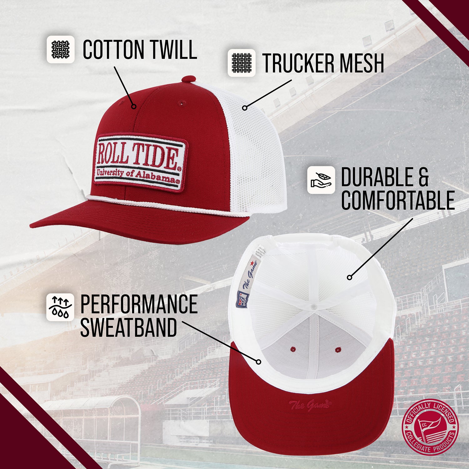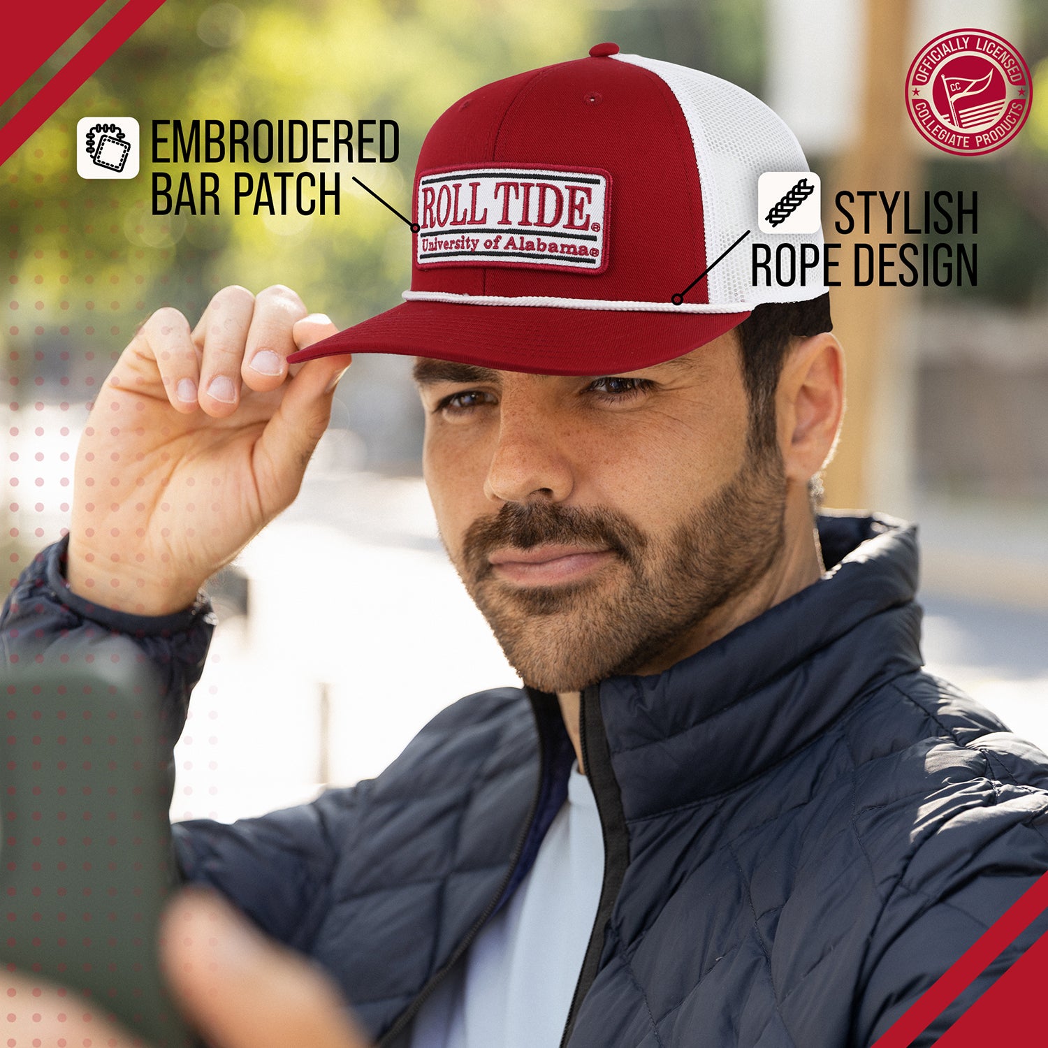 Elevate Your hat game with this Alabama Crimson Tide Elite Everyday Trucker Hat! Whether you're heading to a game, running errands, or just having a casual day out, our Crimson Tide trucker hat is the perfect accessory. Made with soft and breathable mesh material, this cap will keep your head cool and comfortable all day long. The one size fits most and adjustable snapback closure ensures a secure and cozy fit for both men and women. But it's not just about style - our hat also features a performance sweatband that wicks away moisture to keep you dry during any activity. And with its custom embroidered patch and rope detail showcasing your favorite NCAA team, you can proudly represent them wherever you go. With its versatile design and friendly fit, our everyday trucker hat is suitable for any occasion. So why settle for ordinary hats when you can upgrade to this rope trucker hat? Grab yours now and show off your team spirit in style!