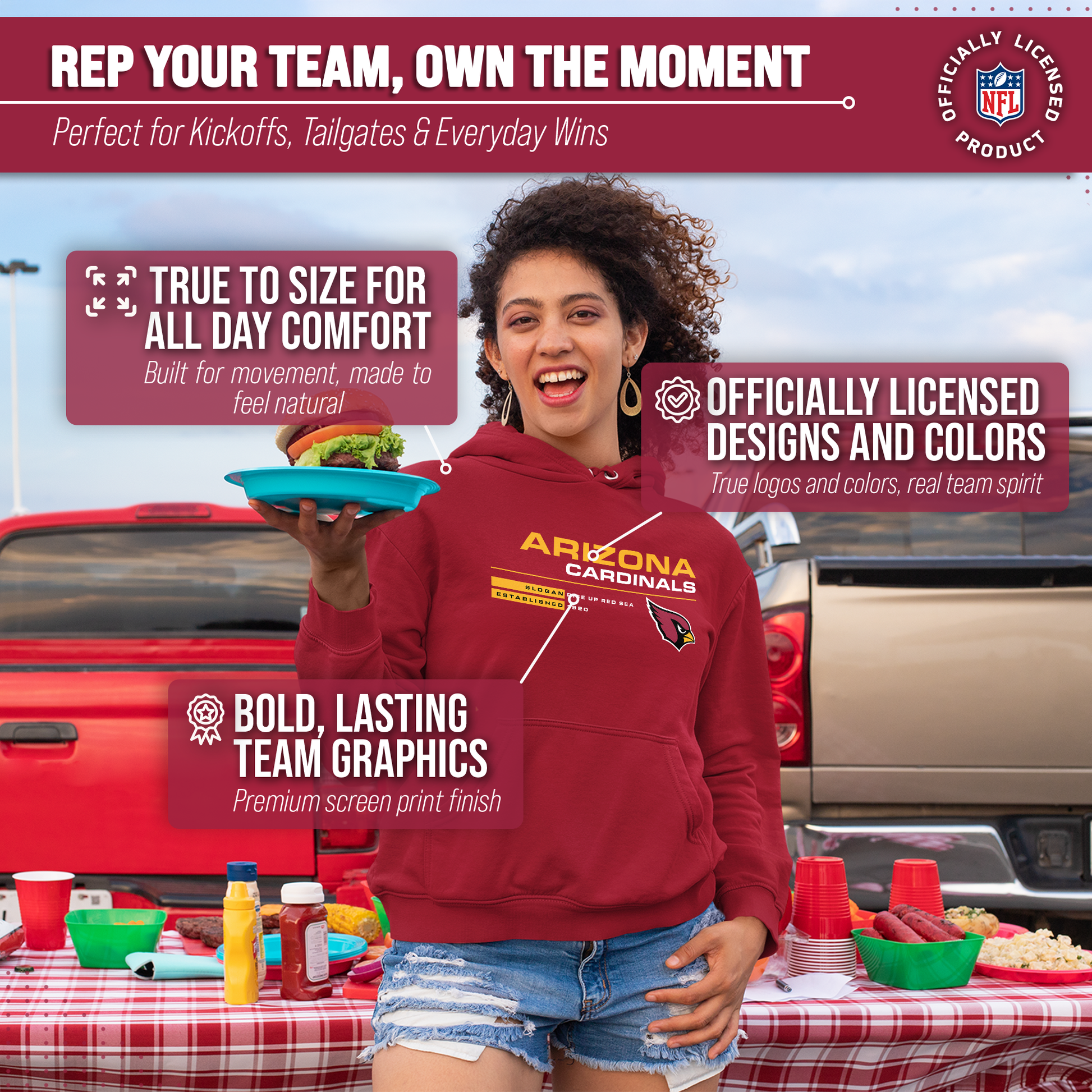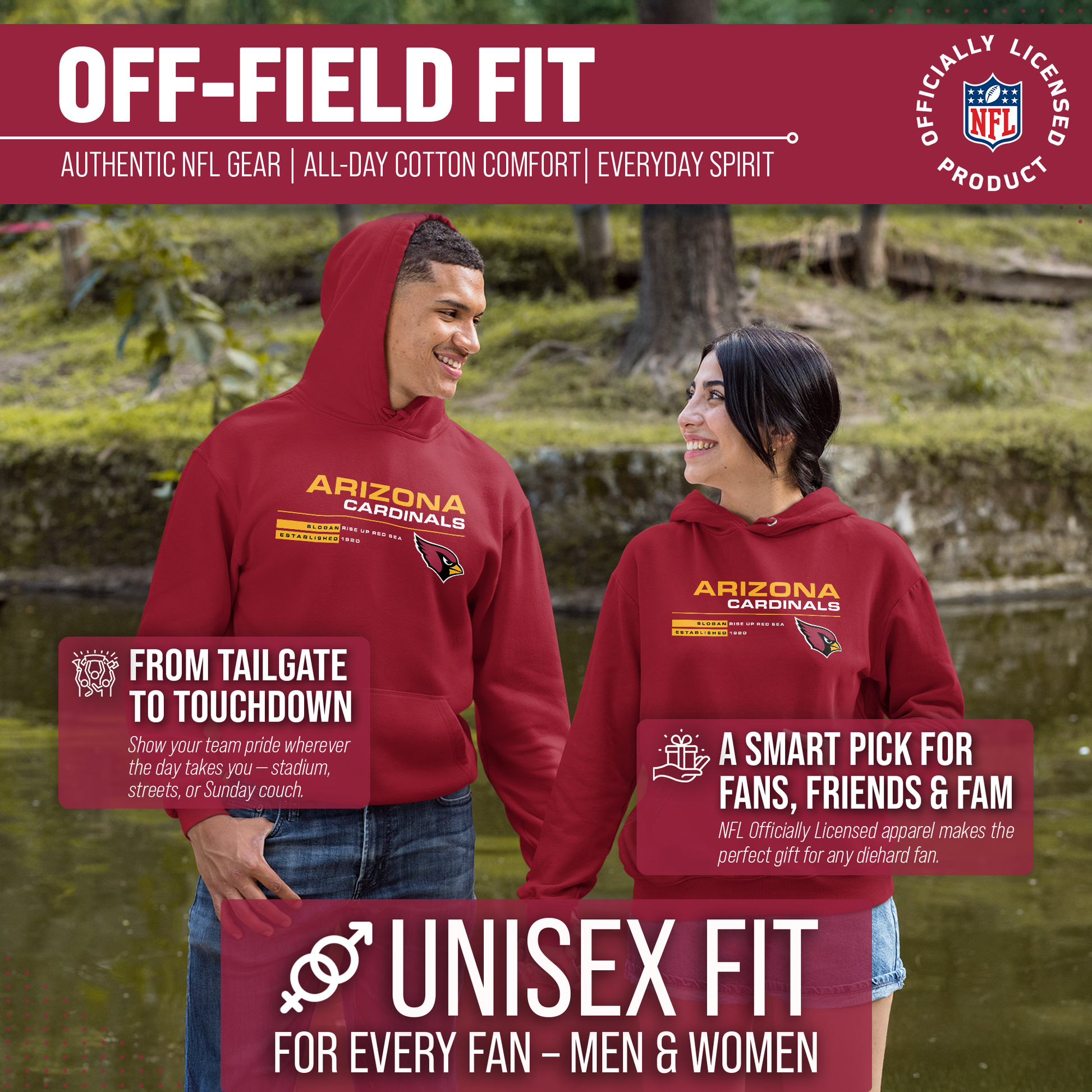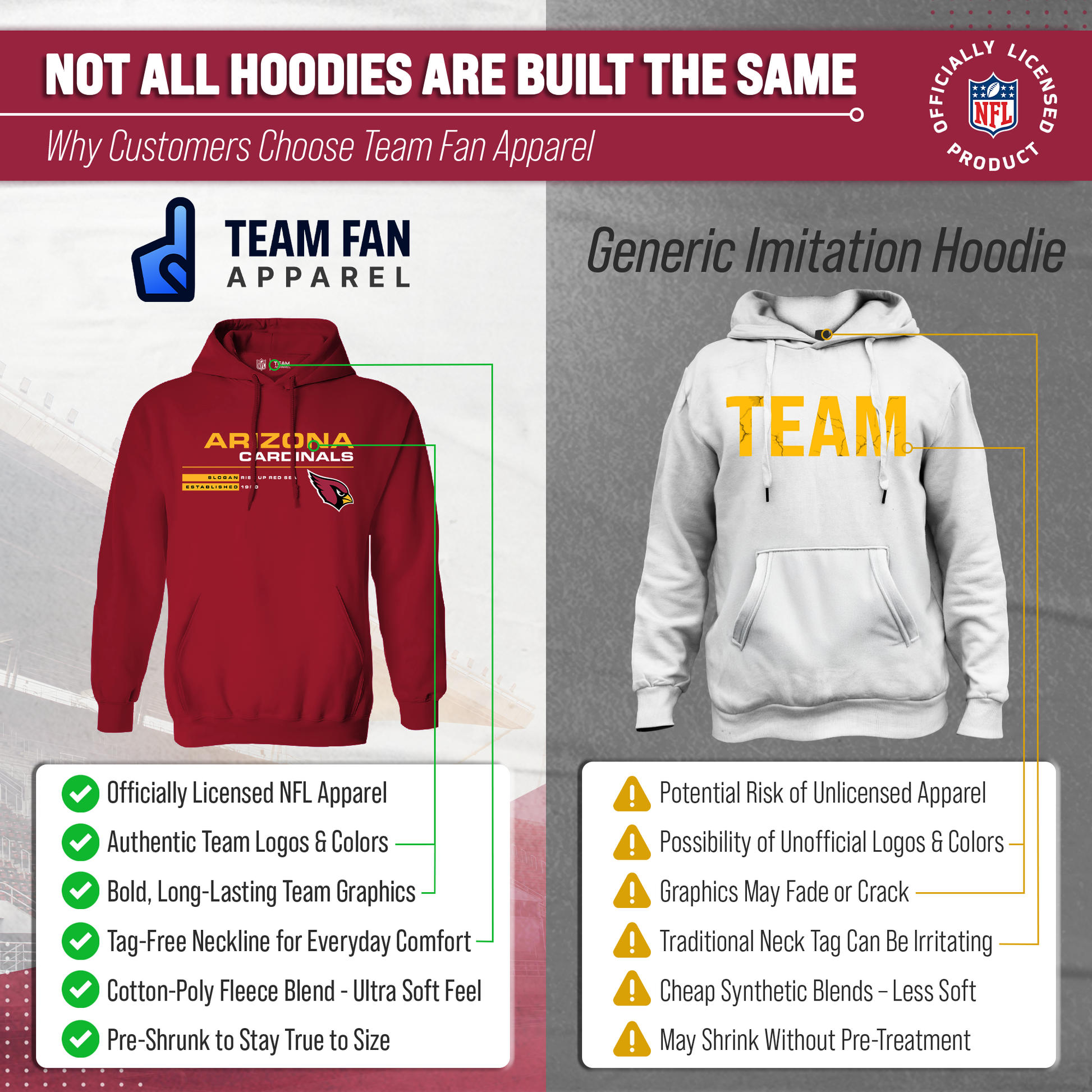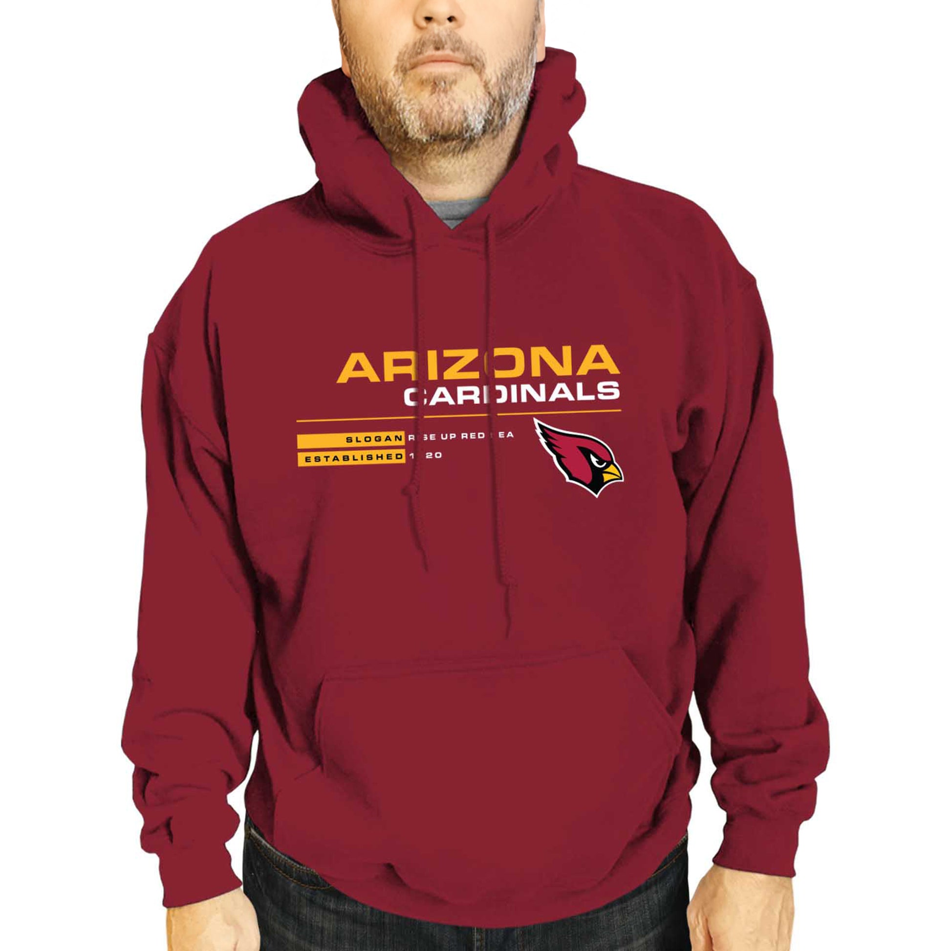 Score with Team Fan Apparel, the ultimate destination for officially licensed NFL apparel for men and women. We use only the highest quality screen printing techniques to bring you the most comfortable, durable, and stylish clothing possible. Go ahead and show your team pride at the big game or any time! This premium hooded sweatshirt fits both male and female adults and comes in small, medium, large, XL, and XXL. So needless to say, it fits Arizona Cardinals fans of all types! Maybe you aren't a Cardinals fan but you know someone who is? Don't worry! This high-quality sweatshirt is soft, lightweight but cozy, breathable and a GREAT gift for any birthday, anniversary, or Christmas gift; Father's Day, Mother's day, you name it! The front pouch pocket, drawstring hood, and soft fleece will keep you warm and keep your fandom hot! So, if you want to stand out as the #1 fan at the next big game, tailgate or watch party, you're going to want to be wearing one of these stat sheet hooded sweatshirts