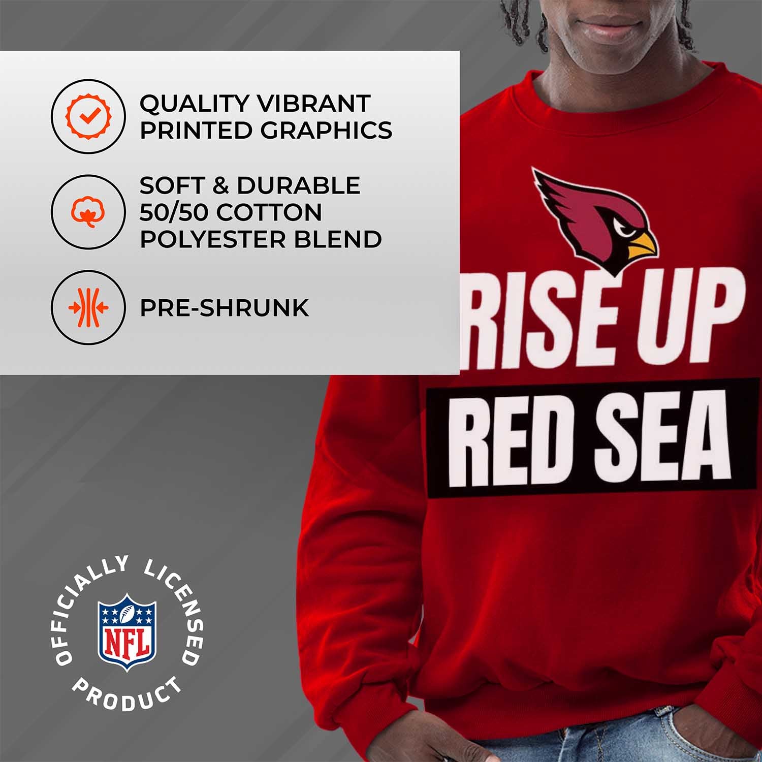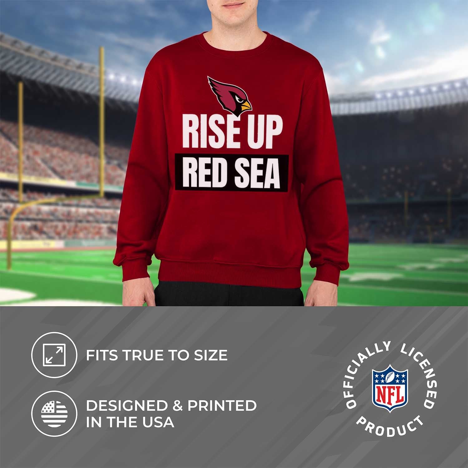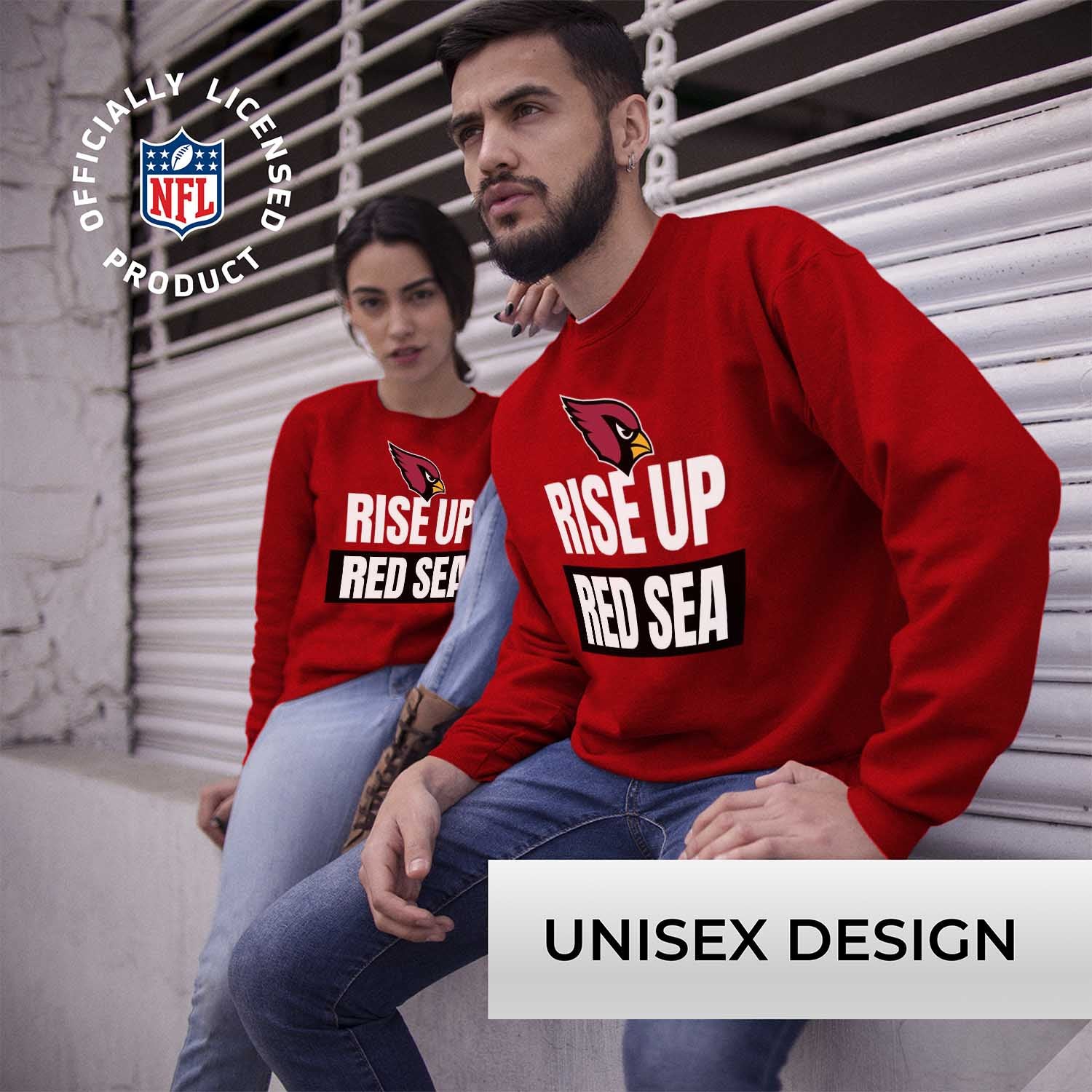 This Arizona slogan pullover crewneck sweatshirt is a cold-weather friendly jacket made from 50% ringspun cotton and 50% polyester. Our mens and womens football sweater is super comfortable, runs true to size, and is great for showing your team pride all year long. This comfy crewneck features the official Arizona Cardinals slogan; graphics will stay crisp and wear after wear and year after year. All colors and fonts are officially licensed and are of the highest of quality. These crew neck sweatshirts are made with air jet yarn for a softer feel and reduced pilling. This tagless slogan crewneck sweatshirt is perfect for tailgates, games, and showing off your team spirit. Our slogan pullover crewnecks are ideal Arizona gifts for men and women football fans. The unisex fit of our crewneck is ideal for both men and women. This slogan crew is essential apparel for protecting yourself from the elements at a football game. The fleece material, ribbed cuffs, and waistband keep all the warmth in, which means there's no need for an extra jacket in the fall months– our crew neck sweaters have you covered. This Arizona sweatshirt crewneck pullover is pre-shrunk and is ideal for that tailgate or game day when the temperature drops. Our crewneck pro football sweatshirts for women and men help you gear up and get ready to cheer the Arizona Cardinals to victory.