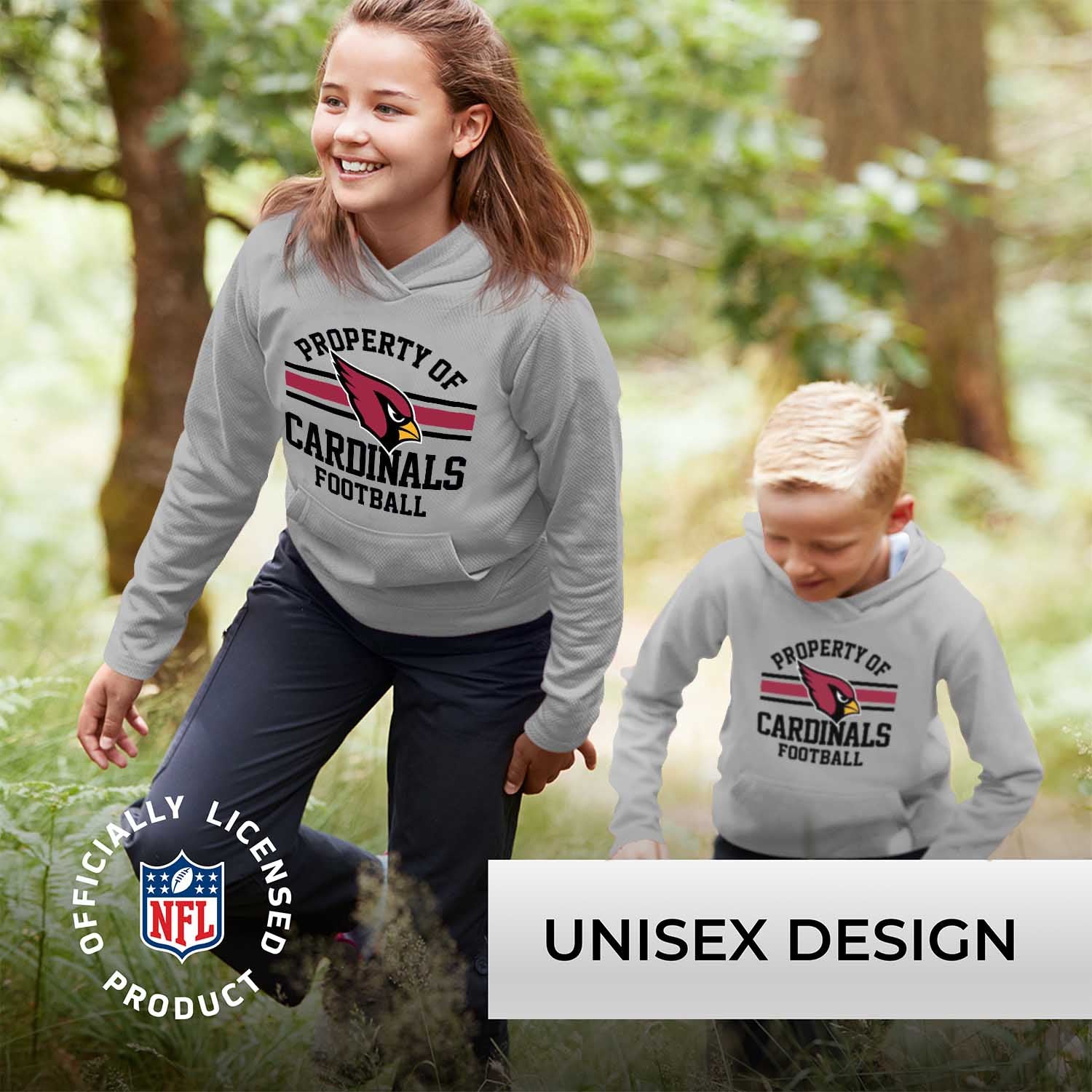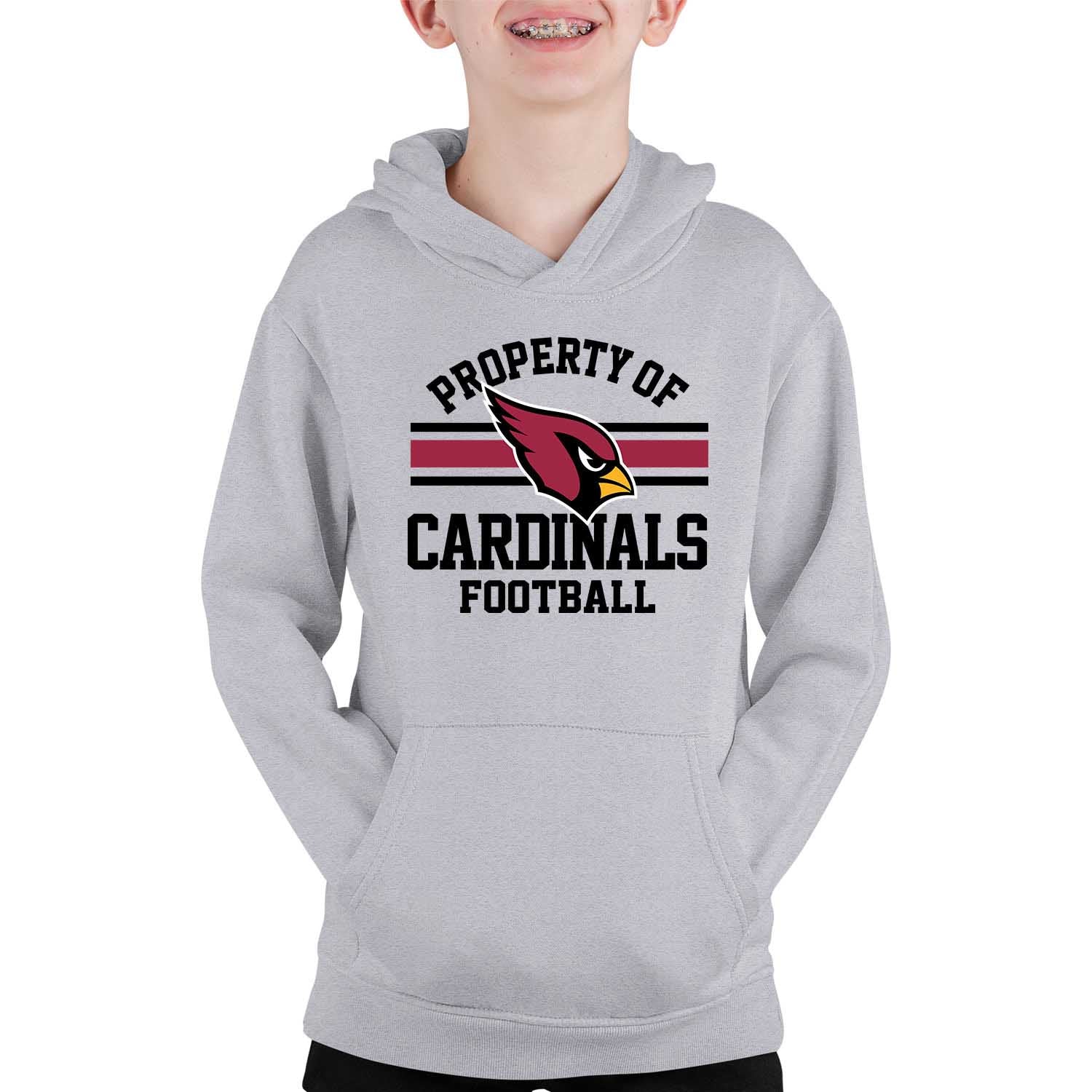 Our Property of Arizona Cardinals youth hooded sweatshirt is a pro football hoodie with 52% cotton and 48% polyester blended lining that features official Property of graphics. Our hoodies for boys and girls are super comfortable, run true to size, and are great for showing your Arizona pride all year long. The tagless Cardinals hooded sweatshirt is perfect for school, gamedays, and showing off your team spirit. Our pullover hoodies are ideal Arizona gifts for boys and girls football fans and the unisex fit makes them ideal for both boys and girls. The Arizona hoodie is essential kids apparel for protecting yourself from the elements. The blended material, ribbed cuffs, and waistband keep all the warmth in, so there's no need for a jacket in the fall months, our hoodie sweatshirts have you covered. These comfortable hoodies feature the official Arizona Cardinals colors and graphics. The graphics will stay crisp and wear after wear and year after year. This youth pro football sweatshirt is designed for comfort and features ribbed cuffs and waistband, and a spacious front pouch pocket. Show your team pride with this Property of Cardinals youth sweatshirt! This hoodie is made from a dual blend of cotton poly blend that is ideal for that tailgate or gameday when the temperature drops. The football sweatshirts for girls and boys help you gear up and get ready to cheer the Arizona Cardinals to victory.