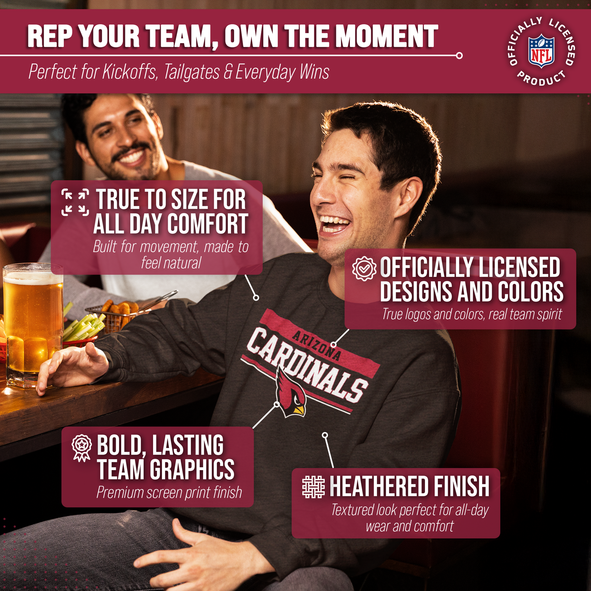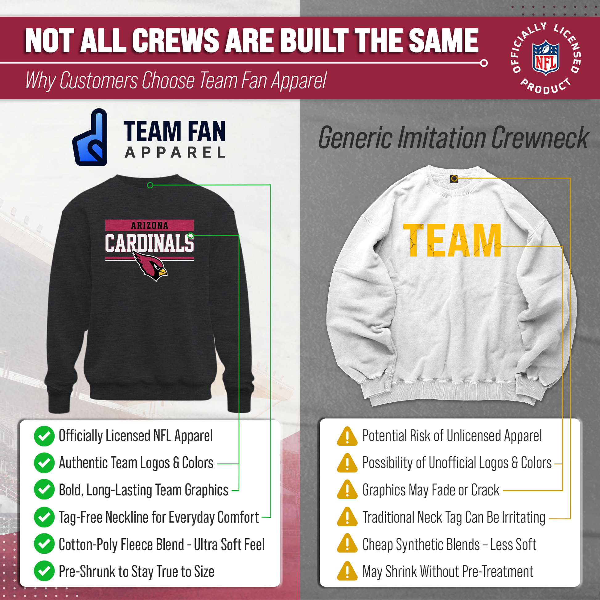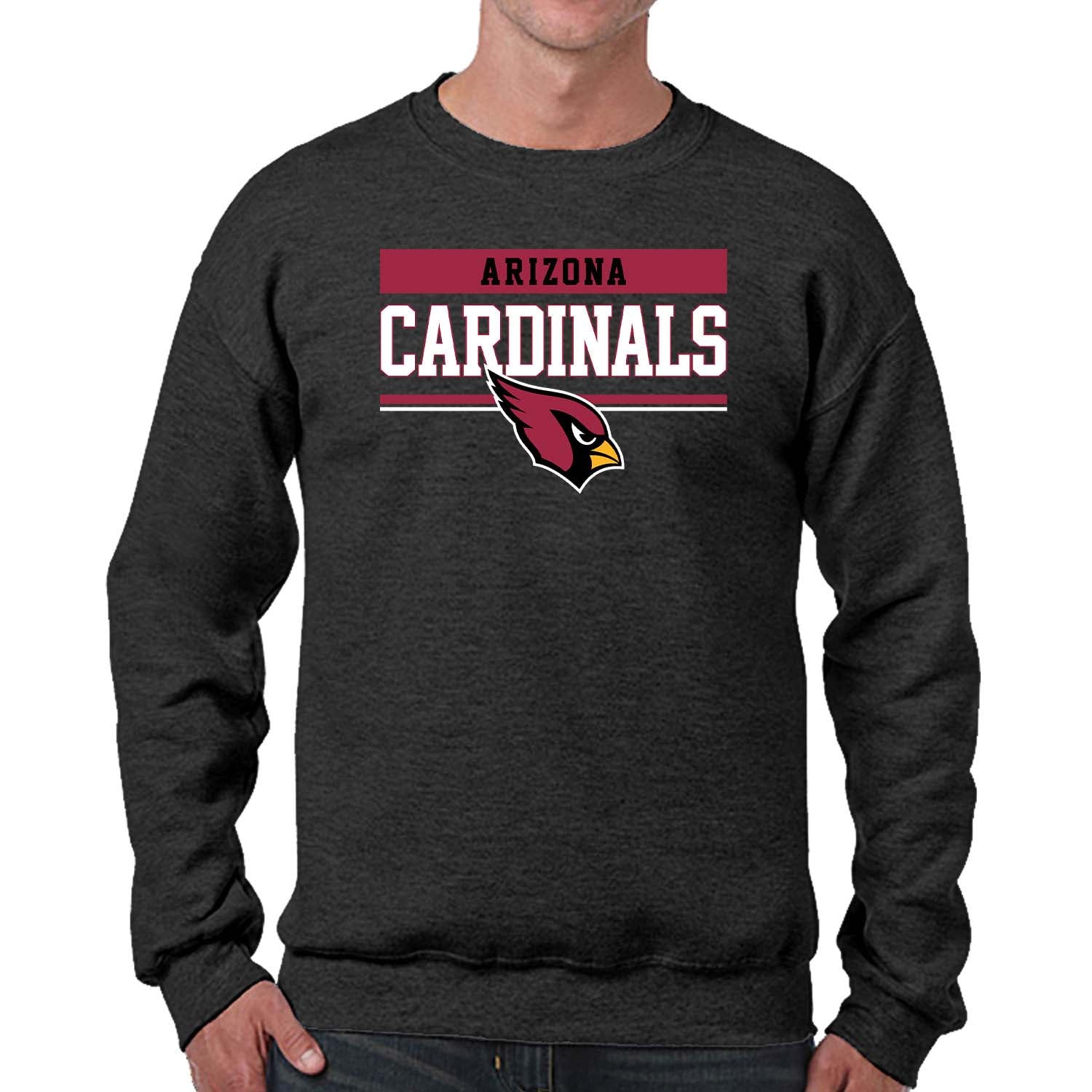 Our charcoal crew neck is a Arizona crewneck sweatshirt with a warm and toasty 9 oz fleece lining. It's the very best of Arizona Cardinals apparel, plain and simple. Gear up for your cold weather football game with confidence. Or, for women, bring it with you to games and tie it around your leggings in case the arena is a little chilly. Our football crew neck sweatshirts for men and women are super comfortable, run true to size, and are great for showing your team pride all year long. Plus, the unisex fit is ideal for both men and women and works as an oversized sweatshirt for kids. [Team_long] sweater for men and women features your teems thermal-printed emblem wordmark will stay crisp and clear, wear after wear. All colors and fonts are officially licensed and are of the highest of quality, it even comes with an officially licensed tag. Features: ribbed cuffs and waistband. This football sweatshirts crew in particular is perfect for tailgates, games, and showing off your team spirit. Gameday crewneck [team_ long] sweatshirts make a great birthday, Christmas (or any other holiday), or graduation gift for a sports fan. Gameday charcoal crewneck is essential apparel for protecting yourself and your loved ones from the elements. The fleece material will keep you warm through the colder months, and the pullover design allows you to feel embraced like a big oversized blanket. The Arizona Cardinals charcoal crew necks are pre-shrunk and are made from a dual blend of 50% cotton and 50% polyester that is ideal for that tailgate or game day when the temperature drops. Pair with your other favorite Arizona game day apparel! Say goodbye to cheap sweatshirts. Our charcoal sweatshirts for women and men help you gear up and get ready to cheer your team to victory.