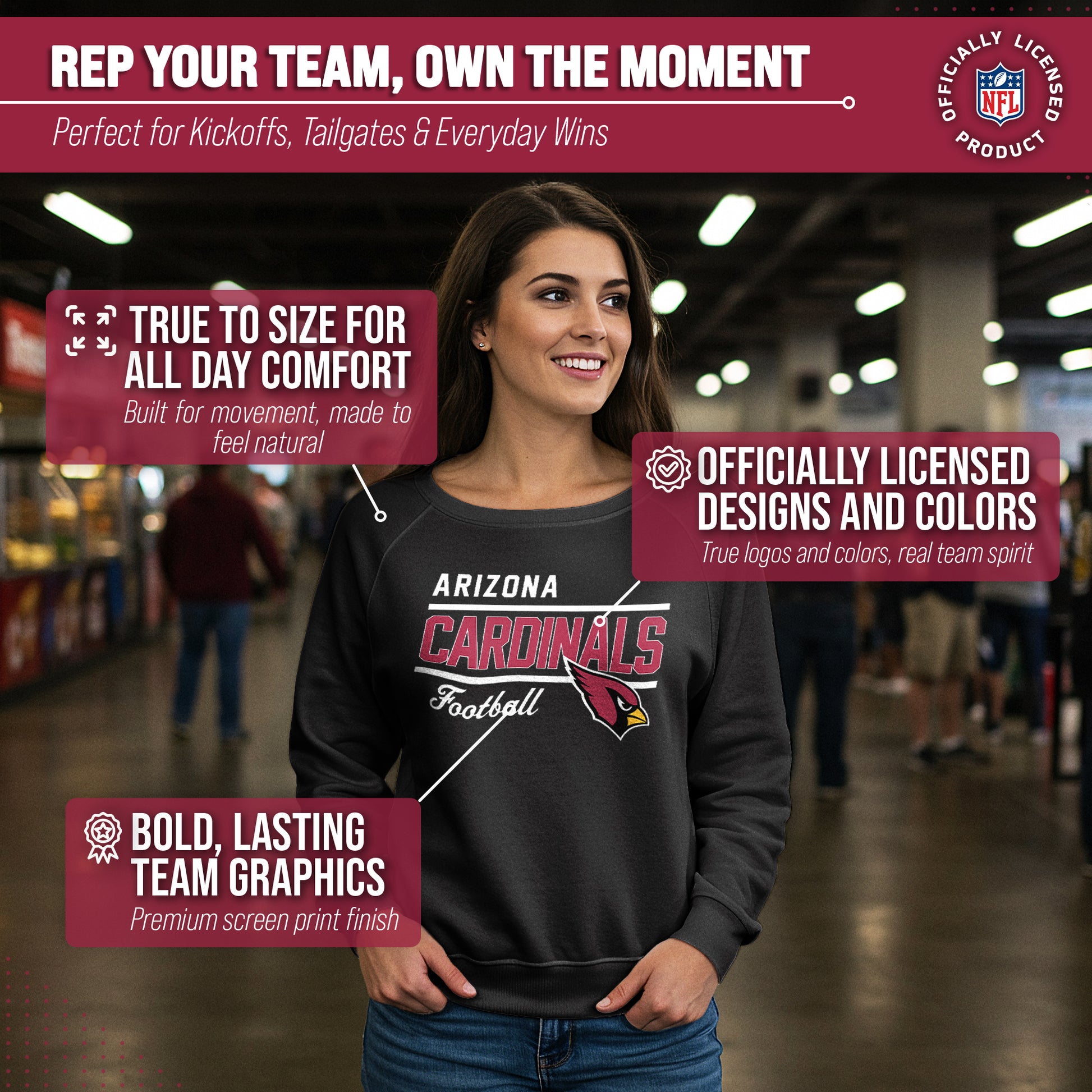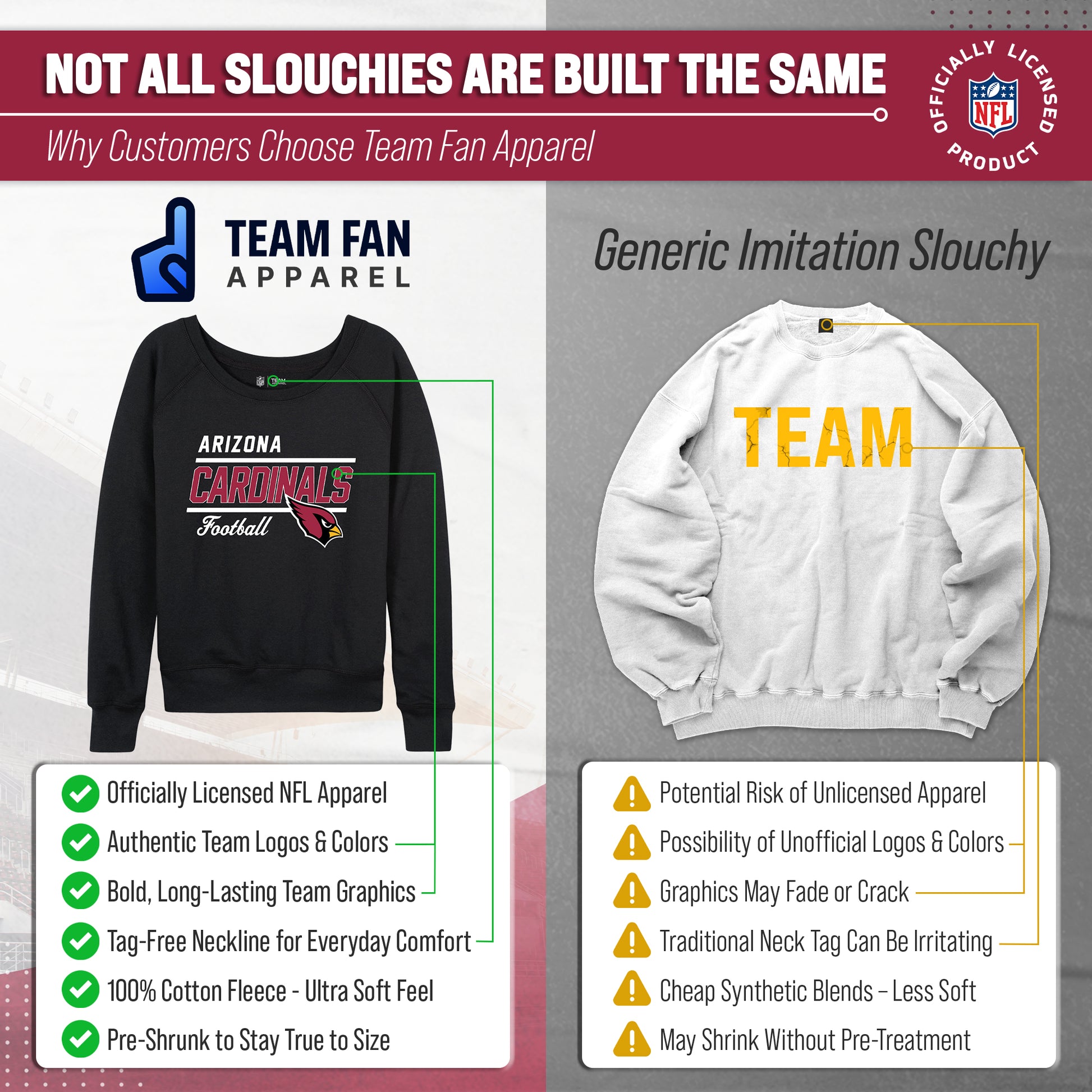 Our officially licensed Arizona Cardinals long sleeve crew neck pullover is super comfortable, runs true to size, and is great for showing off your Cardinals pride.     The high-quality thermal printed logo will look fresh after years of wear, making it a great alternative to wearing a Arizona Cardinals womens jersey. Our womens long sleeve Gameday crewneck has a relaxed fit for a casual, comfortable look. The long sleeve Cardinals crew will look great with shorts at tailgates in warmer months, or with jeans or leggings when it gets cooler. Layer it with a hoodie or even a Arizona football jersey when the weather gets cold. Available in plus sizes up to 3XW, this is a Arizona Cardinals pullover that women who are plus size or straight size will feel comfortable in.       If you're looking to give the gift of ladies Cardinals apparel, our long sleeved Arizona Cardinals Slouchy Crew is the perfect gift. Officially licensed to ensure no counterfeit designs or colors, these Arizona crews for women are perfect for super fans. Made from a cotton poly blend to keep you comfortable, the womens raglan long sleeve Gameday Slouchy Crew will definitely become one of your favorite pieces of Arizona Cardinals apparel.