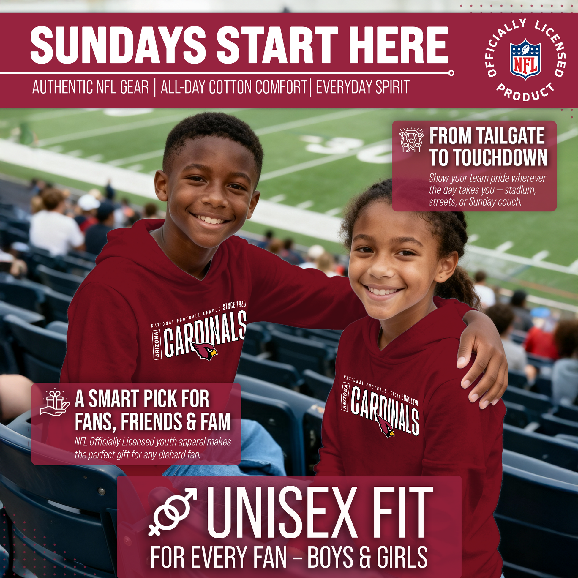 Hey there, young sports fans! Get ready to show off your team spirit with the Team Fan Apparel Arizona Cardinals Youth Modern Endzone Football Fleece Hooded Sweatshirt! Made from a soft and cozy cotton polyester fleece, this sweatshirt is perfect for staying warm on game day or any day. The unisex design makes it suitable for both boys and girls, and its tag-less feature ensures ultimate comfort all day long. Featuring an original modern endzone design that proudly displays your team's colors and logos, this youth hoodie will be turning heads everywhere it's worn. The front pouch pocket and fleece hood will keep you warm on those cold game days as you cheer on your Cardinals! Just pull it on and go! So whether you're at the stadium or hanging out with friends, make sure you're representing your team in style with our NFL youth apparel. Printed and designed in the USA, have confidence your sweatshirt will last! Order now and get your future pro geared up to be the next super fan!