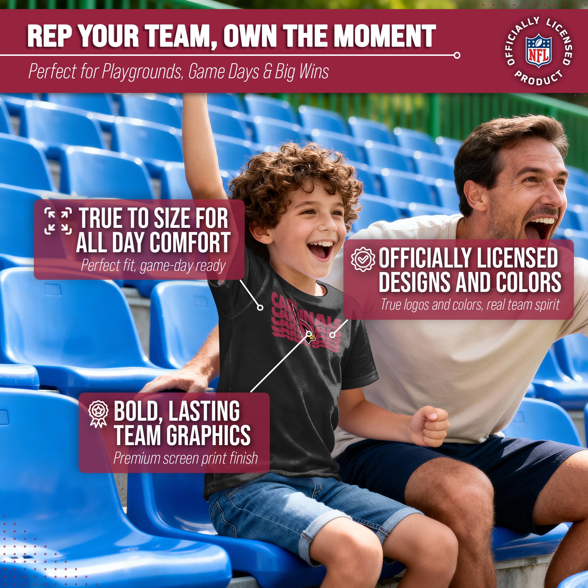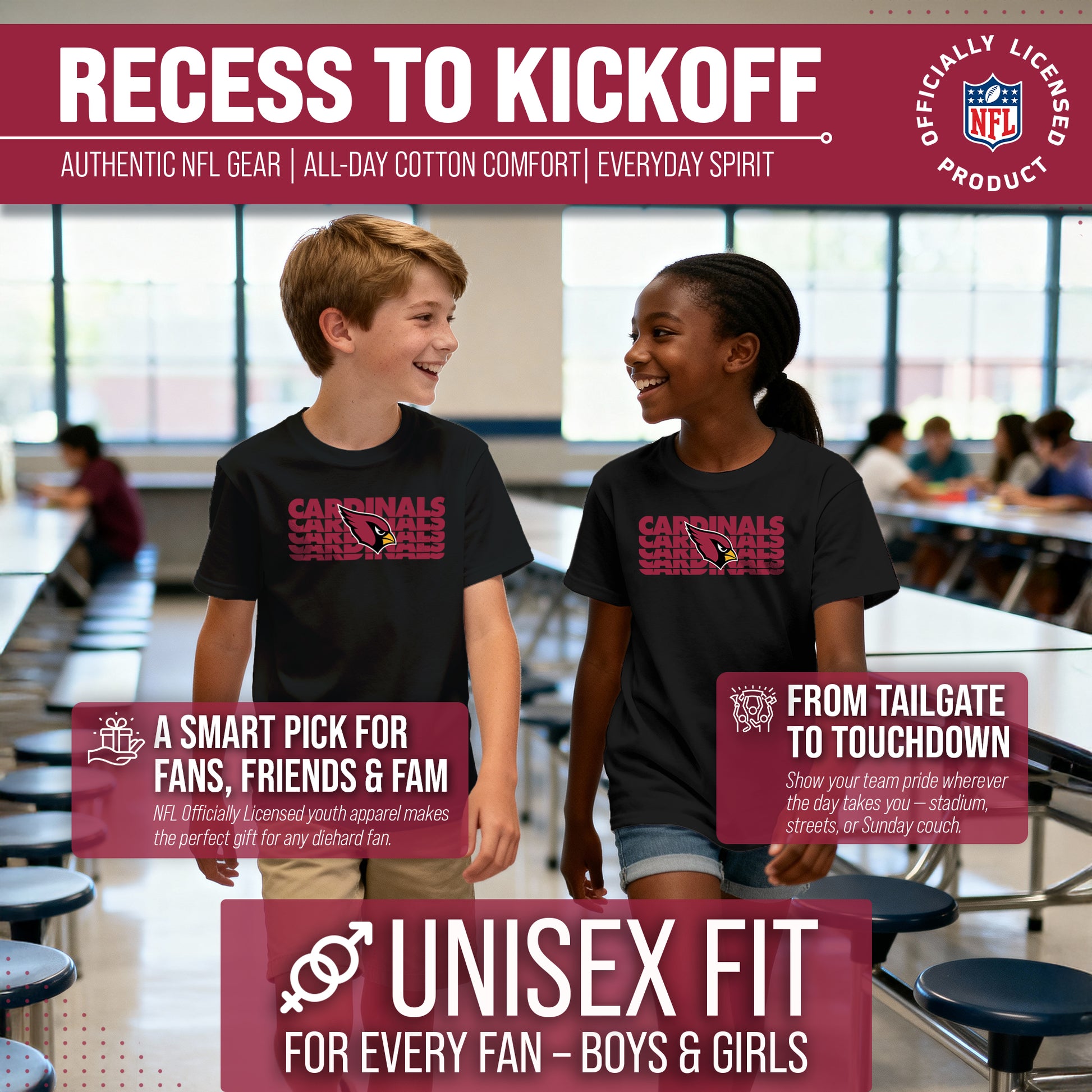 Arizona Cardinals NFL Youth Repeating Logo Football T-Shirt Unisex Tag Free Comfortable - Black