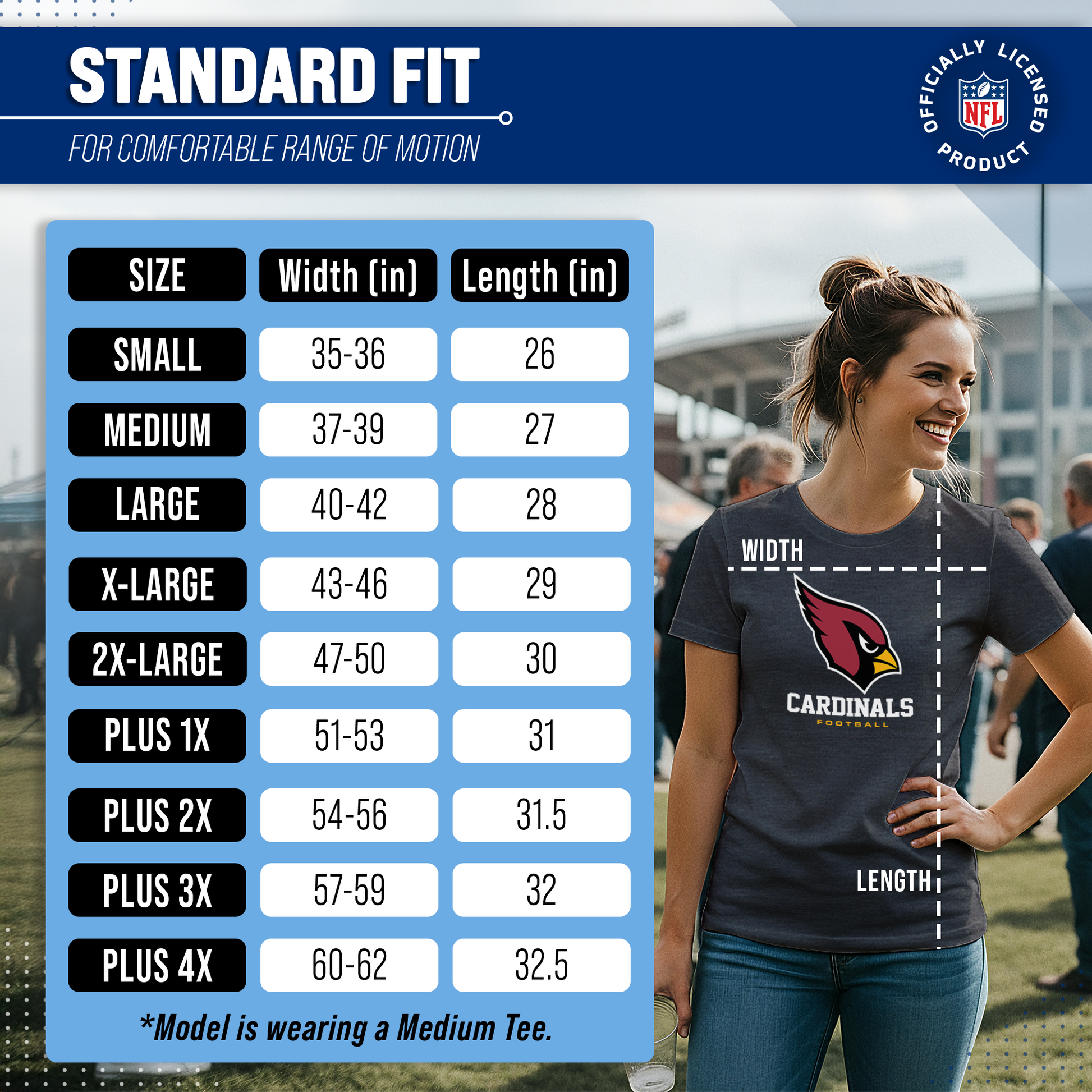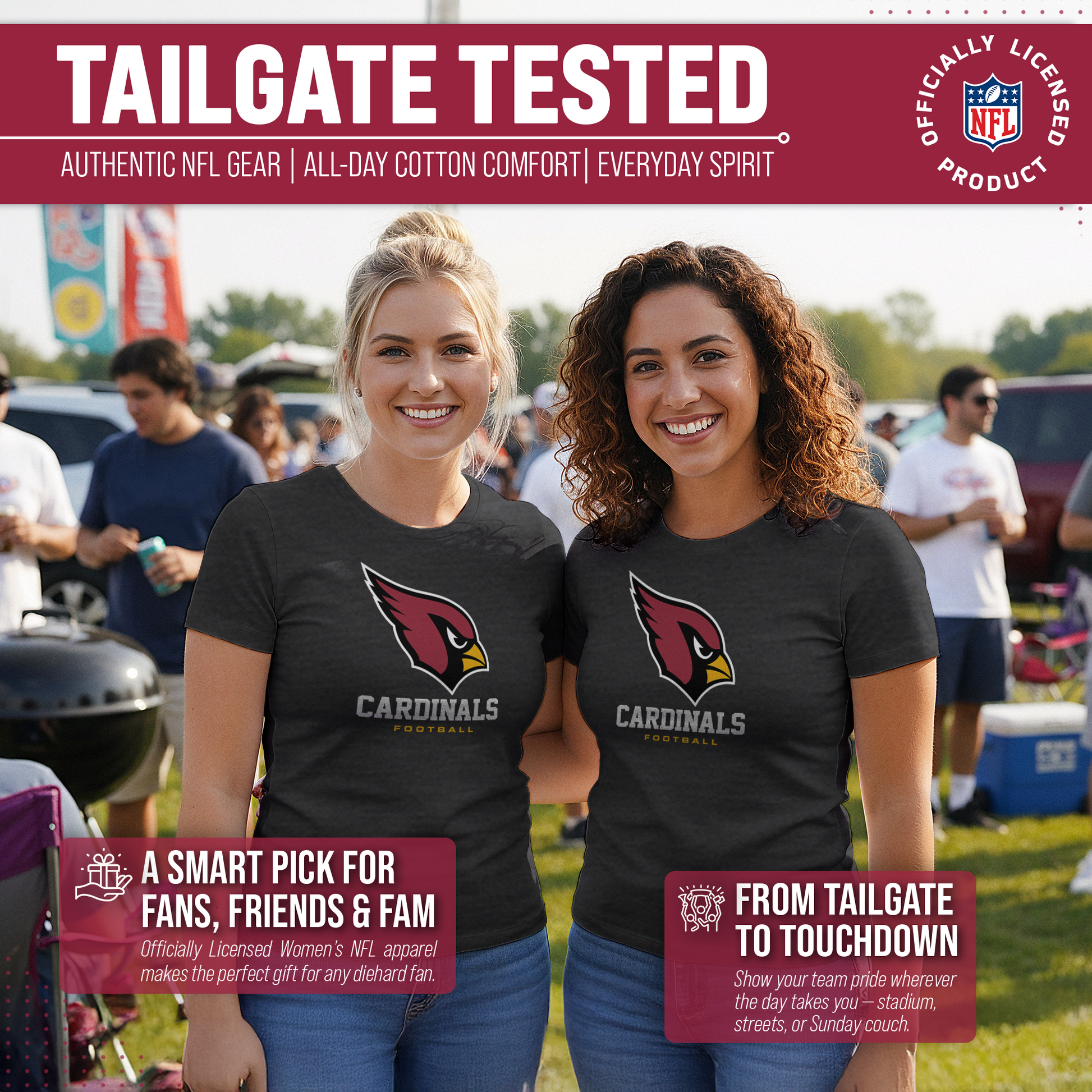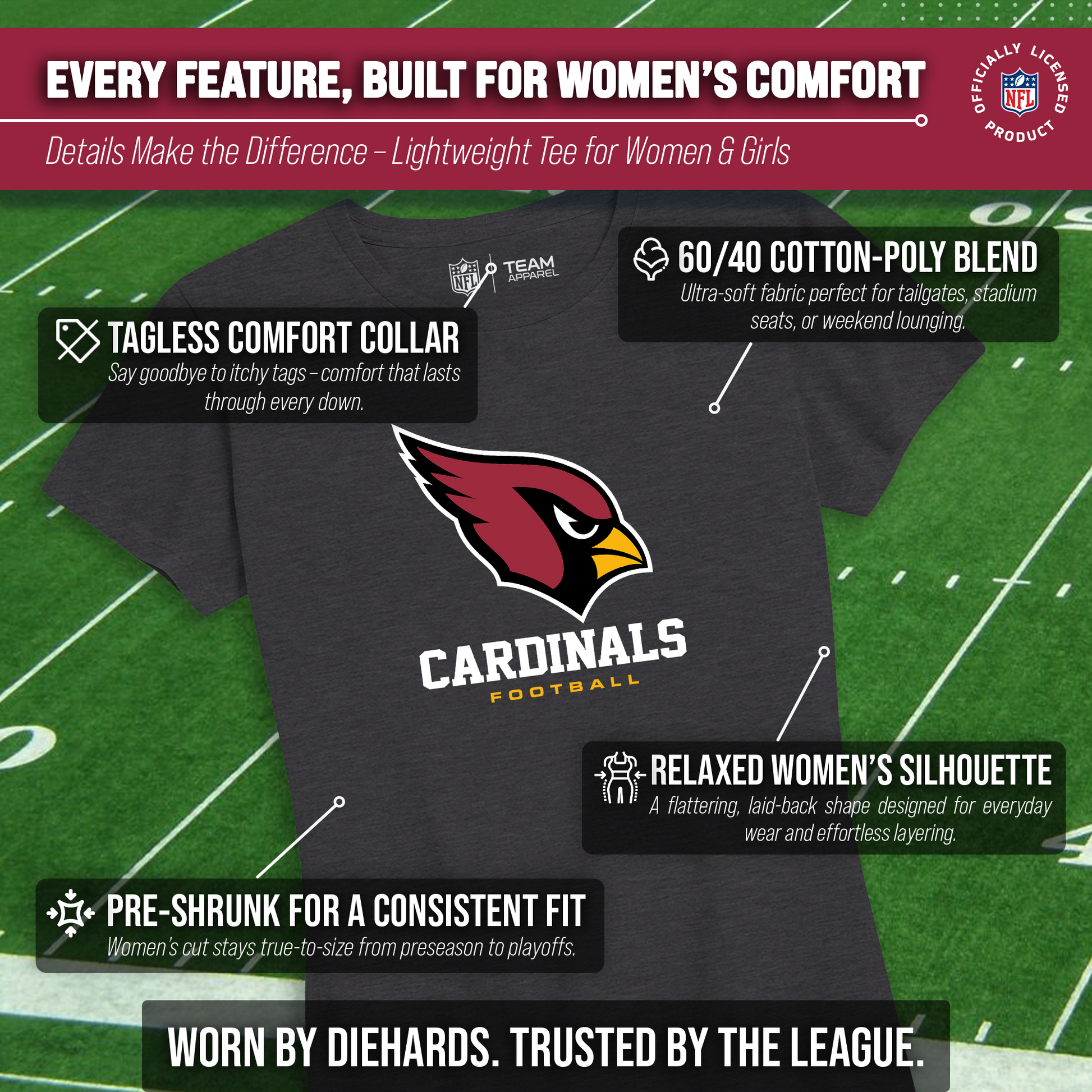 Score with Team Fan Apparel, the ultimate destination for officially licensed NFL apparel for men and women. We use only the highest-quality screen printing techniques to bring you the most comfortable, durable, and stylish clothing possible. Go ahead and show your team pride at the big game or any time! This premium womens t-shirt comes in small, medium, large, XL, and XXL. So needless to say, it fits Arizona Cardinals fans of all types! Maybe you aren't a Cardinals fan but you know someone who is? Don't worry! This high-quality t-shirt is soft, lightweight, breathable, and a GREAT gift for any birthday, anniversary, Mother's day, Valentine's day, or Christmas gift! So, if you want to stand out as the #1 female fan at the next big game or watch party, you're going to want to be wearing one of these Arizona Cardinals Women's Big Logo t-shirts.