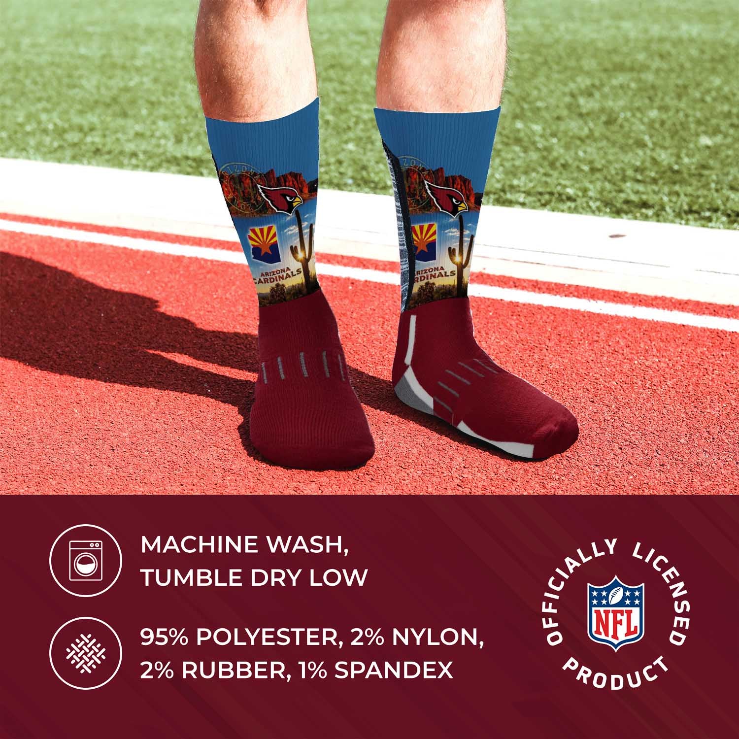 These Arizona Cardinals location socks for boys and girls are great for showing off your Cardinals pride from head to toe. The unisex Arizona socks youth and adult are comfortable, and fit most youth sizes The crew length and poly-spandex blend featuring a supportive formed heel make them a comfortable choice for showcasing your love for your team all year long. Location socks are a great addition to a collection of Arizona Cardinals stuff. Wear them with shorts, your favorite jersey, and Arizona Cardinals shoes for a superfan look, or rock them in the office for an alternative to argyle on themed school spirit days. On a lazy day, wear them with yourpajamas and Arizona Cardinals house shoes while you put your feet up and enjoy a game from home Arizona Cardinals crew socks make great gifts for all ages, and make the perfect birthday or holiday gift for any young Cardinals fan The officially-licensed team logo, colors, and graphics make these socks the Arizona socks boy and girl superfans will love. Fabric content is 95% polyester, 2% nylon, 2% rubber, and 1% spandex. Machine washable, tumble dry low.