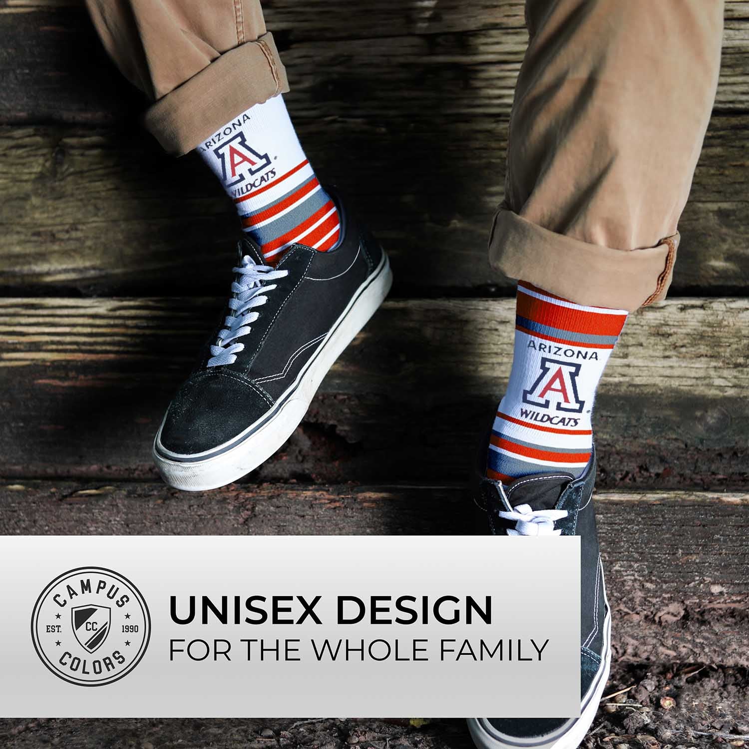 These Arizona Wildcats socks for men and women are great for showing off your Arizona pride from head to toe. The unisex socks are comfortable enough to wear to the gym, the game, the tailgate, or nowhere at all. The crew length and poly-spandex blend featuring a supportive formed heel make them a comfortable choice for showcasing your love for your team all year long. Wildcats socks pair well with Arizona shoes and are great additions to any collection of Arizona Wildcats stuff. Wear them with shorts, your favorite jersey, and Arizona shoes for a super fan look, or rock them in the office for an alternative on casual Friday. On a lazy day, wear them with your Arizona underwear or pajamas while you put your feet up and enjoy a game on your tv at home. These Arizona crew socks make great gifts for all ages, perfect father's day gift, birthday gift, or holiday stocking stuffers. The officially-licensed team logo, colors, and graphics make these Arizona Wildcats socks the socks women and men will love forever. Fabric content is 95% polyester, 2% nylon, 2% rubber, and 1% spandex. Machine washable, tumble dry low.