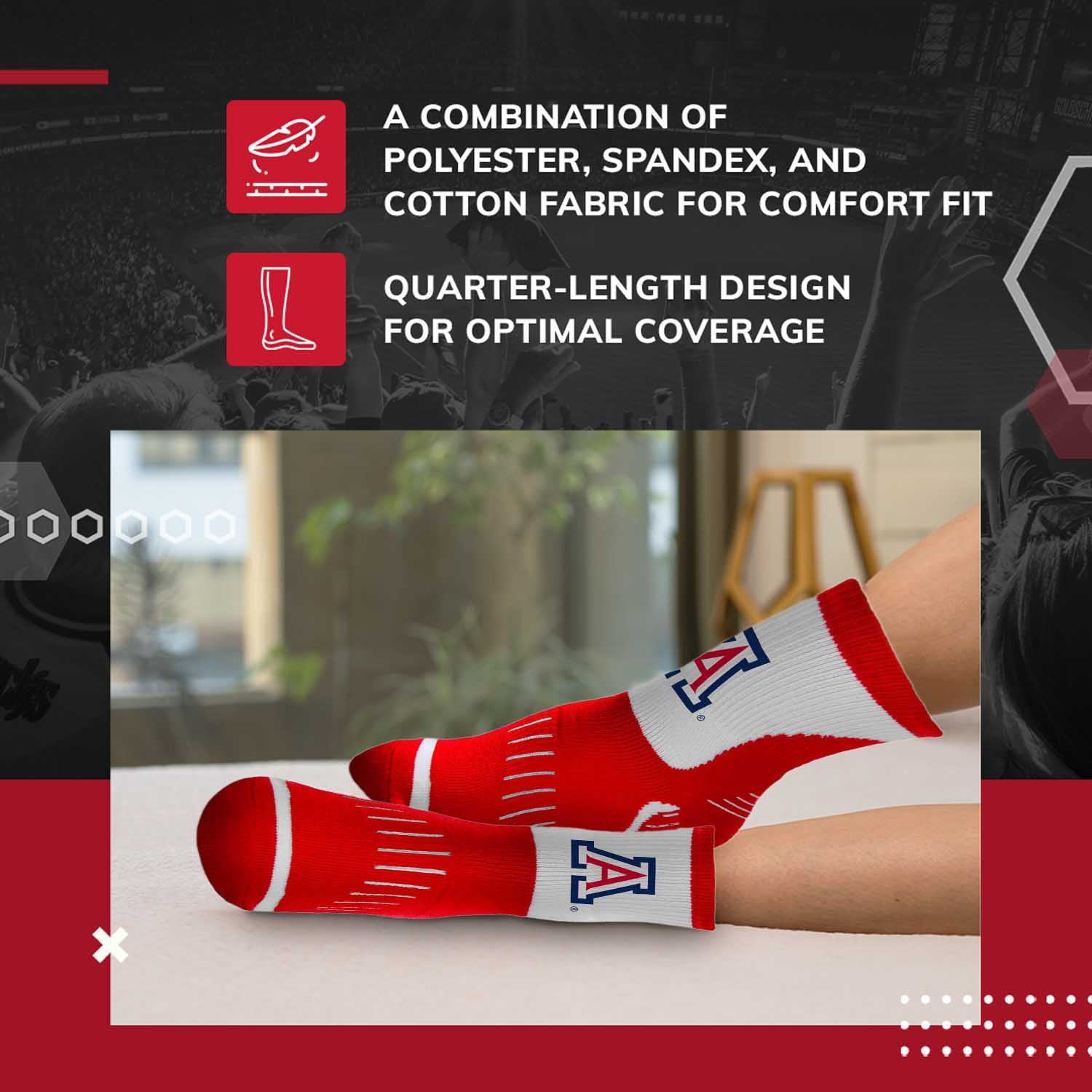These Adult Surge Quarter Length Socks are the perfect way to show your team spirit on game day or any day. When you are rooting for Arizona Wildcats these socks are the perfect complement to any apparel for both mens and womens. As the must have Arizona gifts, these Arizona socks complement your Wildcats clothing all year long and when watching college football Arizona. Coordainates with Arizona attire for men.
