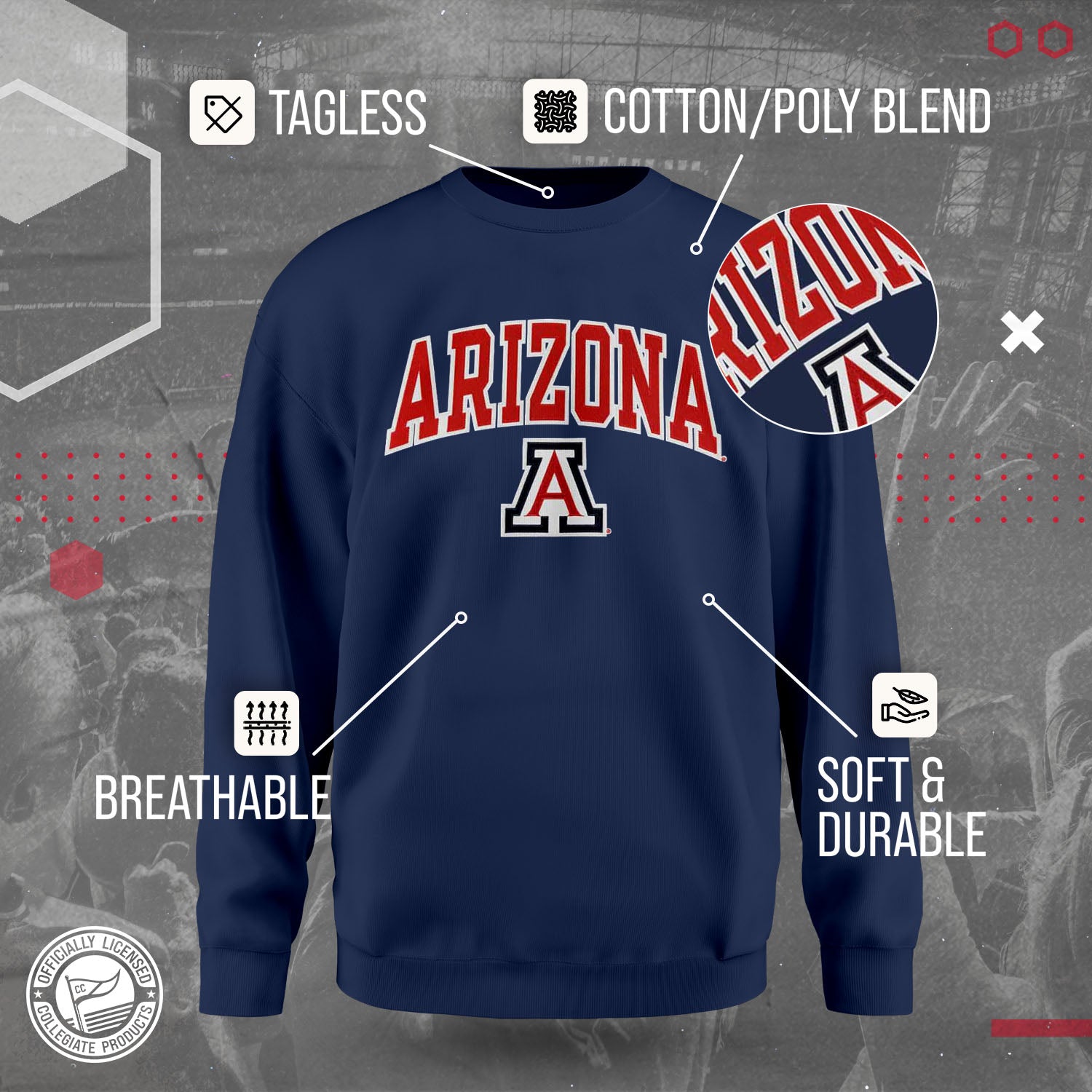 The Arizona Wildcats Adult Tackle Twill Crewneck Sweatshirt is super comfortable, runs true to size, and is great for showing off your school pride. All crewneck pullovers are a fan favorite and look fresh after many years. The Wildcats crewneck sweatshirt has a unisex fit that is ideal for both men and women. The embroidered university logo and name will stay crisp wear after wear. Our college crewneck sweatshirt is ideal when thrown over a t-shirt for football tailgates, games, when the temperature drops, or when you just want to show off your team spirit! The university crewneck sweatshirt is the perfect gift for any college student, upcoming graduate, alumnus or sports fan. Made with quality material, the double letter embroidered university logo is made of precise laser cut appliques applied with heat that will stay crisp wear after wear. All logos and colors are NCAA officially licensed. Our Arizona Wildcats crewneck is essential collegiate apparel for showing off your school or team pride. Lightweight college crewneck sweatshirt is made from a dual blend of 50% cotton and 50% polyester that is ideal for that tailgate or game day when the temperature drops. Cheer on your Wildcats in style!