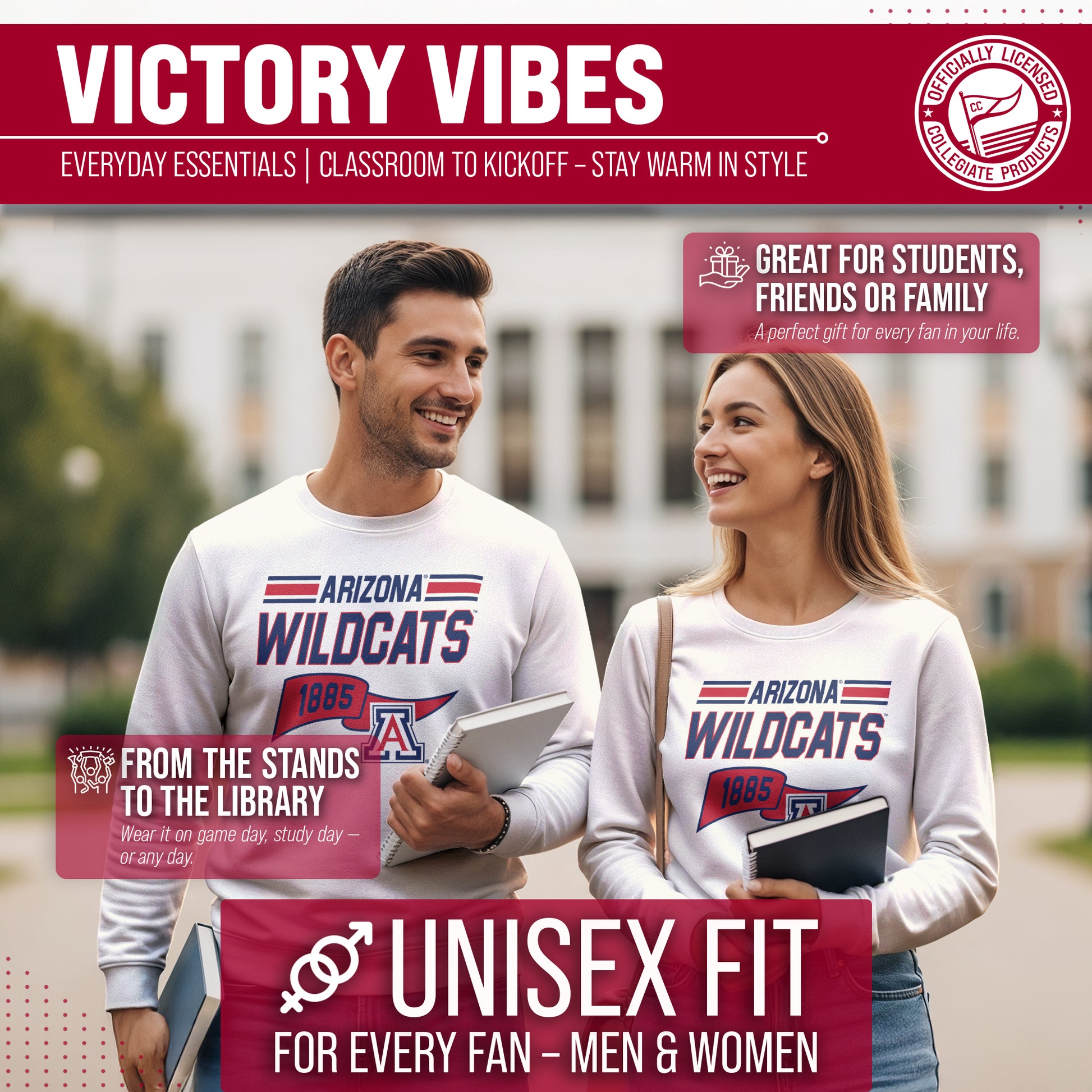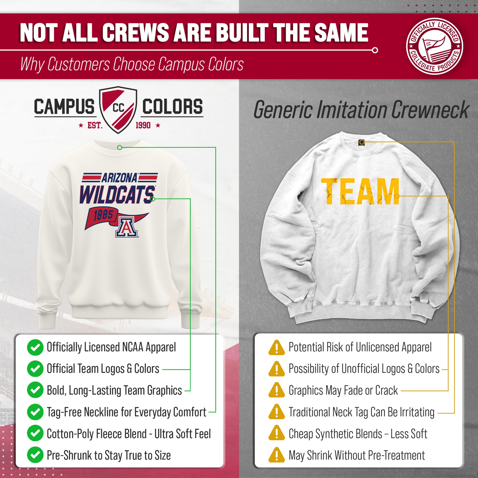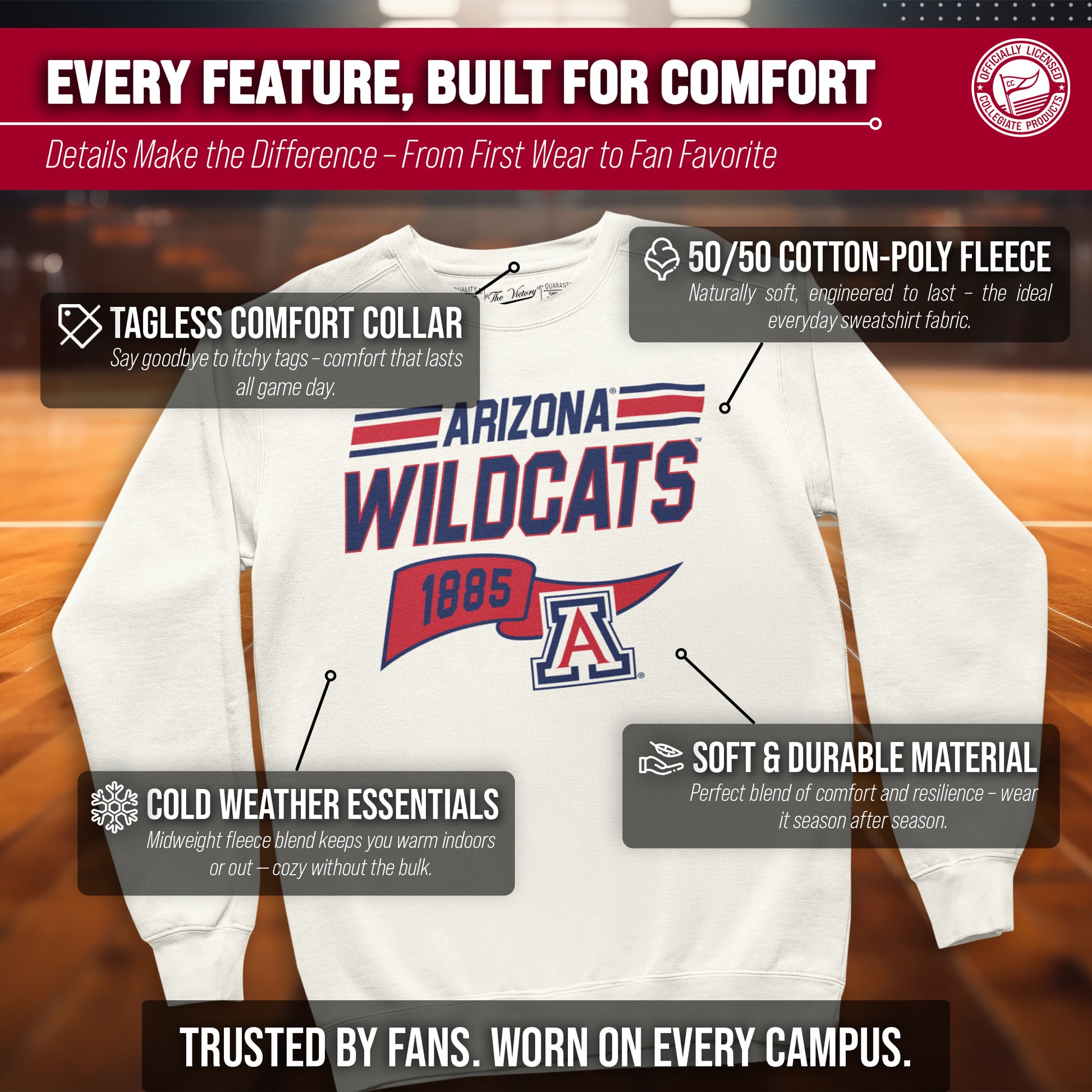 Show off your team spirit and stay warm in the NCAA Adult Unisex Varsity Club Pennant Arizona Wildcats Crewneck Fleece Sweatshirt! This cozy sweatshirt is perfect for any Arizona fan, with its vibrant colored pennant design. Made from a comfortable cotton poly fleece fabric, this Wildcats crewneck sweatshirt features long sleeves, ribbed wrists and waistband, and will keep you warm on chilly days! But that's not all - you can wear this Arizona sweatshirt game after game without worrying about wear and tear. It's the perfect addition to your college team apparel collection, whether you're cheering on your team at the stadium or just lounging at home. It is the number one Arizona item you'll want to have on the next cold game day! So why settle for a plain old sweatshirt when you can show off your love for Arizona Wildcats in style? Get your NCAA Adult Unisex Varsity Club Pennant Crewneck Fleece Sweatshirt today for yourself or any Wildcats fan in your life and be confident know that you are rocking the most authentic and official gear!