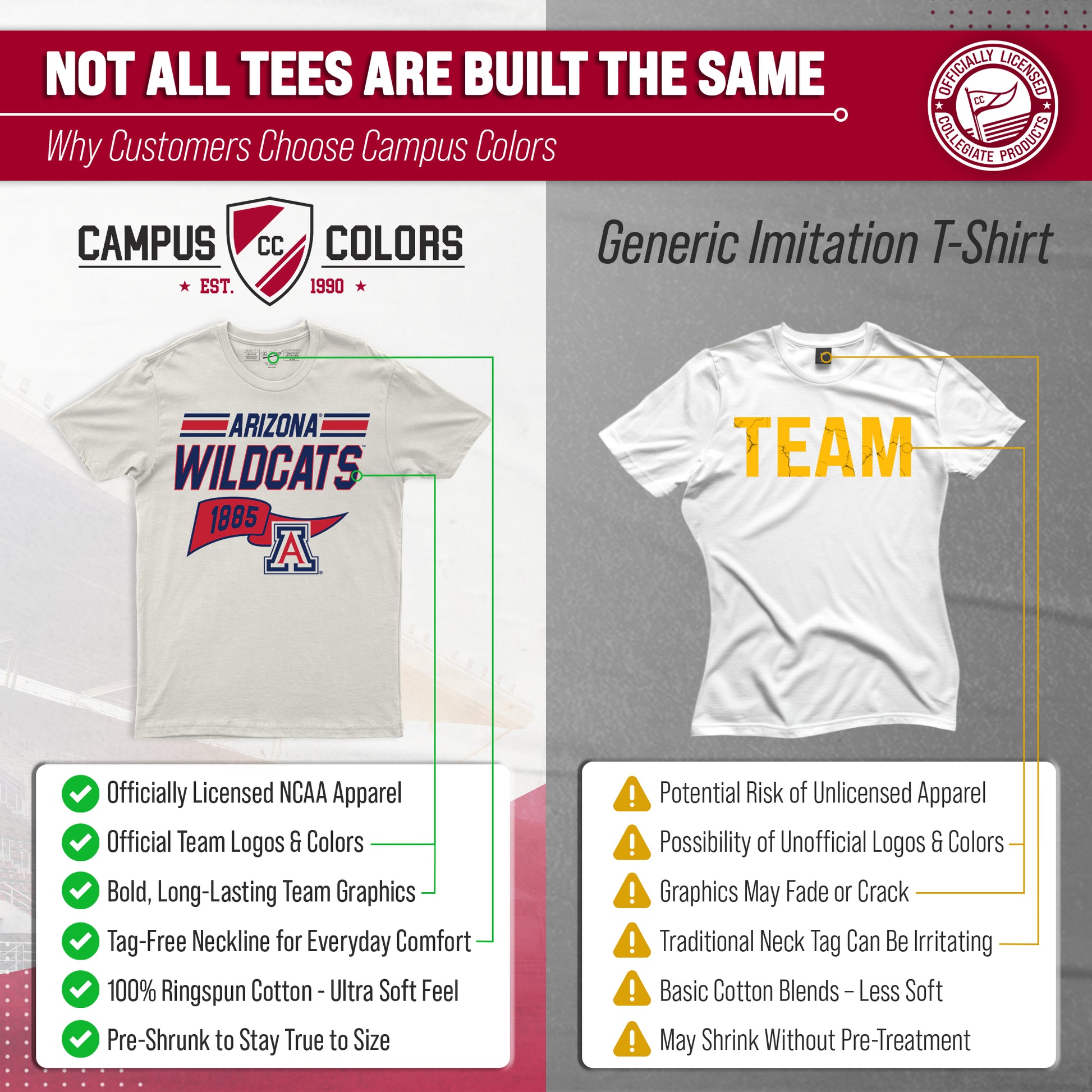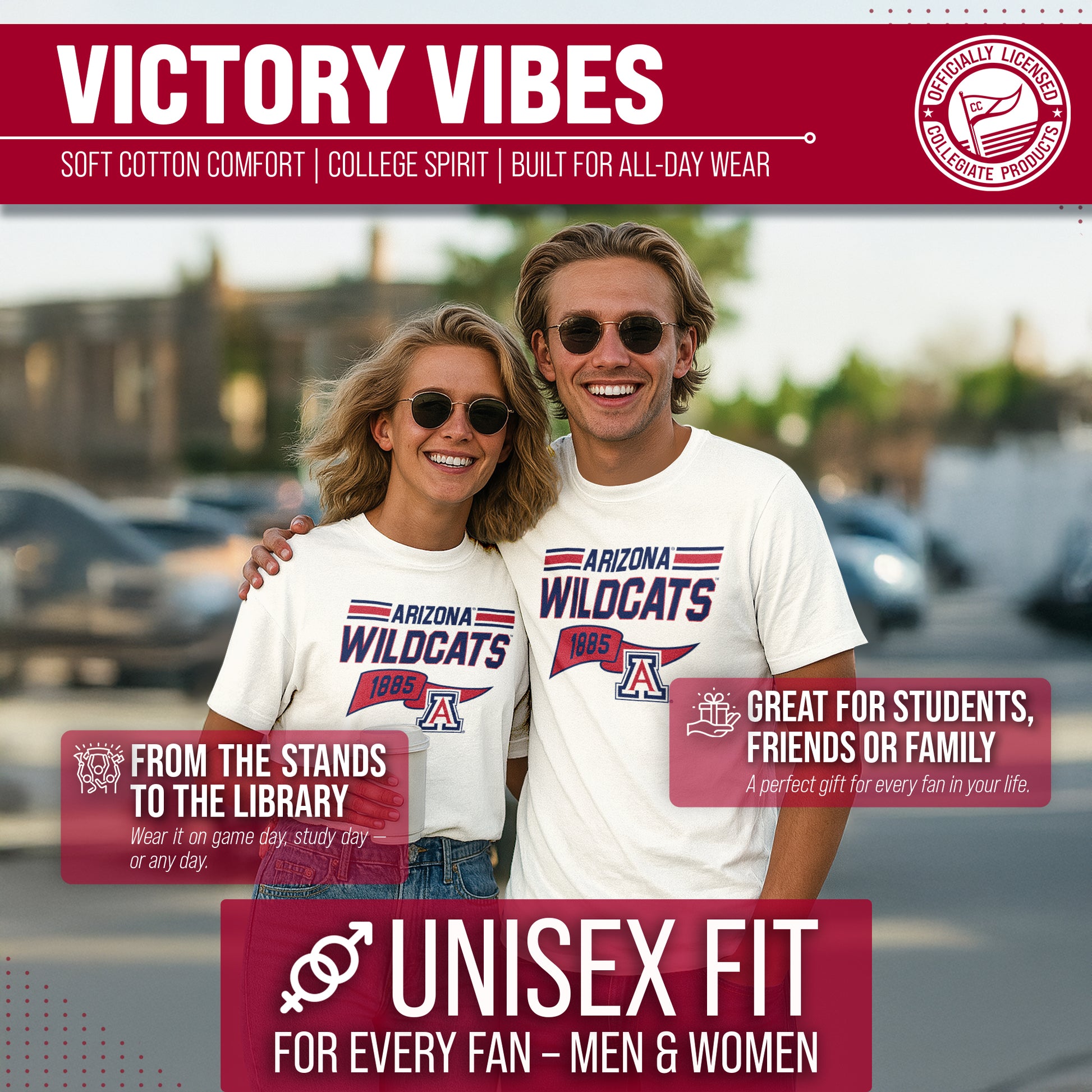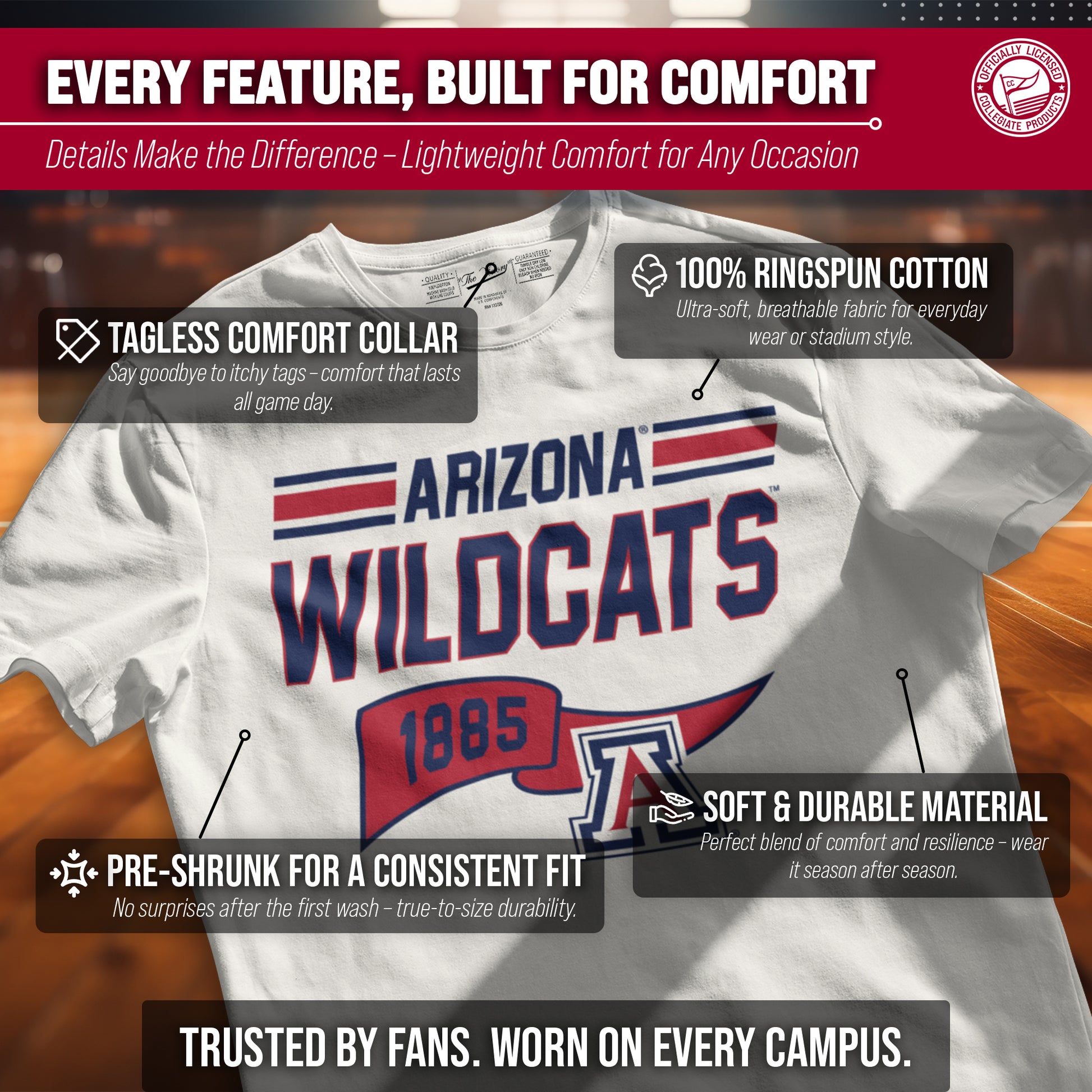 Go Team, Go! Show off your school spirit with the NCAA Adult Unisex Varsity Club Arizona Wildcats Pennant T-Shirt! Our officially licensed apparel will have you feeling like a member of the team! Made from comfortable and breathable cotton and featuring a neutral color garment, this t-shirt is perfect for game days, tailgates, or just lounging around. The tag-less design ensures ultimate comfort and no annoying tags to distract you from cheering on your team. Perfect for wearing to the big game, watching from home, hanging with friends, or even working out! Our Varsity Club Arizona Wildcats shirt makes a great gift for yourself, or any Wildcats fan in your life! Our shirts are made from ringspun cotton for a soft feel against your skin and feature a classic retro pennant design of your favorite college team. With short sleeves and a variety of sizes to choose from, these t-shirts are perfect for men and women alike. So gear up for game day with the NCAA Adult Unisex Varsity Club Pennant T-Shirt - the perfect addition to any Arizona Wildcats fan's wardrobe!