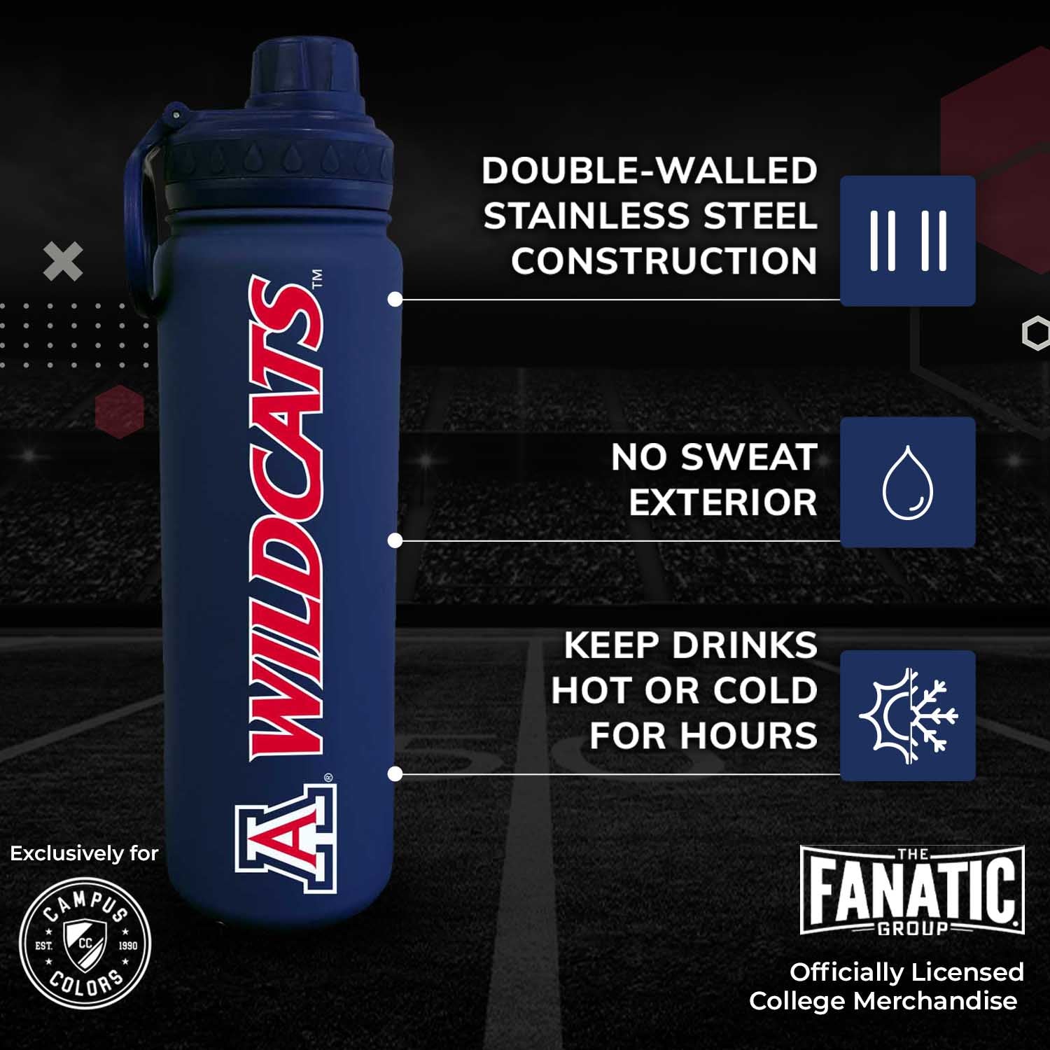 This officially licensed 24oz Arizona water bottle is the best accessory for any Arizona Wildcats fan. You can use this water bottle 24 oz for water, sports drink, or even to keep your coffee hot. Our vacuum sealed sport bottle ensures that your drinks stay hot or cold for hours. You can bring this bottle along to sport games, hikes, or tailgates on game day. This sport water bottle 24 oz is a slim bottle that fits in most car cup holders for convenience. This stainless sports water bottle features an easy flow spout for the best drinking experience. The twist on cap features an easy drinking spout to make sipping a breeze. The bottle's lid twists on and off to reveal an easy drinking mouthpiece. The convenience of our double walled water bottles make them perfect for sports and everyday life! Show off your school spirit with this Arizona Wildcats water bottle. This durable stainless sports water bottle make the perfect Arizona Wildcats accessories for any activity. Our water bottle with clip for backpack is perfect for student campus life and busy alumni activities. Our vacuum sealed water bottles feature a built in handle. The easy grab bottle allows you to sip your water without spilling it on yourself while playing sports or walking to class. The college water bottle is coated in silicone for added grip and softer finish, and the exterior is sweat free so the Arizona water bottle won't drip on you. This insulated water bottle is the perfect birthday or Christmas gift for fans who love to collect Arizona stuff. Pair with other Arizona novelties or apparel for the ultimate Wildcats gift for women and men. Arizona gear is great as birthday gifts for college students, alumni, and sport fans. With our Arizona Wildcats water bottle, fans can show team pride and stay hydrated all day and every day!