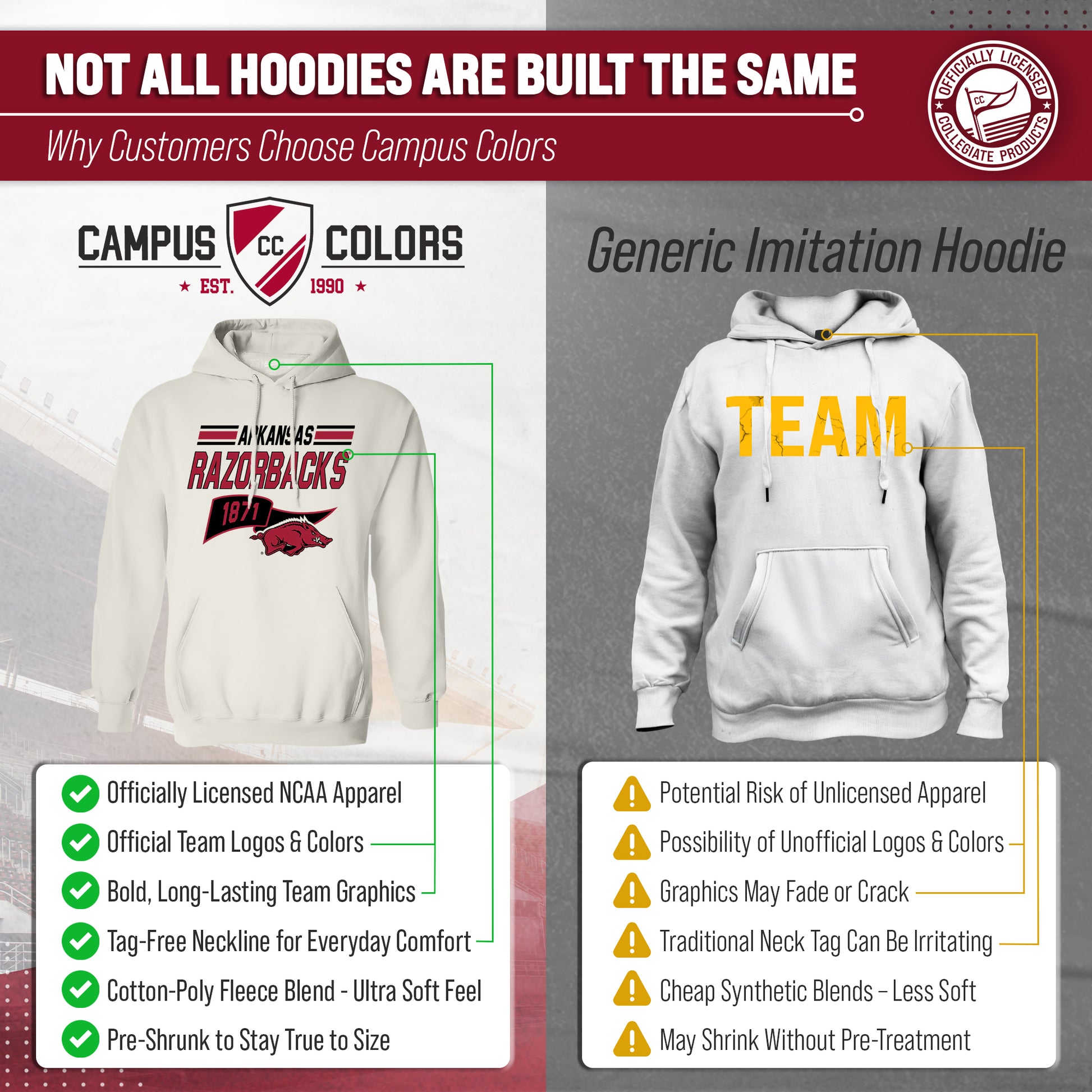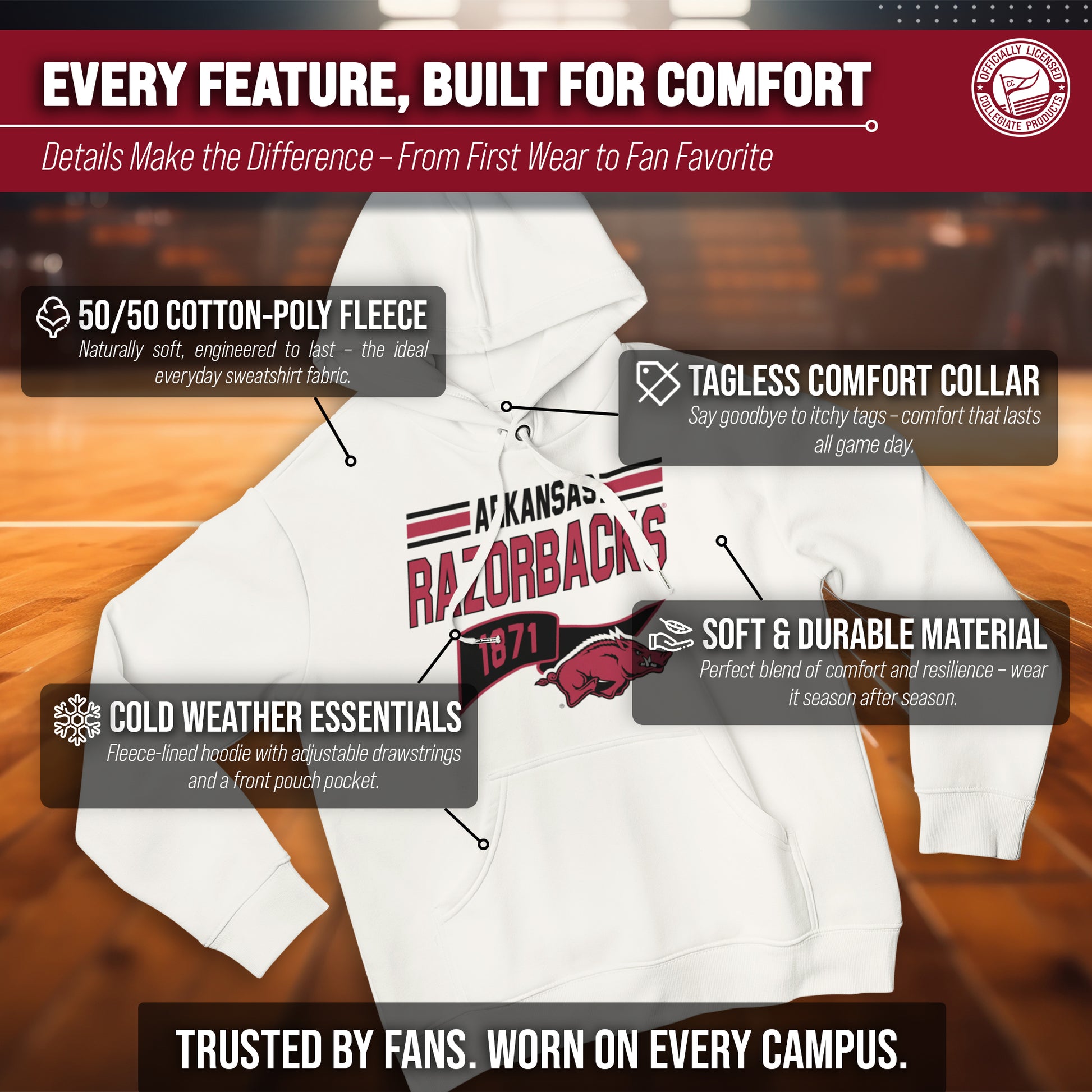 Show off your team spirit and stay warm in the NCAA Adult Unisex Varsity Club Pennant Arkansas Razorbacks Hooded Fleece Sweatshirt! This cozy sweatshirt is perfect for any Arkansas fan, with its vibrant colored pennant design. Made from a comfortable cotton poly fleece fabric, this Razorbacks hooded sweatshirt features long sleeves, a front pouch pocket, and a hood to keep you extra snug on chilly days. But that's not all - you can wear this Arkansas sweatshirt game after game without worrying about wear and tear. It's the perfect addition to your college team apparel collection, whether you're cheering on your team at the stadium or just lounging at home. It is the number one Arkansas item you'll want to have on the next cold game day! So why settle for a plain old sweatshirt when you can show off your love for Arkansas Razorbacks in style? Get your NCAA Adult Unisex Varsity Club Pennant Hooded Fleece Sweatshirt today for yourself or any Razorbacks fan in your life and be confident know that you are rocking the most authentic and official gear!