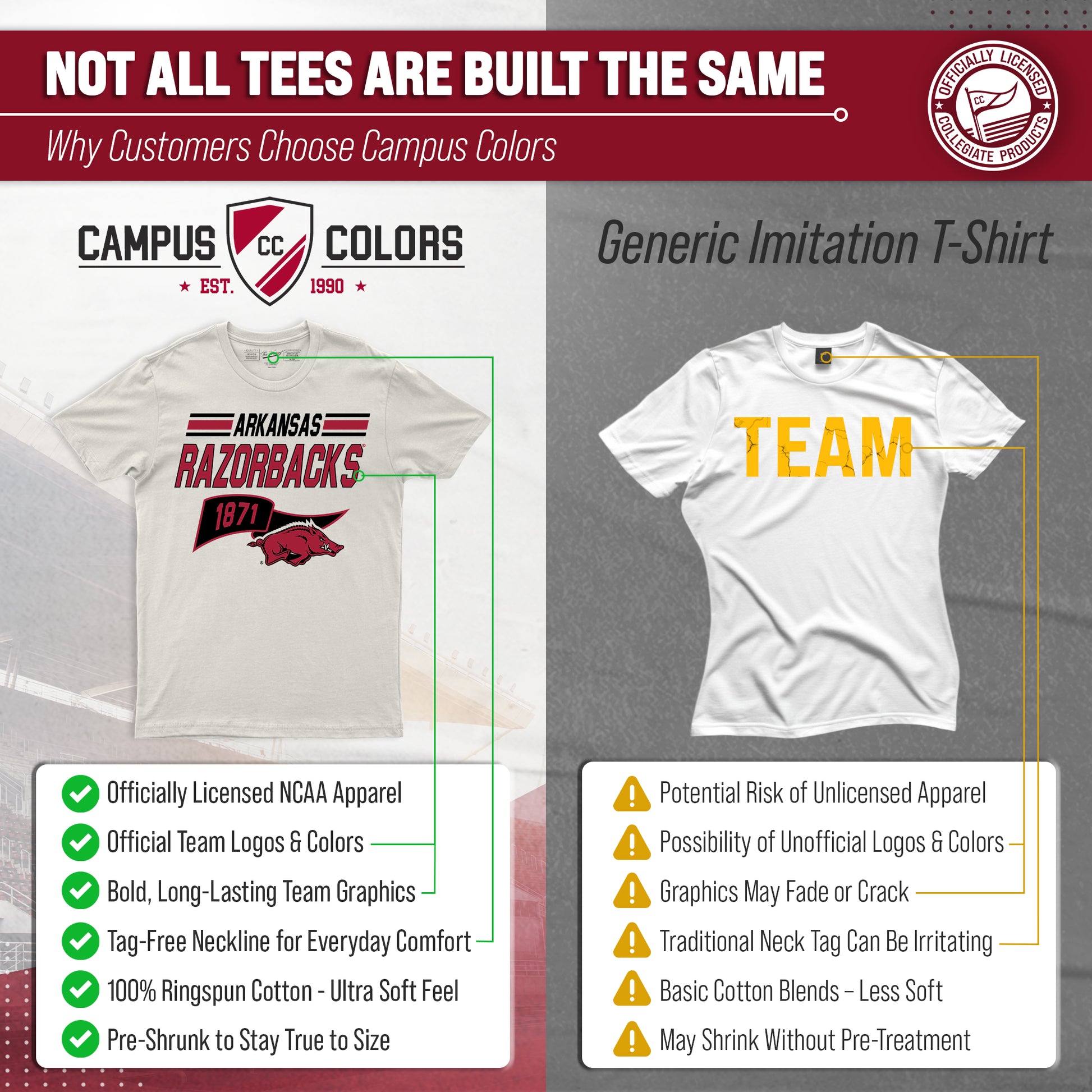 Go Team, Go! Show off your school spirit with the NCAA Adult Unisex Varsity Club Arkansas Razorbacks Pennant T-Shirt! Our officially licensed apparel will have you feeling like a member of the team! Made from comfortable and breathable cotton and featuring a neutral color garment, this t-shirt is perfect for game days, tailgates, or just lounging around. The tag-less design ensures ultimate comfort and no annoying tags to distract you from cheering on your team. Perfect for wearing to the big game, watching from home, hanging with friends, or even working out! Our Varsity Club Arkansas Razorbacks shirt makes a great gift for yourself, or any Razorbacks fan in your life! Our shirts are made from ringspun cotton for a soft feel against your skin and feature a classic retro pennant design of your favorite college team. With short sleeves and a variety of sizes to choose from, these t-shirts are perfect for men and women alike. So gear up for game day with the NCAA Adult Unisex Varsity Club Pennant T-Shirt - the perfect addition to any Arkansas Razorbacks fan's wardrobe!
