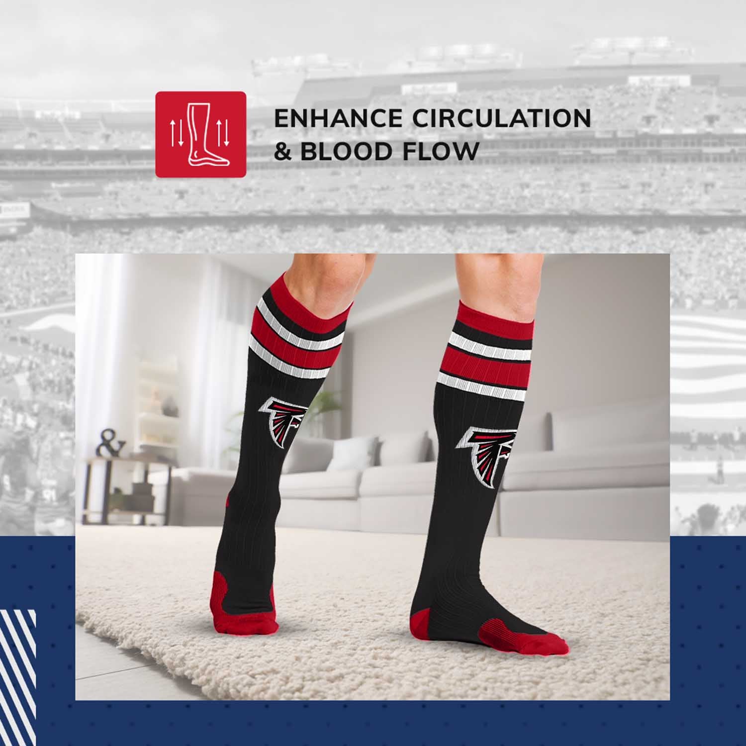 These Atlanta Falcons NFL knee-high performance socks are designed to support your muscles and tendons during exercise, as well as reduce some soreness and swelling. With a true performance fit, our socks provide support where you need it most for the ultimate in athletics and recovery. Our proprietary blend of materials wicks moisture away from the skin to keep your feet dry and comfortable all day long. Two size options are available, so you can easily find a comfortable fit. Our Falcons socks for women and men are the best performance socks and make great Atlanta Falcons gifts for men, Falcons gifts, Falcons gear, and Falcons socks. If you are looking for high-quality performance socks, unisex compression socks, Falcons merchandise, or Falcons gear, these football socks are for you!