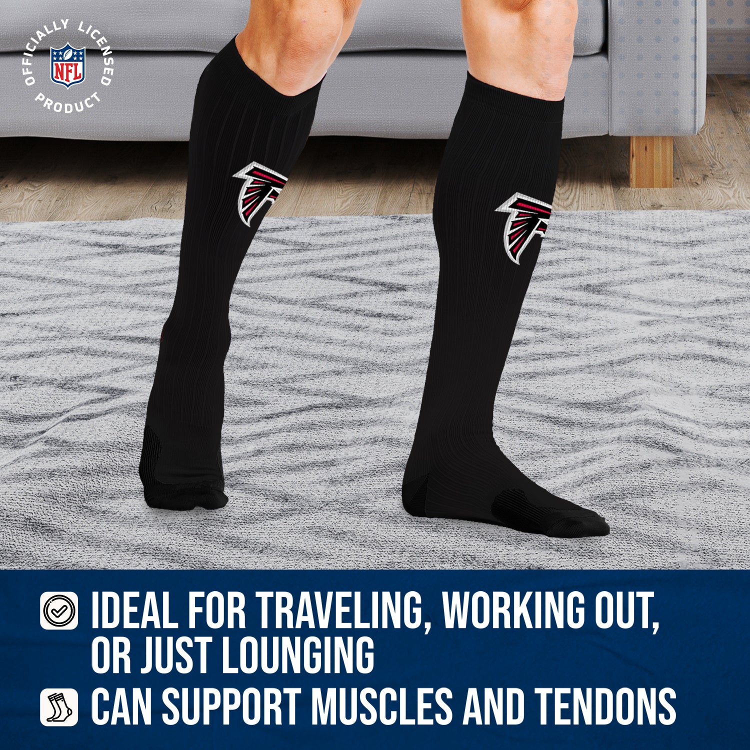These all-black Atlanta Falcons NFL knee-high performance socks are designed to support your muscles and tendons during exercise, as well as reduce soreness and swelling. With a true performance fit, our socks provide support where you need it most for the ultimate in athletics and recovery. Our proprietary blend of materials wicks moisture away from the skin to keep your feet dry and comfortable all day long. Two size options are available, so you can easily find a comfortable fit. Our Falcons socks for women and men are the best performance socks and make great Atlanta Falcons gifts for men, Falcons gifts, Falcons gear, and Falcons socks. If you are looking for high-quality performance socks, unisex compression socks, Falcons merchandise, or Falcons gear, these football socks are for you! The all-black socks are a great option for business casual!