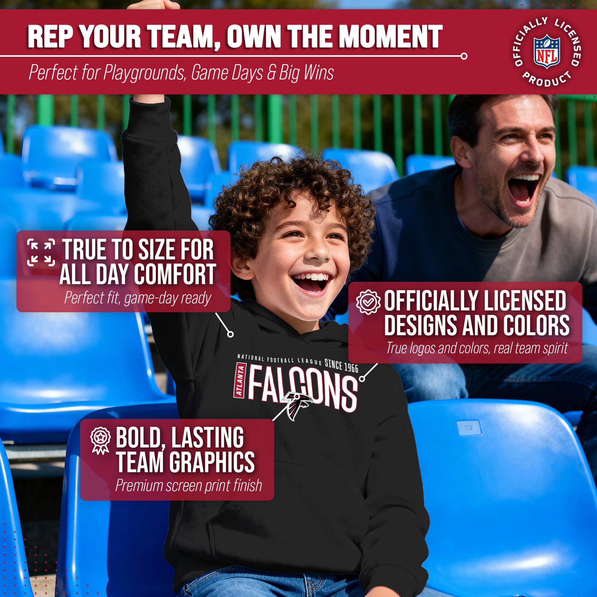Hey there, young sports fans! Get ready to show off your team spirit with the Team Fan Apparel Atlanta Falcons Youth Modern Endzone Football Fleece Hooded Sweatshirt! Made from a soft and cozy cotton polyester fleece, this sweatshirt is perfect for staying warm on game day or any day. The unisex design makes it suitable for both boys and girls, and its tag-less feature ensures ultimate comfort all day long. Featuring an original modern endzone design that proudly displays your team's colors and logos, this youth hoodie will be turning heads everywhere it's worn. The front pouch pocket and fleece hood will keep you warm on those cold game days as you cheer on your Falcons! Just pull it on and go! So whether you're at the stadium or hanging out with friends, make sure you're representing your team in style with our NFL youth apparel. Printed and designed in the USA, have confidence your sweatshirt will last! Order now and get your future pro geared up to be the next super fan!