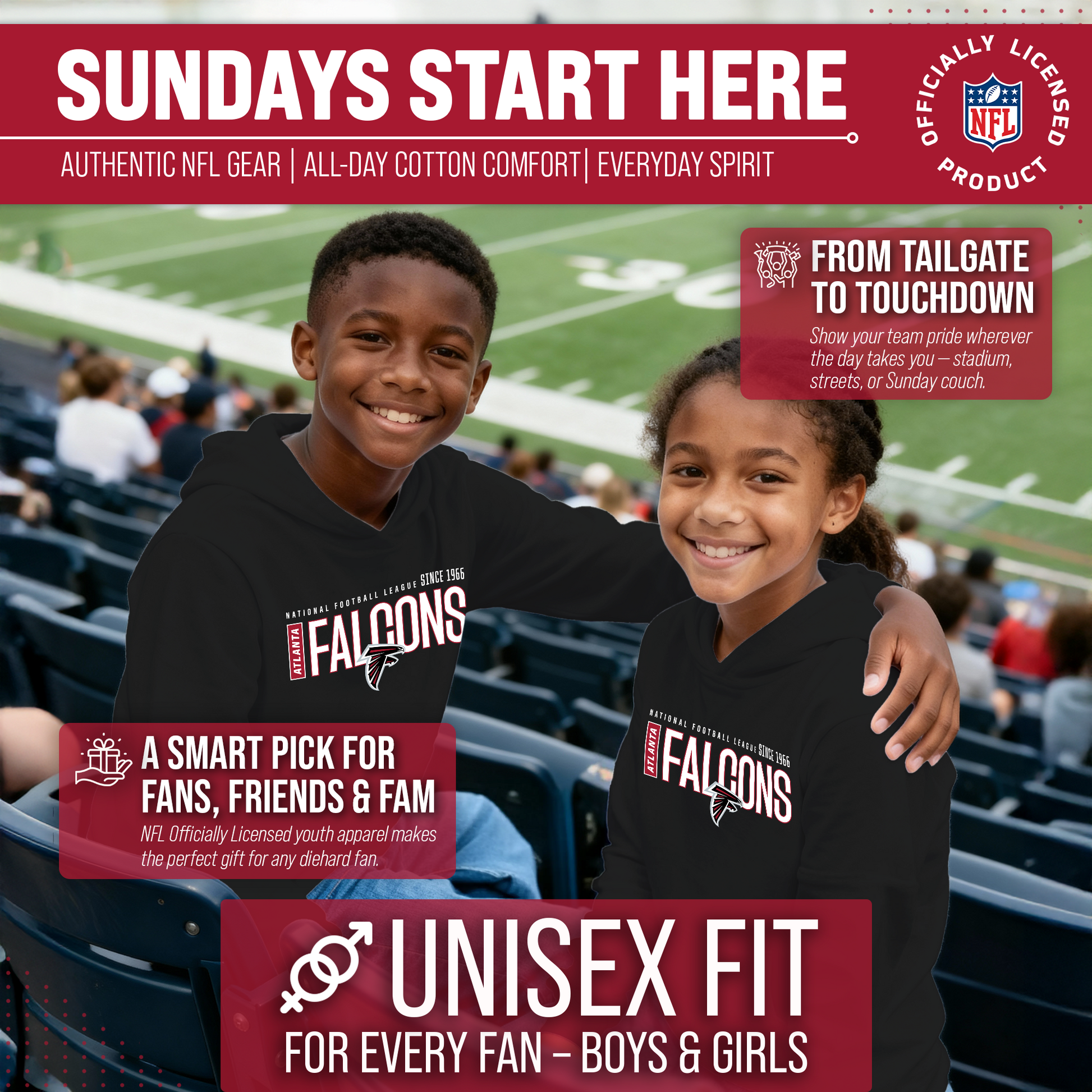 Hey there, young sports fans! Get ready to show off your team spirit with the Team Fan Apparel Atlanta Falcons Youth Modern Endzone Football Fleece Hooded Sweatshirt! Made from a soft and cozy cotton polyester fleece, this sweatshirt is perfect for staying warm on game day or any day. The unisex design makes it suitable for both boys and girls, and its tag-less feature ensures ultimate comfort all day long. Featuring an original modern endzone design that proudly displays your team's colors and logos, this youth hoodie will be turning heads everywhere it's worn. The front pouch pocket and fleece hood will keep you warm on those cold game days as you cheer on your Falcons! Just pull it on and go! So whether you're at the stadium or hanging out with friends, make sure you're representing your team in style with our NFL youth apparel. Printed and designed in the USA, have confidence your sweatshirt will last! Order now and get your future pro geared up to be the next super fan!