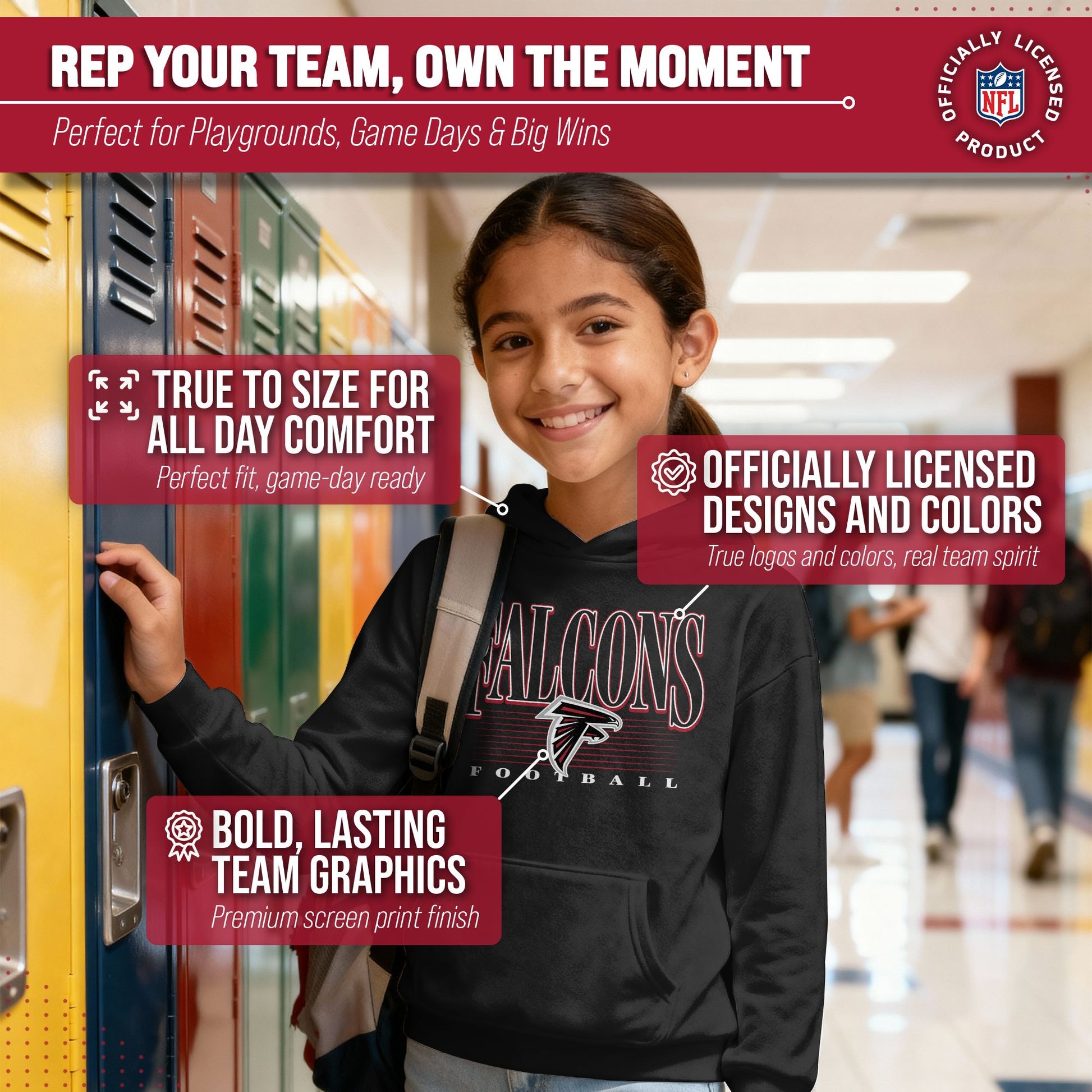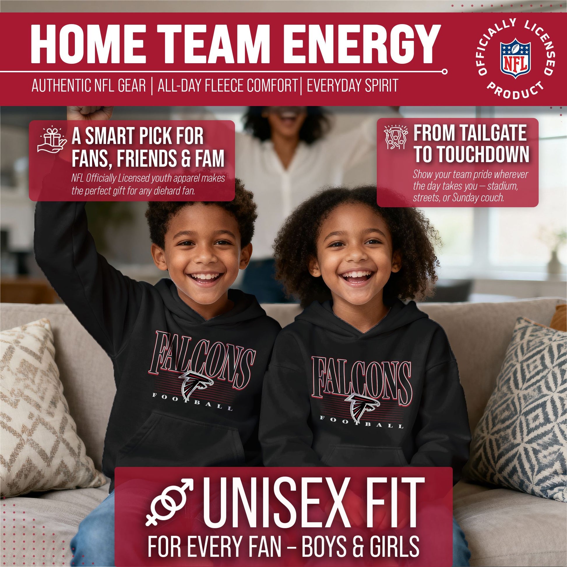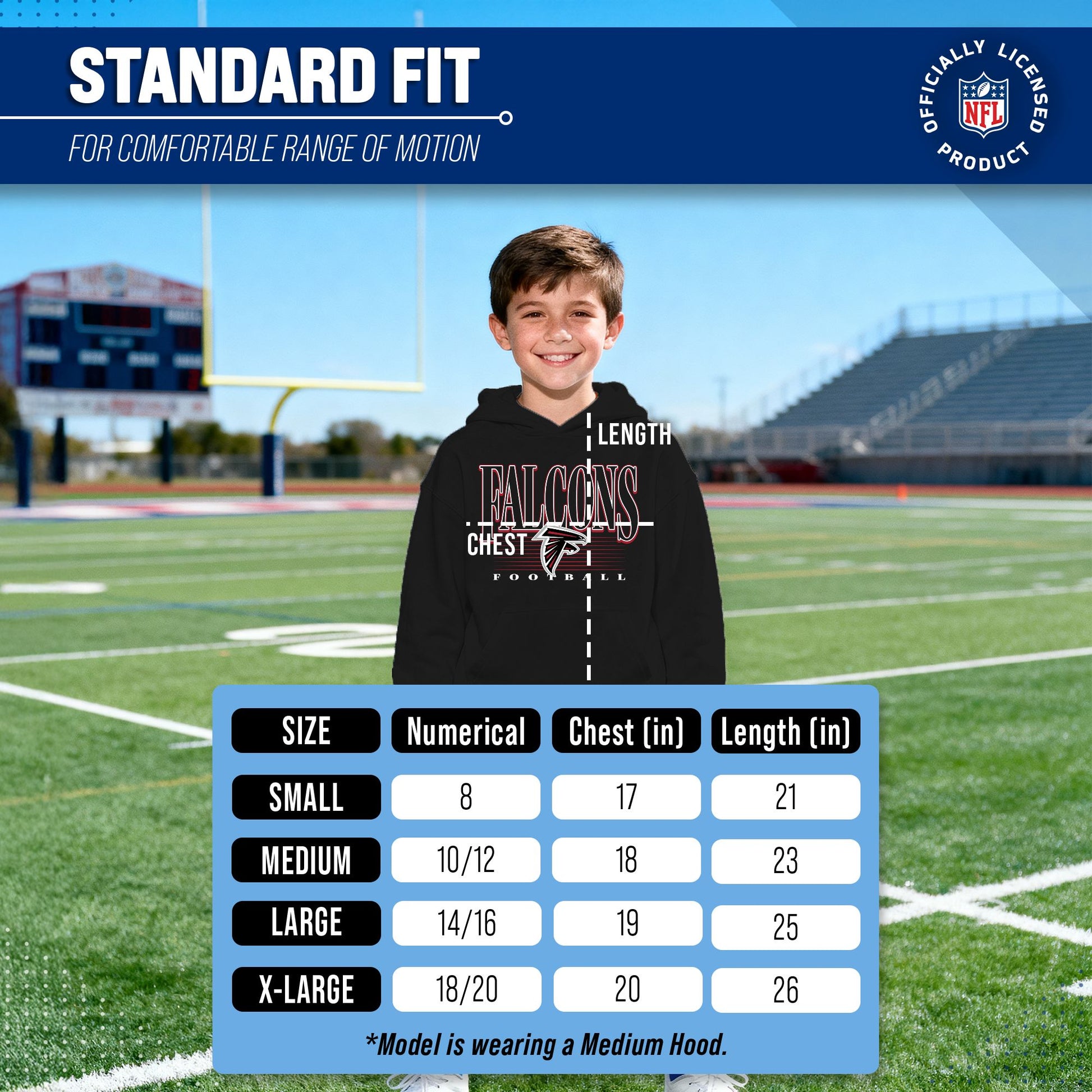 Hey there, young sports fans! Get ready to show off your team spirit with the Team Fan Apparel Atlanta Falcons Youth Overtime Blueprint Football Fleece Hooded Sweatshirt! This sweatshirt is made from a soft and cozy cotton polyester fleece and is perfect for staying warm on game day or any day. The unisex design makes it suitable for both boys and girls, and its tag-less feature ensures ultimate comfort all day long. Featuring an original outlined design with their vintage logo that proudly displays the team's colors, this youth hoodie will be turning heads everywhere it's worn. The front pouch pocket will keep you warm on those cold game days as you cheer on your Falcons! Just pull it on and go! So whether you're at the stadium or hanging out with friends, make sure you're representing your team in style with our NFL youth apparel. Printed and designed in the USA, have confidence your sweatshirt will last! Order now and get your future pro geared up to be the next super fan!