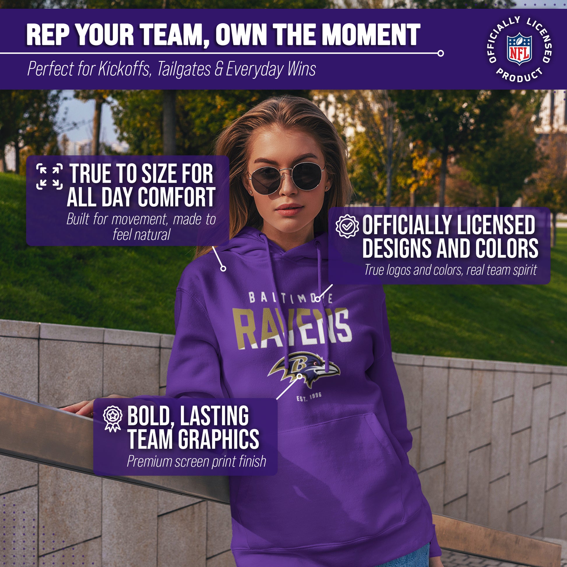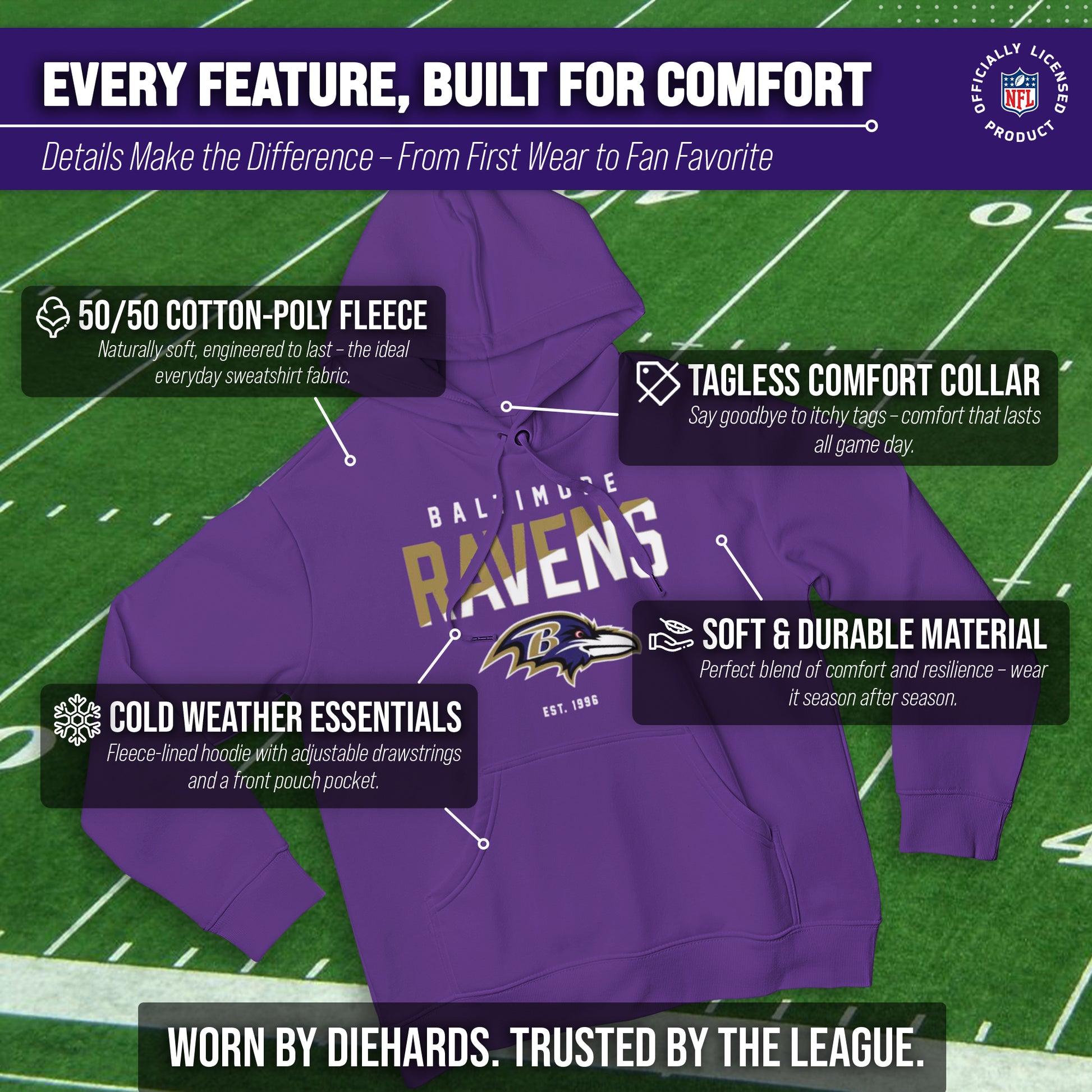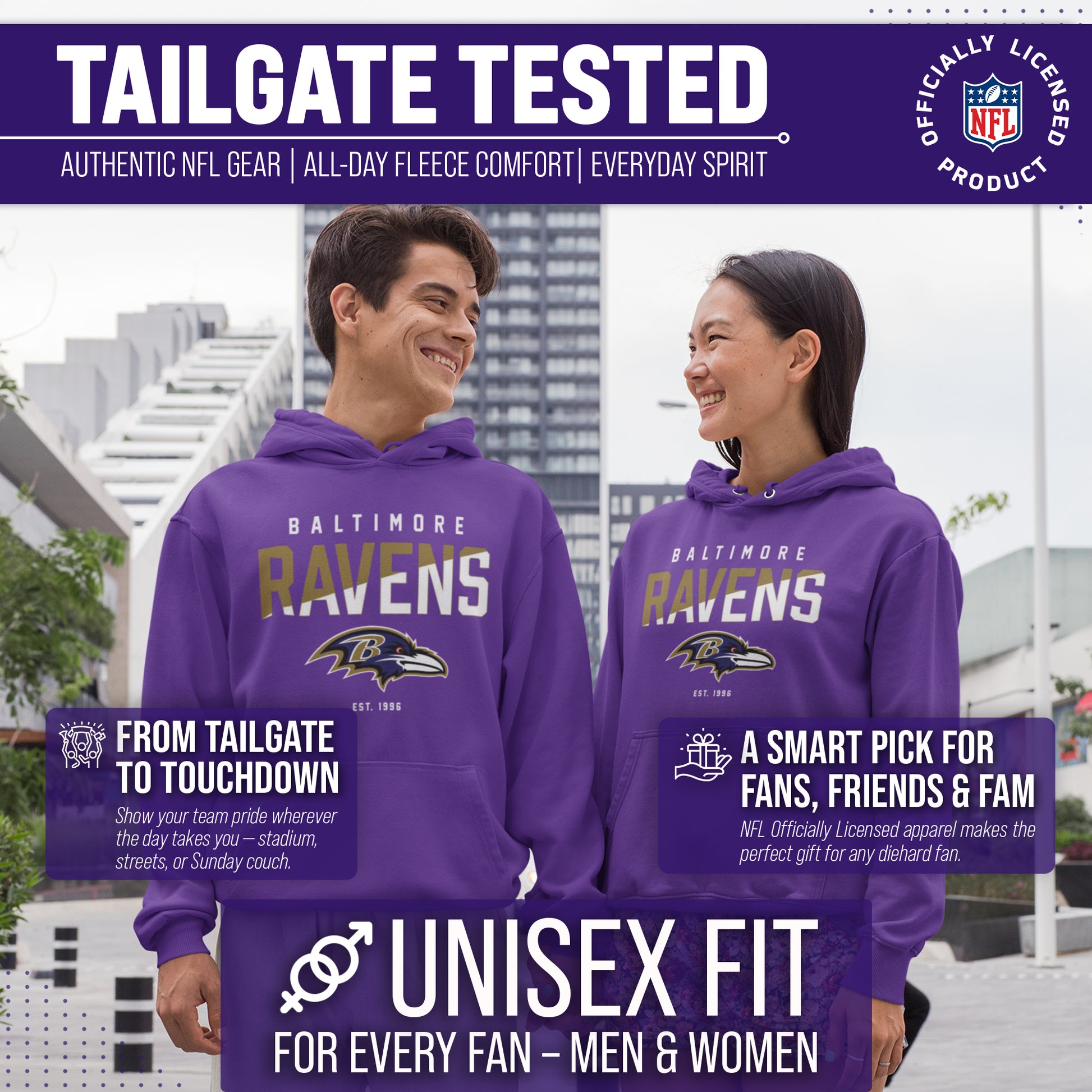 Score with Team Fan Apparel, the ultimate destination for officially licensed NFL apparel for men and women. We use only the highest quality screen printing techniques to bring you the most comfortable, durable, and stylish clothing possible. Go ahead and show your team pride at the big game or any time! This premium hooded sweatshirt fits both male and female adults and comes in small, medium, large, XL, and XXL. So needless to say, it fits Baltimore Ravens fans of all types! Maybe you aren't a Ravens fan but you know someone who is? Don't worry! This high-quality sweatshirt is soft, lightweight but cozy, breathable and a GREAT gift for any birthday, anniversary, or Christmas gift; Father's Day, Mother's day, you name it! The front pouch pocket, drawstring hood, and soft fleece will keep you warm and keep your fandom hot! So, if you want to stand out as the #1 fan at the next big game, tailgate or watch party, you're going to want to be wearing one of these diagonal fade hooded sweatshirts