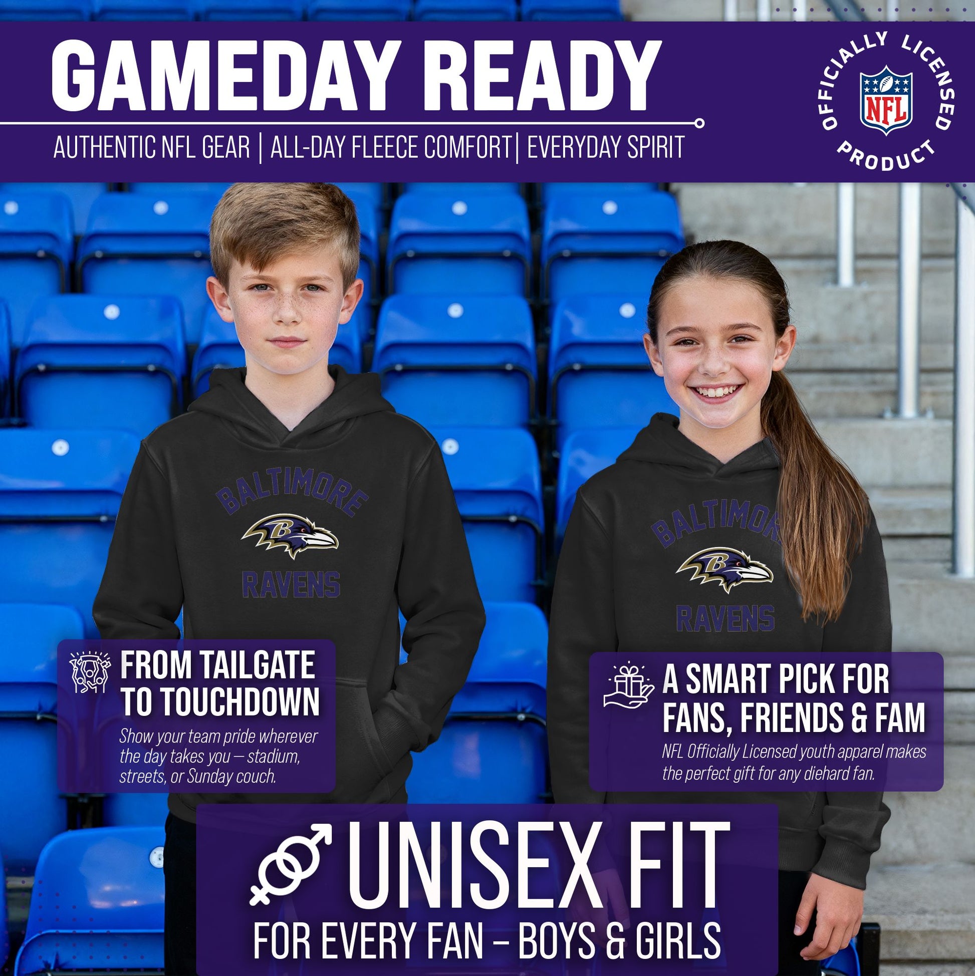 Our youth gameday Baltimore Ravens football pullover hoodie with a front pouch pocket is the ideal sweatshirt to wear on gameday. This Ravens hoodie for kids is comfortable and great for showing team pride all year long. This is an essential piece of girls and boys football apparel for pro football fans. Our team-colored hoodie sweatshirts are the perfect fan apparel for school and sports games. This hooded pullover with a pocket is ideal for warm or cold weather games. Ravens football pullover hoodie is made from a cotton poly blend material with raglan sleeves. These youth pro football sweatshirts have high quality features. Our youth gameday pullover hoodies feature 1x1 ribbing at cuffs and waistband. This Baltimore hoodie youth sweatshirt has a twill neck tape. The raglan sleeves add a sophisticated look to these pro football team hoodies for boys and girls. This tagless sweatshirt ensures the most comfortable fit for boys and girls. The standard fit makes our football team hoodies for boys and girls the perfect kids sweatshirt for young fans. The thermal printed graphics are high definition, true to authentic team color, and resist fading. Our hoodies also make the best Ravens gifts for boys and girls. Youth football apparel is the perfect birthday gift for any professional sports fan. Our youth football team hoodies for boys and girls are great for wearing to school, the stadium, or while you're watching the game at home.