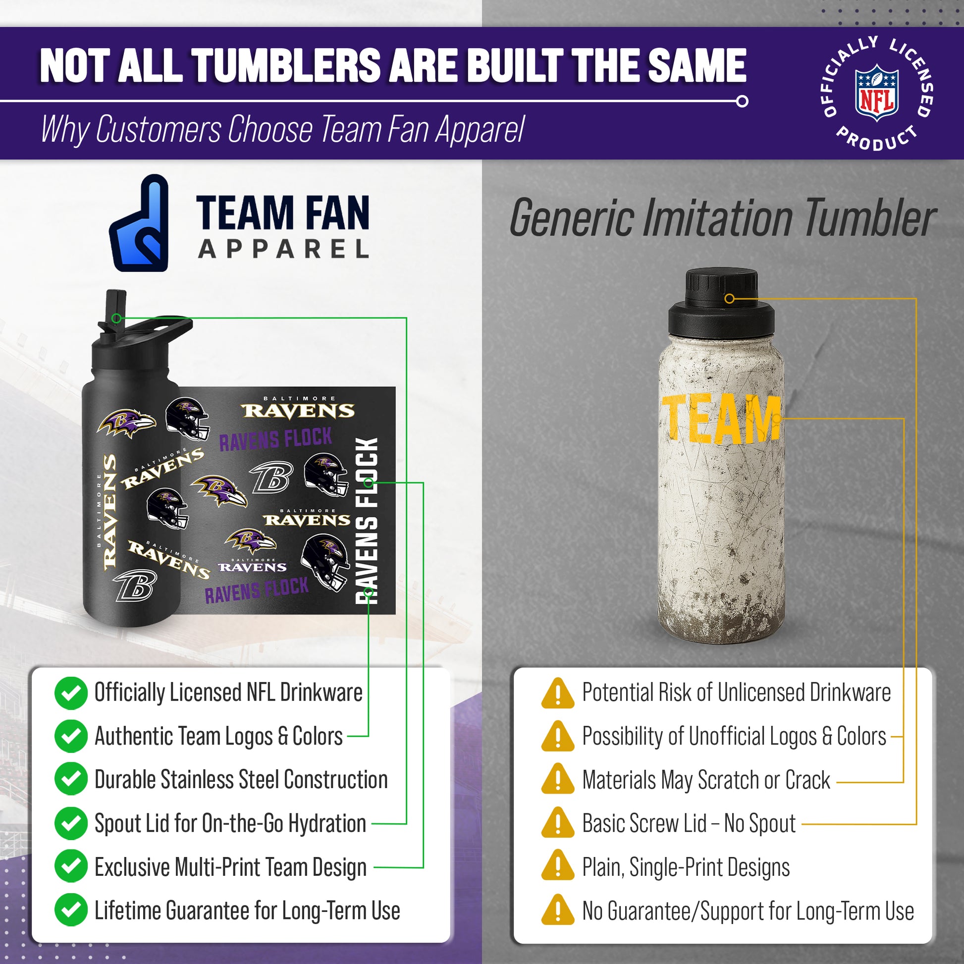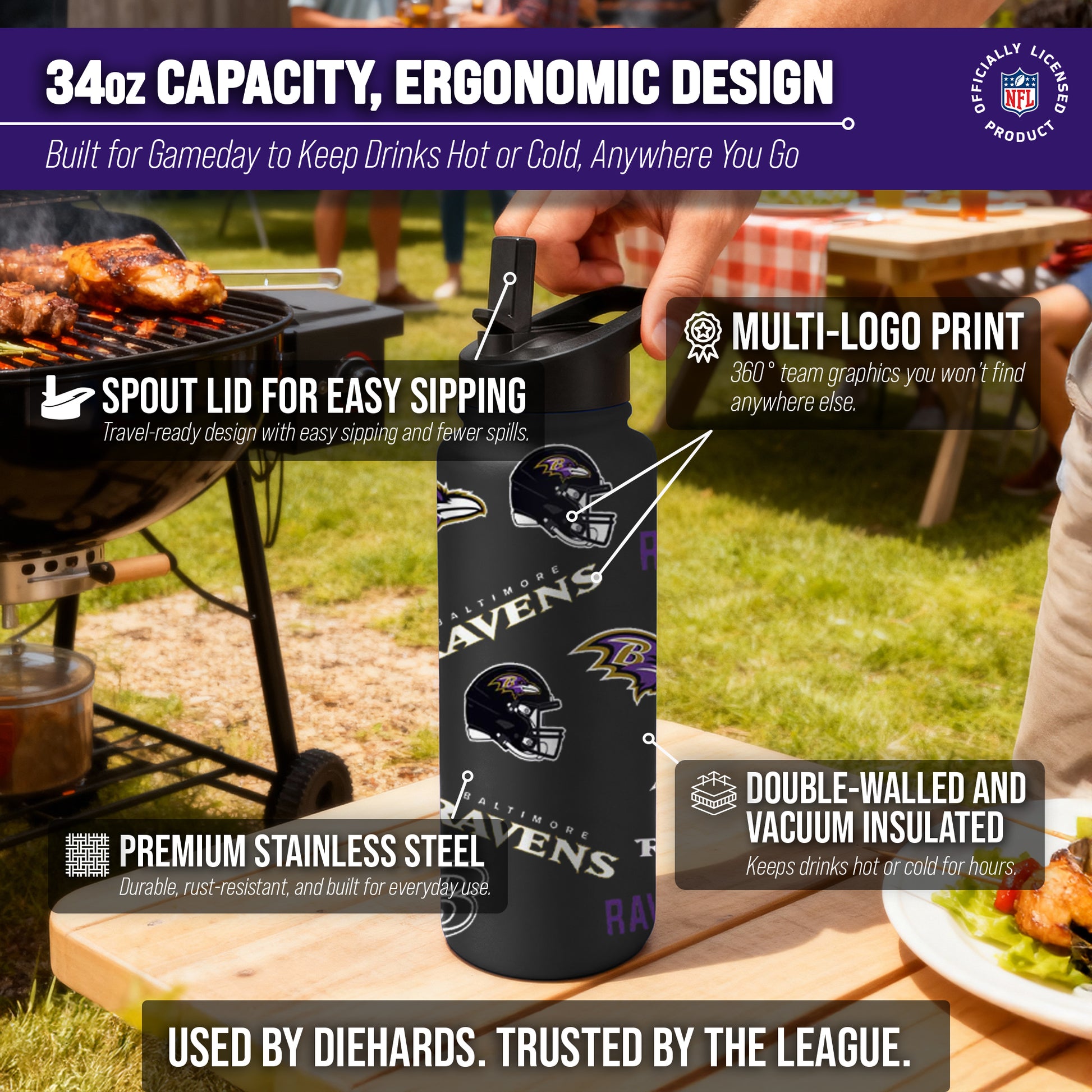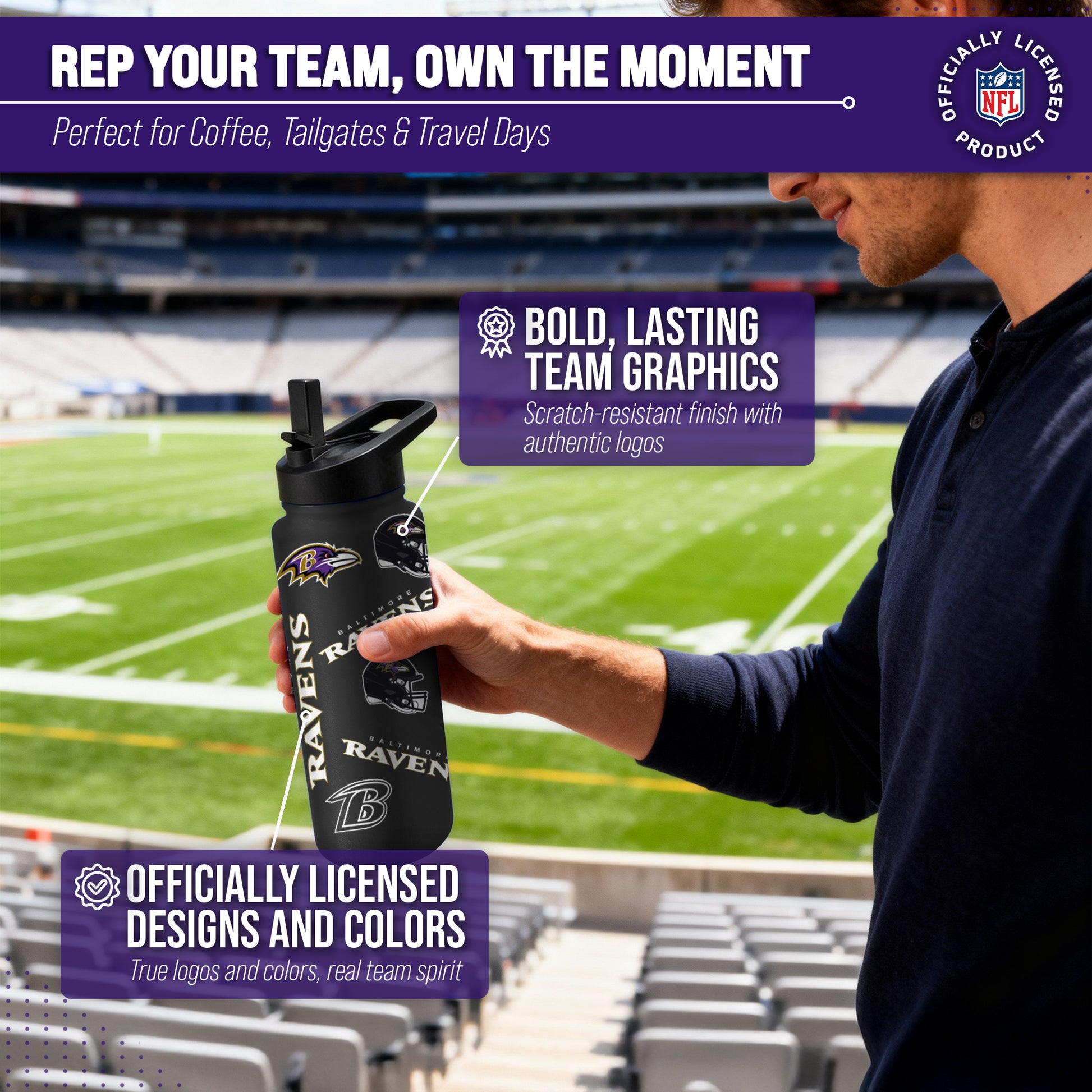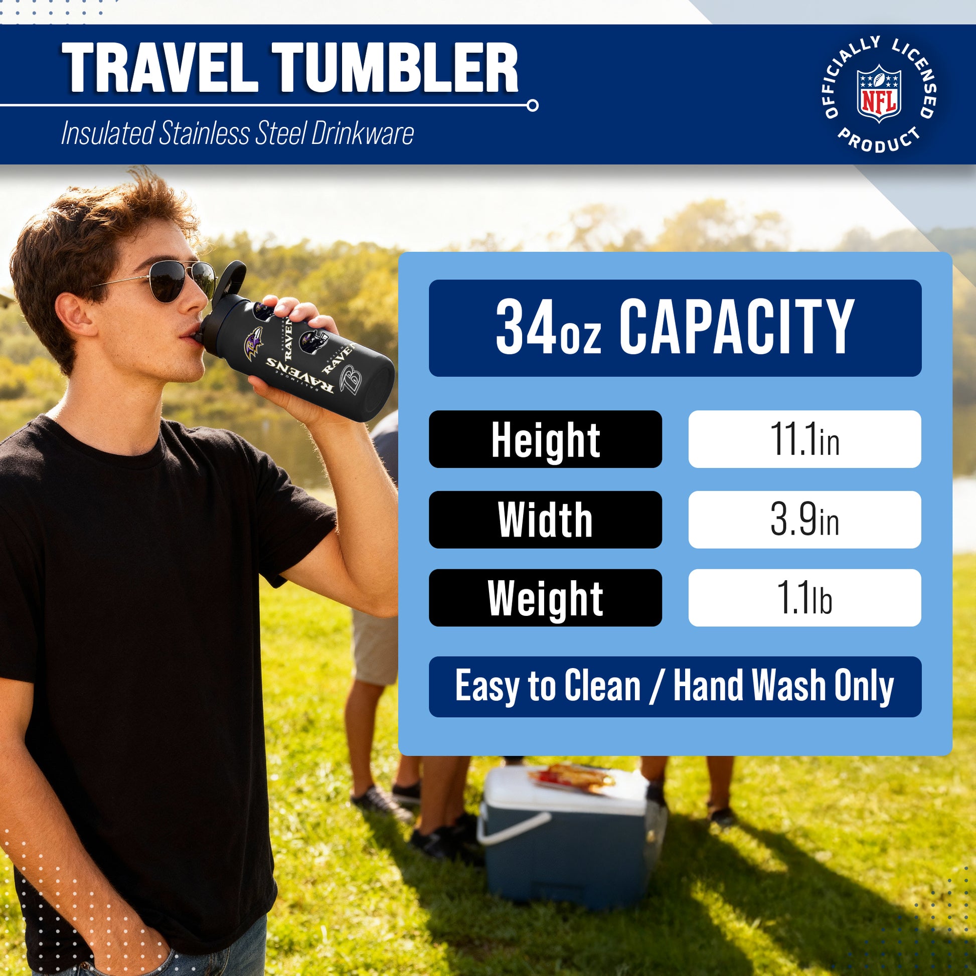 Keep Your Baltimore Ravens Team Spirit and Drinks Handy On-the-Go with the NFL Native Quencher Water Bottle! Whether you're heading to the gym or tailgating at the game, this 34oz Ravens water bottle is the perfect companion for any fan. Made from durable stainless steel, it's designed to keep your drinks hot or cold for hours. The no-leak dual option lid allows you to sip through a straw or drink straight from the spout. But it's not just for water! This versatile bottle can also hold your favorite coffee, tea, & more. With its insulated design, your beverages will stay at their desired temperature until you're ready for them. Featuring your team's logo & colors, this water bottle proudly displays your loyalty while keeping you hydrated. And when it's time for a refill, simply take off the lid and fill up again. Cheers to staying hydrated in style with the Baltimore Ravens Water Bottle! Hand wash only! Great for yourself or any fan in your life, especially for on-the-go and travel!