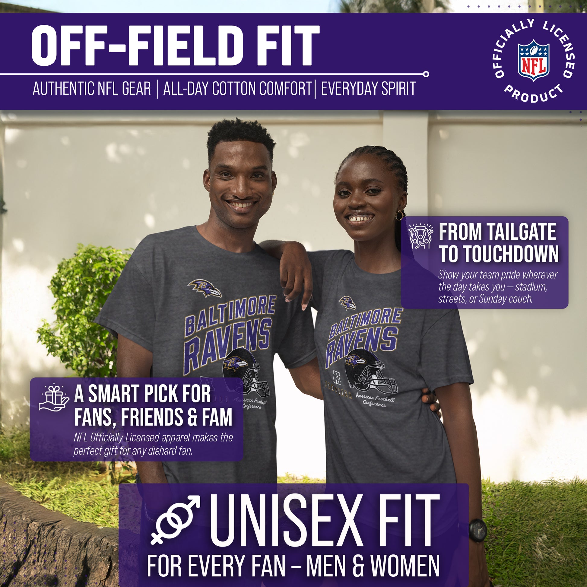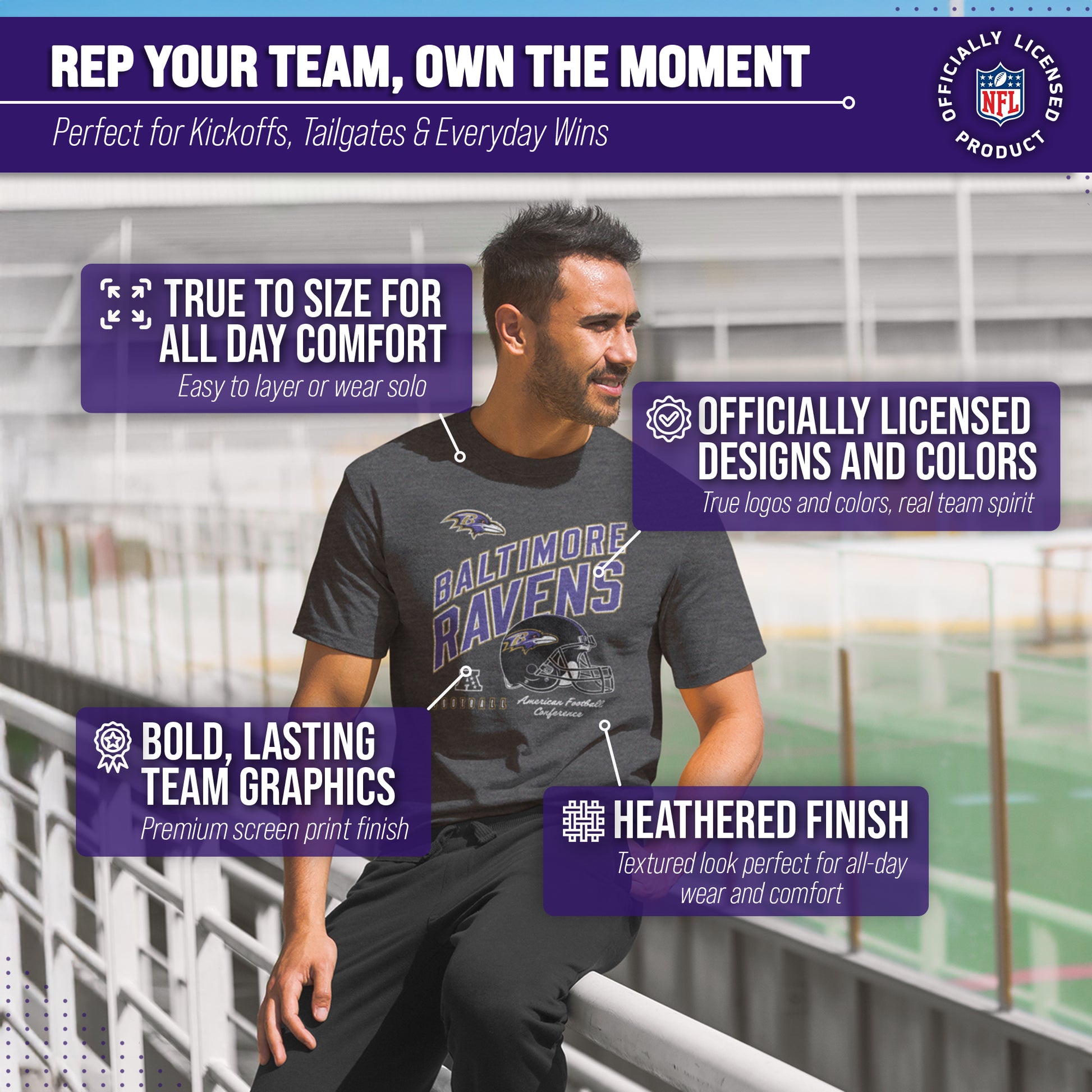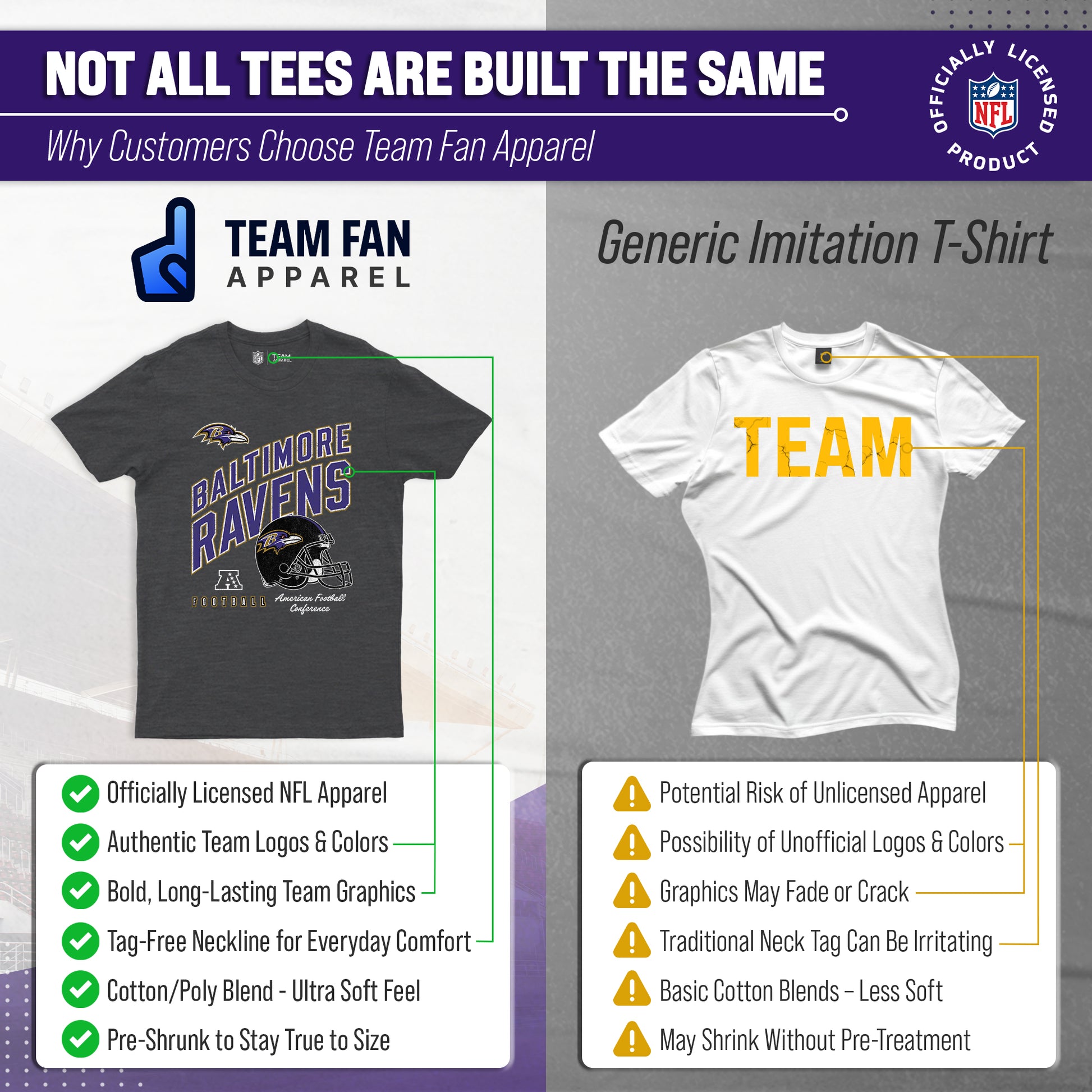 Show off your team spirit in style with our Team Fan Apparel Baltimore Ravens NFL Distressed Helmet Tag-Less T-Shirt! Made for both men and women, this unisex t-shirt is the perfect addition to any football fan's wardrobe. With its soft and comfortable cotton blend fabric, you'll love wearing it to games or just lounging at home. The tag-less design ensures maximum comfort without any annoying tags scratching at your neck. Featuring a large vibrant helmet design with the team name printed largely, along with the official team logo, this shirt will make you stand out from the crowd and show off your die-hard fandom. It comes in multiple sizes, so you can choose the one that fits best & represents your team spirit. Whether you're cheering on your Ravens at the stadium or watching from home, our NFL Distressed Helmet Tag-Less T-Shirt is a must-have for all fans! So grab yours today and support your team in comfort and style. Go team!