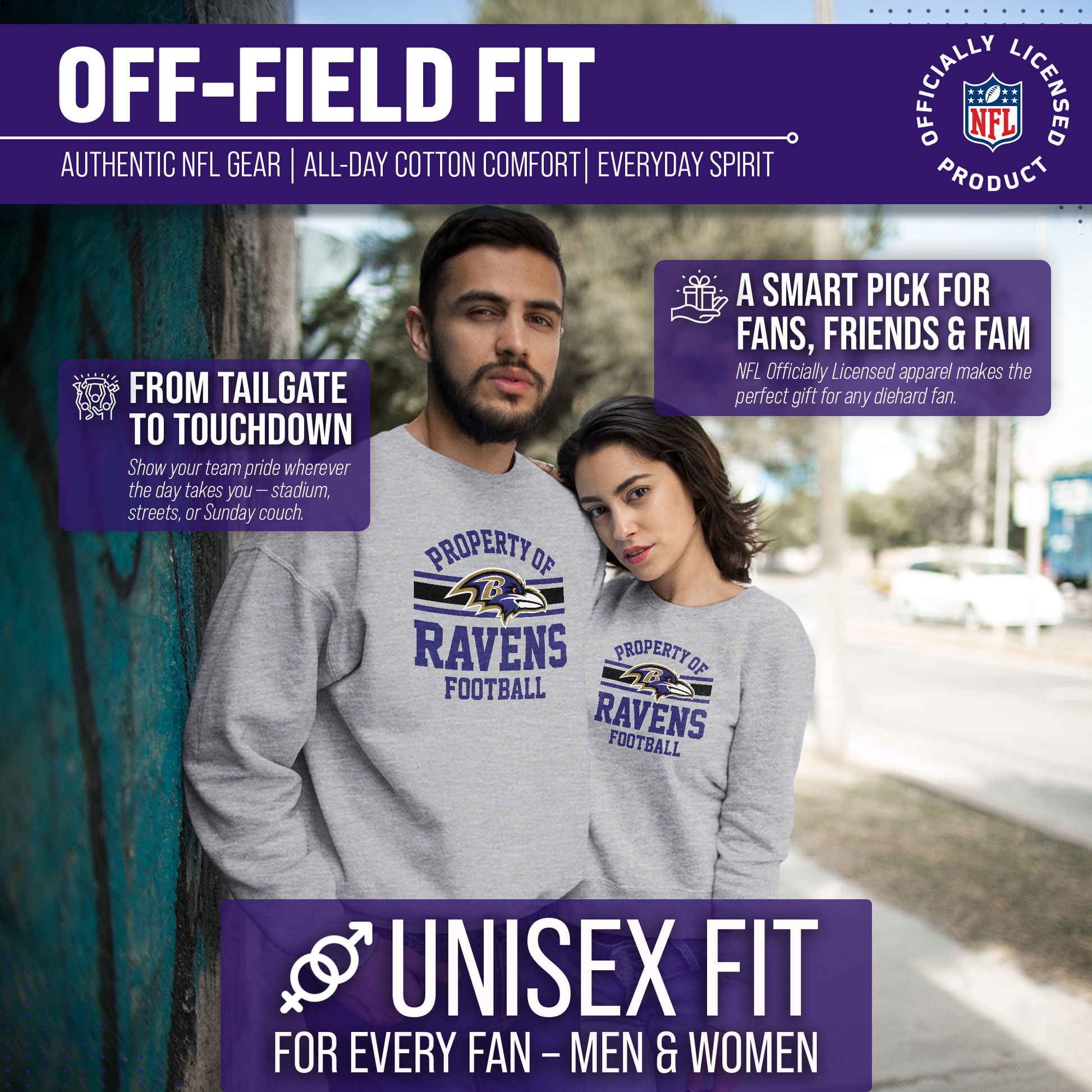 This Property of Baltimore Ravens pullover crewneck sweatshirt is a cold-weather friendly jacket made from 50% ringspun cotton and 50% polyester. Our mens and womens football sweater is super comfortable, runs true to size, and is great for showing your team pride all year long. This comfy crewneck features the official Property of graphics will stay crisp and wear after wear and year after year. All colors and fonts are officially licensed and are of the highest of quality. These crew neck sweatshirts are made with air jet yarn for a softer feel and reduced pilling. This tagless Baltimore crewneck sweatshirt is perfect for tailgates, games, and showing off your team spirit. Our pullover crewnecks are ideal Ravens gifts for men and women football fans. The unisex fit of our Baltimore crewneck is ideal for both men and women. This crewneck is essential apparel for protecting yourself from the elements at a football game. The fleece material, ribbed cuffs, and waistband keep all the warmth in, which means there's no need for an extra jacket in the fall months– our crew neck sweaters have you covered. This Property of Baltimore Ravens sweatshirt crewneck pullover is pre-shrunk and is ideal for that tailgate or game day when the temperature drops. Our crewneck pro football sweatshirts for women and men help you gear up and get ready to cheer the Ravens to victory.