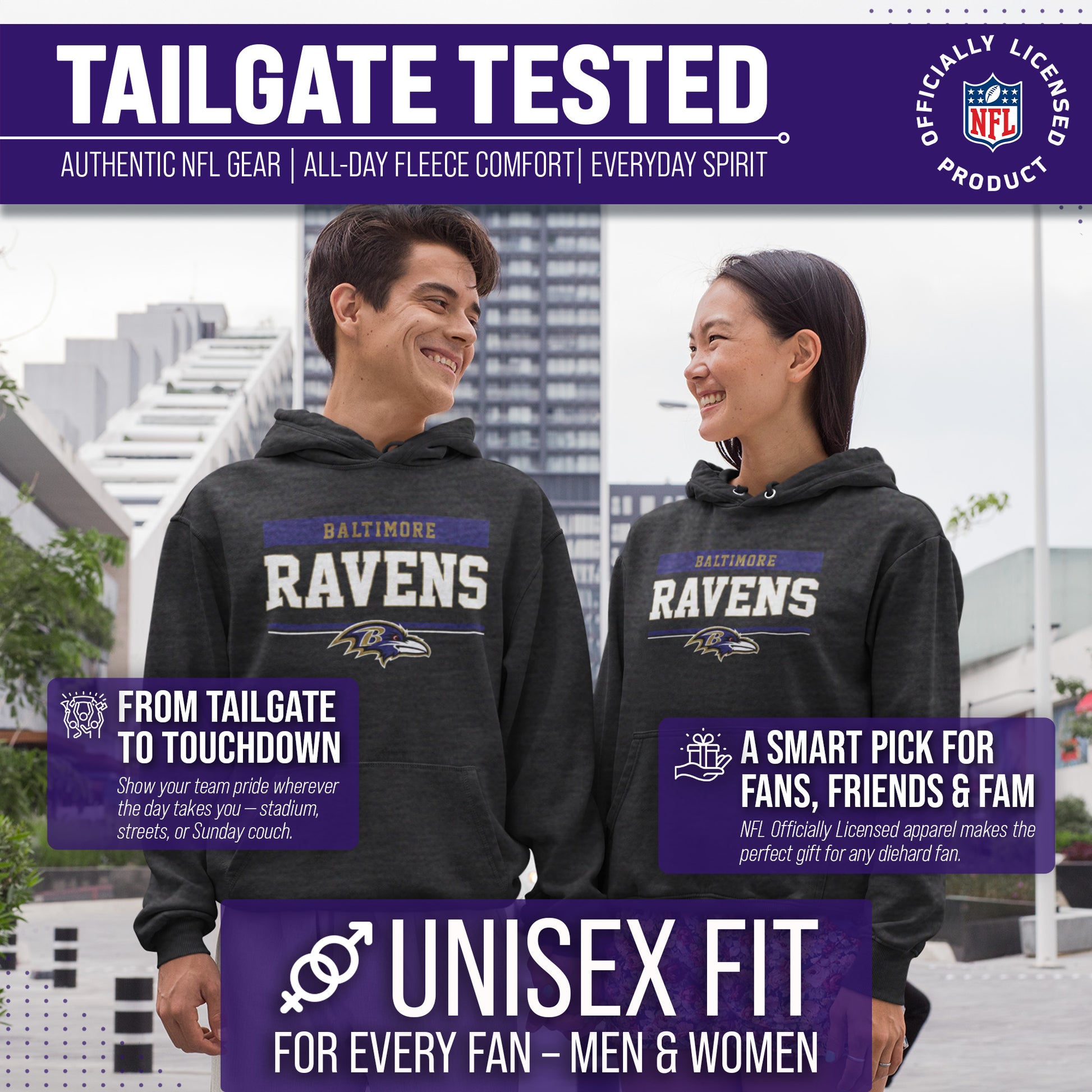 Our Charcoal Gameday Hooded Sweatshirt is a Baltimore sweatshirt with a warm and toasty 9 oz fleece lining. It's the very best of Baltimore Ravens apparel, plain and simple. Gear up for your cold weather football game with confidence. Or, for women, bring it with you to games and tie it around your leggings in case the arena is a little chilly. Our football hoodie sweatshirts for men and women are super comfortable, run true to size, and are great for showing your team pride all year long. Plus, the unisex fit is ideal for both men and women and works as an oversized sweatshirt for kids. Baltimore Ravens sweater for men and women features your teams thermal-printed logo wordmark will stay crisp and clear, wear after wear. All colors and fonts are officially licensed and are of the highest of quality, it even comes with an officially licensed tag. Comes with an officially licensed tag; ribbed cuffs and waistband, double layer hood with drawstrings, spacious front pouch pocket. This football sweatshirt in particular is perfect for tailgates, games, and showing off your team spirit. Gameday hooded [team_ long] sweatshirts make a great birthday, Christmas (or any other holiday), or graduation gift for a sports fan. Gameday charcoal hood is essential apparel for protecting yourself and your loved ones from the elements. The fleece material will keep you warm through the colder months, and the no-zip design allows you to pullover and feel embraced like a big oversized blanket. The Baltimore Ravens charcoal crew necks are pre-shrunk and are made from a dual blend of 50% cotton and 50% polyester that is ideal for that tailgate or game day when the temperature drops. Pair with your other favorite Baltimore game day apparel! Say goodbye to cheap sweatshirts. Our charcoal sweatshirts for women and men help you gear up and get ready to cheer your team to victory.