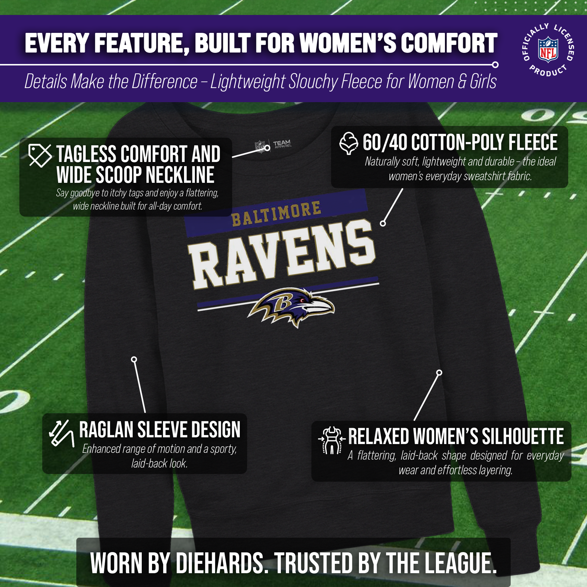 Our officially licensed womens Baltimore Ravens long sleeve charcoal crew neck pullover is super comfortable, has an oversized fit, and is great for showing off your Baltimore pride. The high-quality thermal printed logo and wordmark will look fresh after years of wear, making it a great alternative to wearing a Baltimore Ravens womens jersey. Our womens long sleeve slouchy crewneck has a relaxed fit for a casual, comfortable look. The long sleeve Baltimore crew will look great with shorts at tailgates in warmer months, or with jeans or leggings when it gets cooler. Layer it with a hoodie or even a Baltimore football jersey when the weather gets cold. Available in plus sizes up to 3XL, this is a Baltimore Ravens pullover that women who are plus size or straight size will feel comfortable in. If you're looking to give the gift of ladies Baltimore apparel, our long sleeved Baltimore Ravens Slouchy Crew is the perfect gift. Officially licensed to ensure no counterfeit designs or colors, these Baltimore crews for women are perfect for super fans. Made from a cotton poly blend to keep you comfortable, the womens raglan long sleeve Gameday Slouchy Crew will definitely become one of your favorite pieces of Baltimore Ravens apparel.