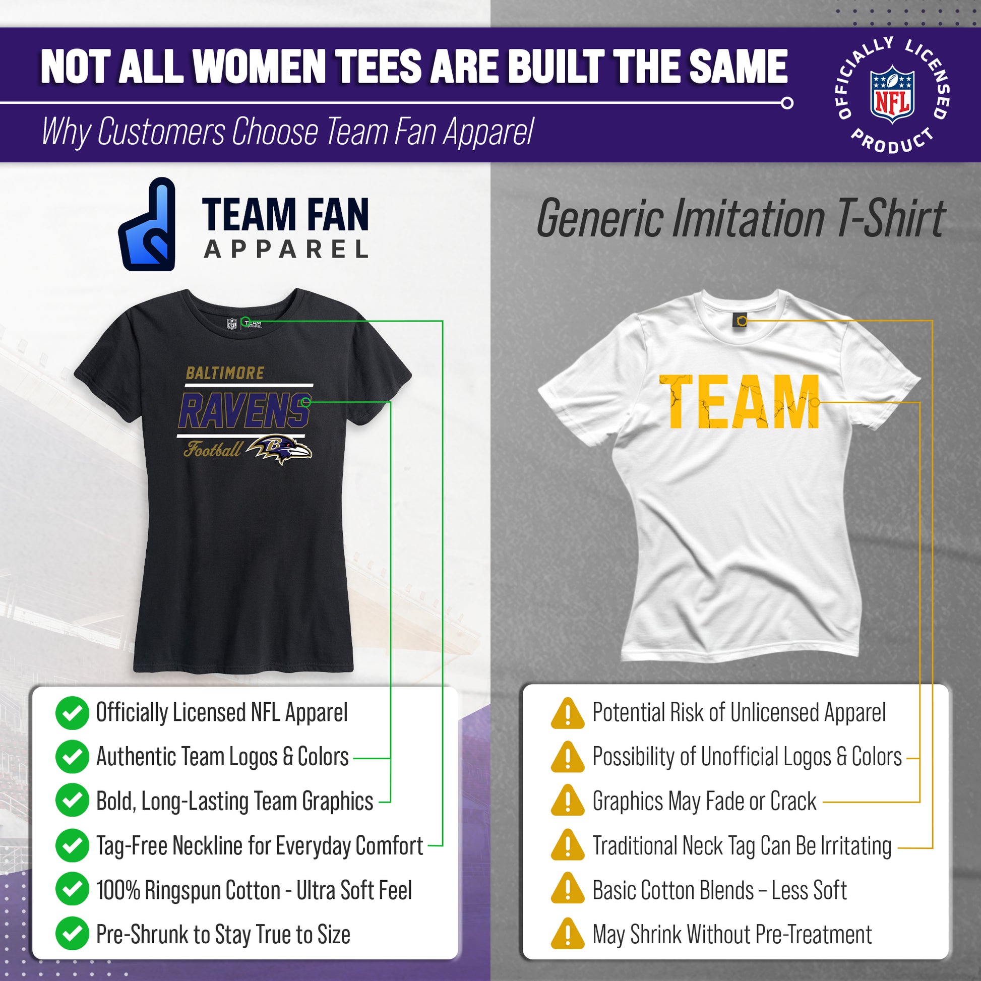 Our officially licensed Ravens shirt is super comfortable, runs true to size, and is great for showing off your Baltimore Ravens pride. The high-quality thermal printed logo will look fresh after years of wear, making it a great alternative to your womens Baltimore Ravens jersey. Our Gameday t-shirt has a relaxed yet contoured fit for a casual yet feminine look. The short sleeve shirt is perfect with shorts for tailgates in warmer months, or with jeans or leggings and a sweater during colder months. Available in plus sizes, our Ravens shirts for women plus size or straight size will make anyone feel comfortable enough to show off their love for the Baltimore Ravens. If you're looking to give team t shirts for women as a gifts, our Gameday tshirt is the Baltimore shirt women will love. Officially licensed to ensure no counterfeit designs or colors, our Baltimore Ravens womens shirts are great for superfans. 100% ringspun and made from a blend of cotton and polyester], designed to keep you cool and comfortable all year long. The womens gameday football t shirt will definitely become one of your favorite tops.