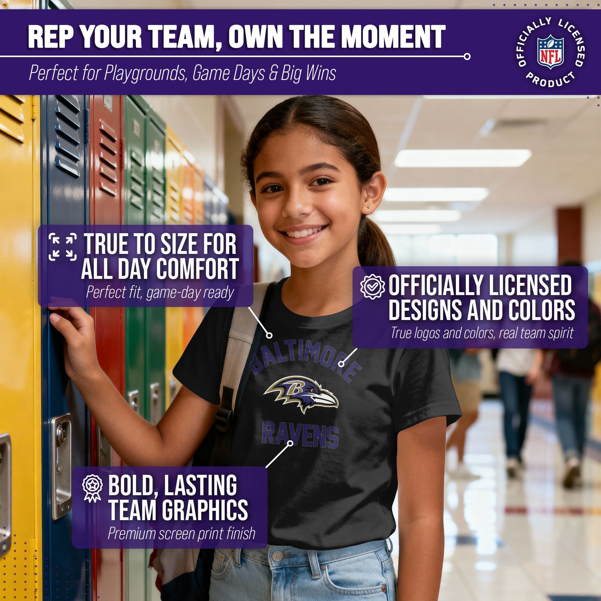 There's nothing more exciting than a much-anticipated gameday. Our Youth Gameday Baltimore Ravens football tshirt is the ideal shirt to wear on gameday whether you're at the game, or watching from the comfort of your own home. This Baltimore tshirt is super comfortable, runs true to size, and is great for showing team pride all year long! The semi-fitted style makes this the perfect Ravens youth shirt for both boys and girls. Our shirts really are the perfect fan apparel for school and sports games. The youth gameday shirt is lightweight and ideal for warmer weather or as an extra layer during colder months. Our Ravens shirts for boys and girls are essential apparel for young football fans. Our tagless Baltimore Ravens youth shirt ensures the most comfortable fit. This semi-fitted tshirt is made from a 50/50 cotton/polyester blend; contrast shoulder to shoulder neck tape and 1x1 rib knit neck makes for comfortable fit around the neck and shoulders. This high quality shirt for kids features a double-needle sleeve and bottom hems. These are high quality Ravens graphic shirts for girls and boys. The vivid graphics will stay crisp wear after wear, and year after year. The thermal printed graphics are high definition, official true team colors, and also resist fading. This Baltimore tshirt is made with high stitch density for smoother printing surface. Our official shirts for boys and girls make the best gifts. This piece of Baltimore Ravens apparel is the perfect birthday or Christmas gift for any young football fan. This tee is absolutely perfect for school, stadium fun, or watching the game at home.