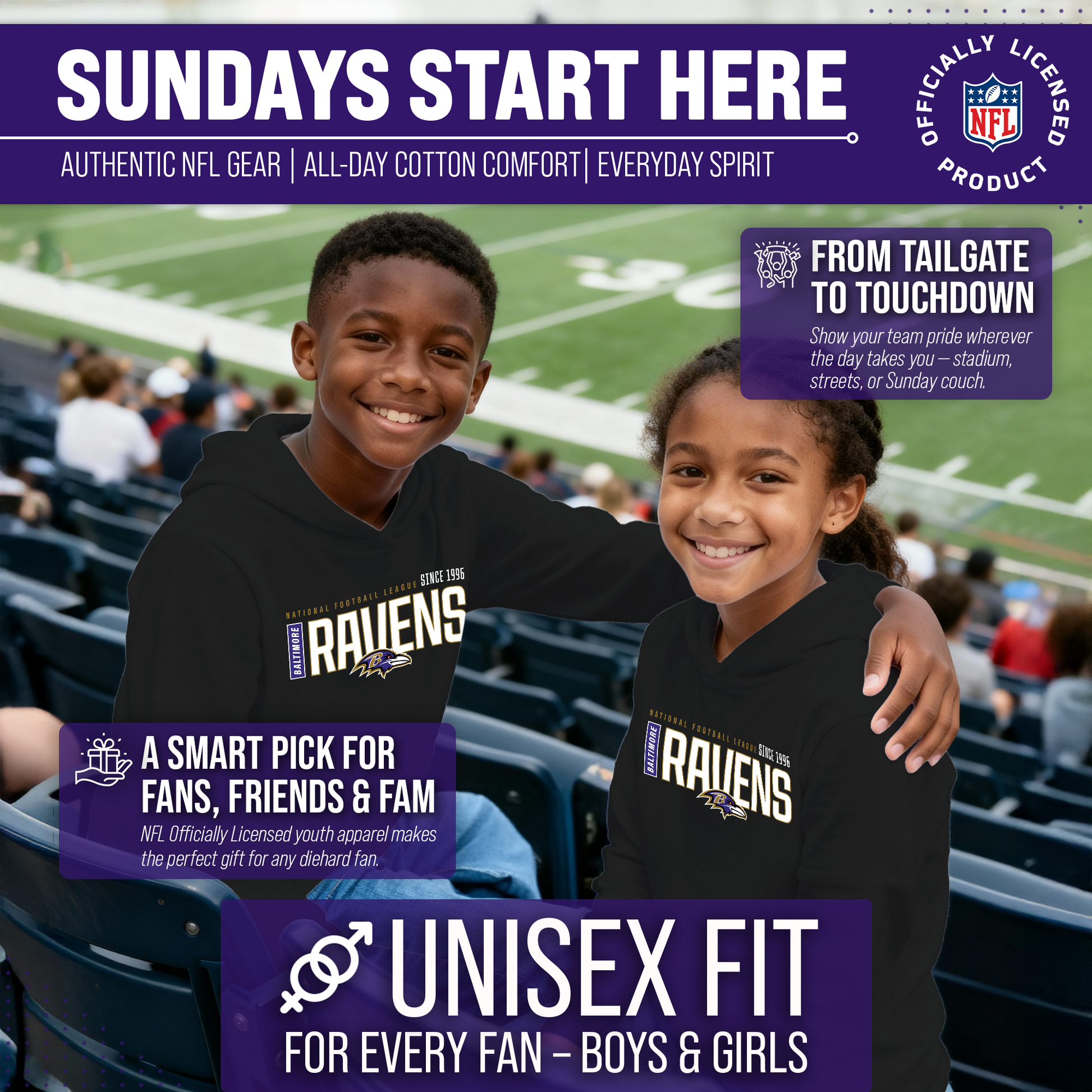 Hey there, young sports fans! Get ready to show off your team spirit with the Team Fan Apparel Baltimore Ravens Youth Modern Endzone Football Fleece Hooded Sweatshirt! Made from a soft and cozy cotton polyester fleece, this sweatshirt is perfect for staying warm on game day or any day. The unisex design makes it suitable for both boys and girls, and its tag-less feature ensures ultimate comfort all day long. Featuring an original modern endzone design that proudly displays your team's colors and logos, this youth hoodie will be turning heads everywhere it's worn. The front pouch pocket and fleece hood will keep you warm on those cold game days as you cheer on your Ravens! Just pull it on and go! So whether you're at the stadium or hanging out with friends, make sure you're representing your team in style with our NFL youth apparel. Printed and designed in the USA, have confidence your sweatshirt will last! Order now and get your future pro geared up to be the next super fan!